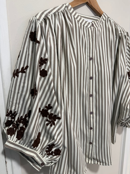 Brown and Cream Striped Shirt with Embroidery Detail on Sleeve