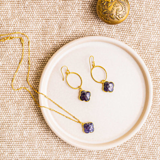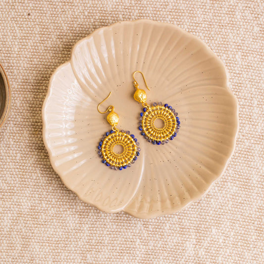 Cairo Beaded Sunburst Charm Statement Earrings - Navy Iolite and Lapis Lazuli beads