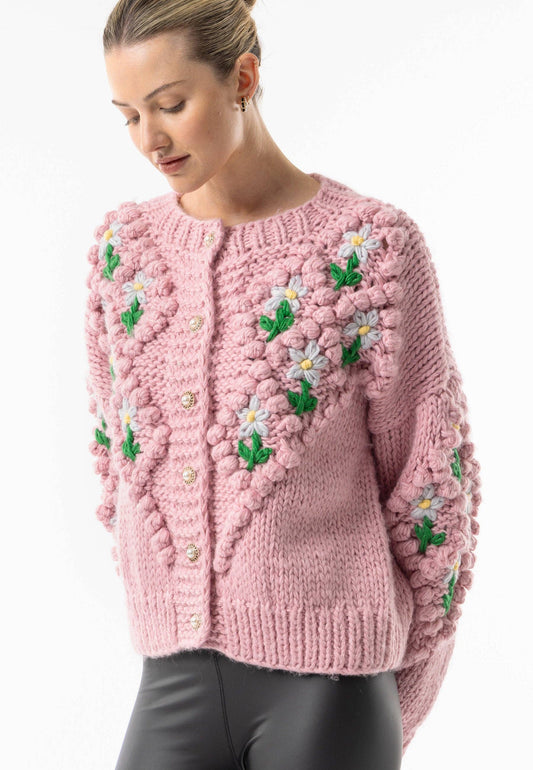 Pink Chunky Floral Knit Cardigan