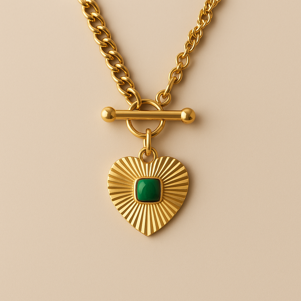 18k Gold Plated Heart T Bar Pendant Green Agate Necklace