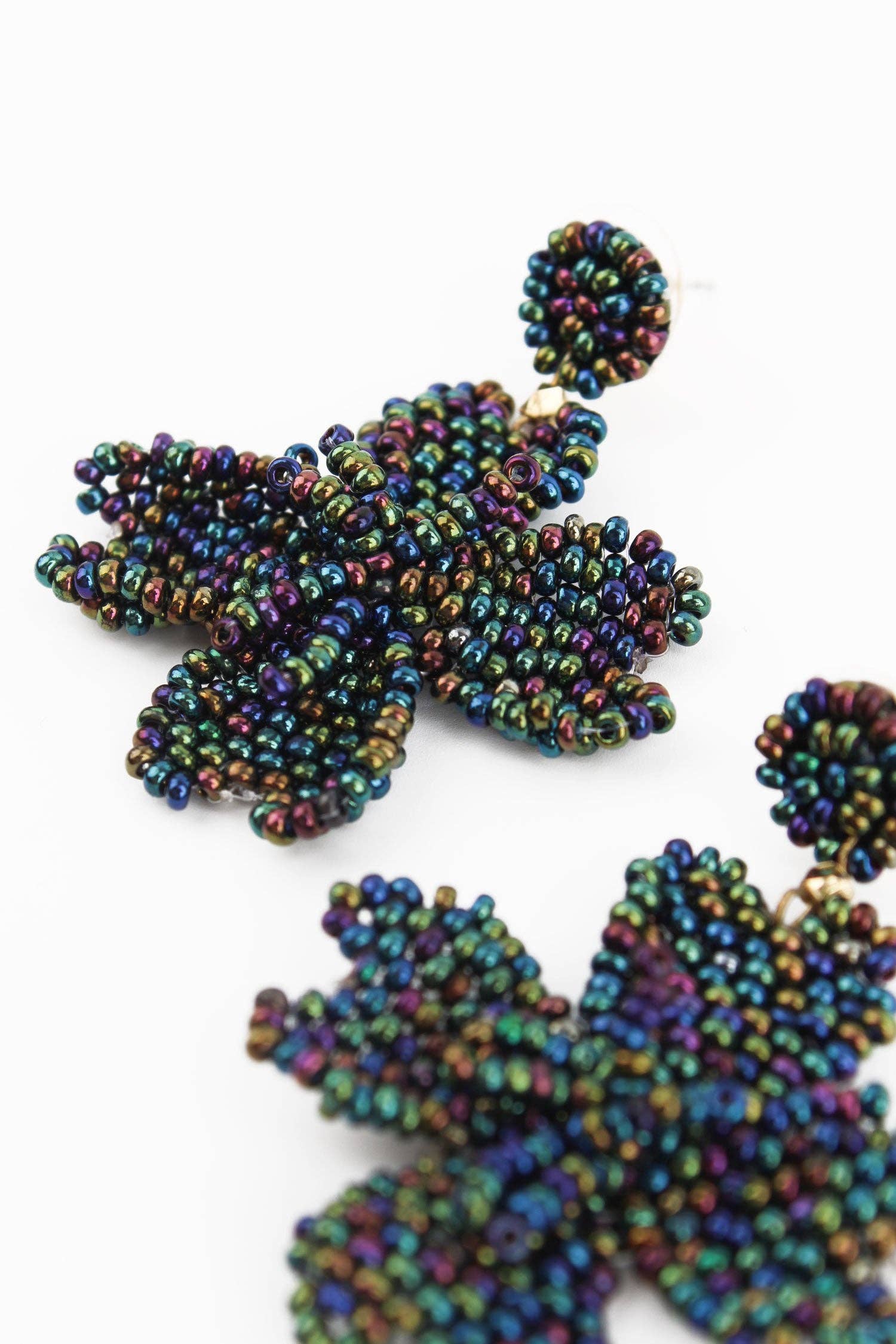 Made with intricate 3D beading, these beautiful petrol flower earrings are the perfect statement for Autumn/Winter.