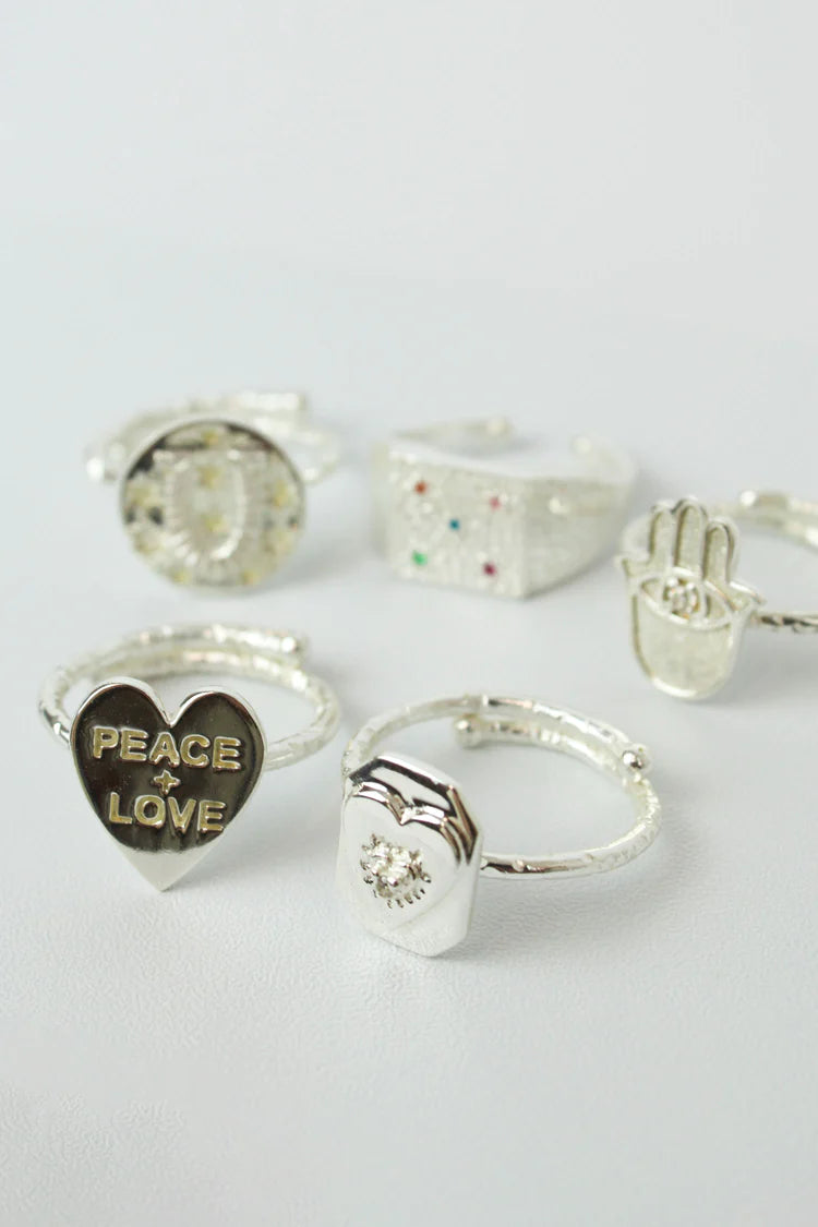 10 adjustable silver rings with detailed motifs, including a lucky horseshoe, tarot card, multi gem constellation, hamza hand & 'peace and love' slogan.