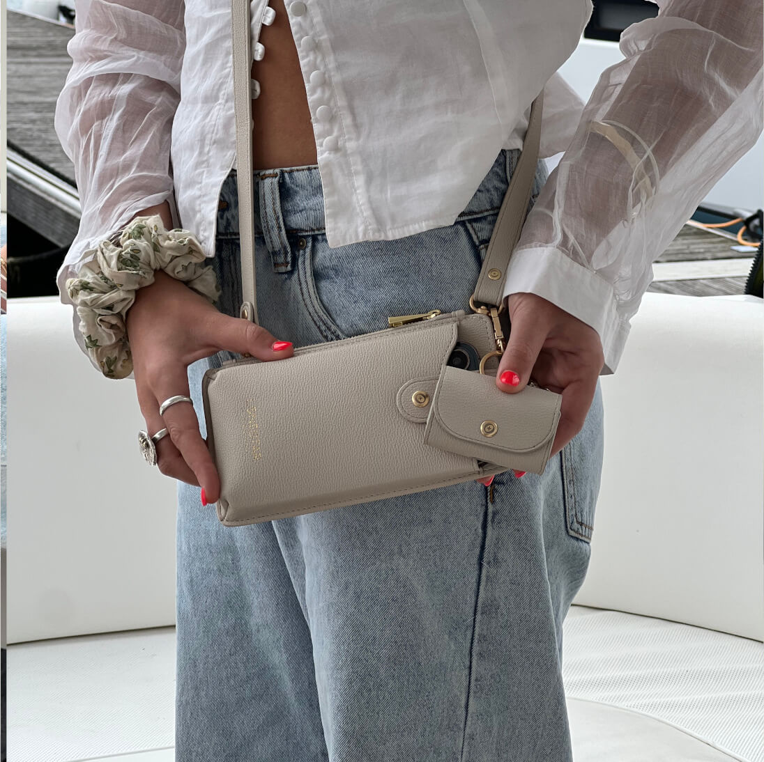 Ideal for keeping your AirPods easily accessible and safe, a stylish feature with a functional purpose. No more rummaging in bags and pockets, simply attach to your phone bag or case when you wish to take your AirPods with you. Available in stone and black and three different sizes.