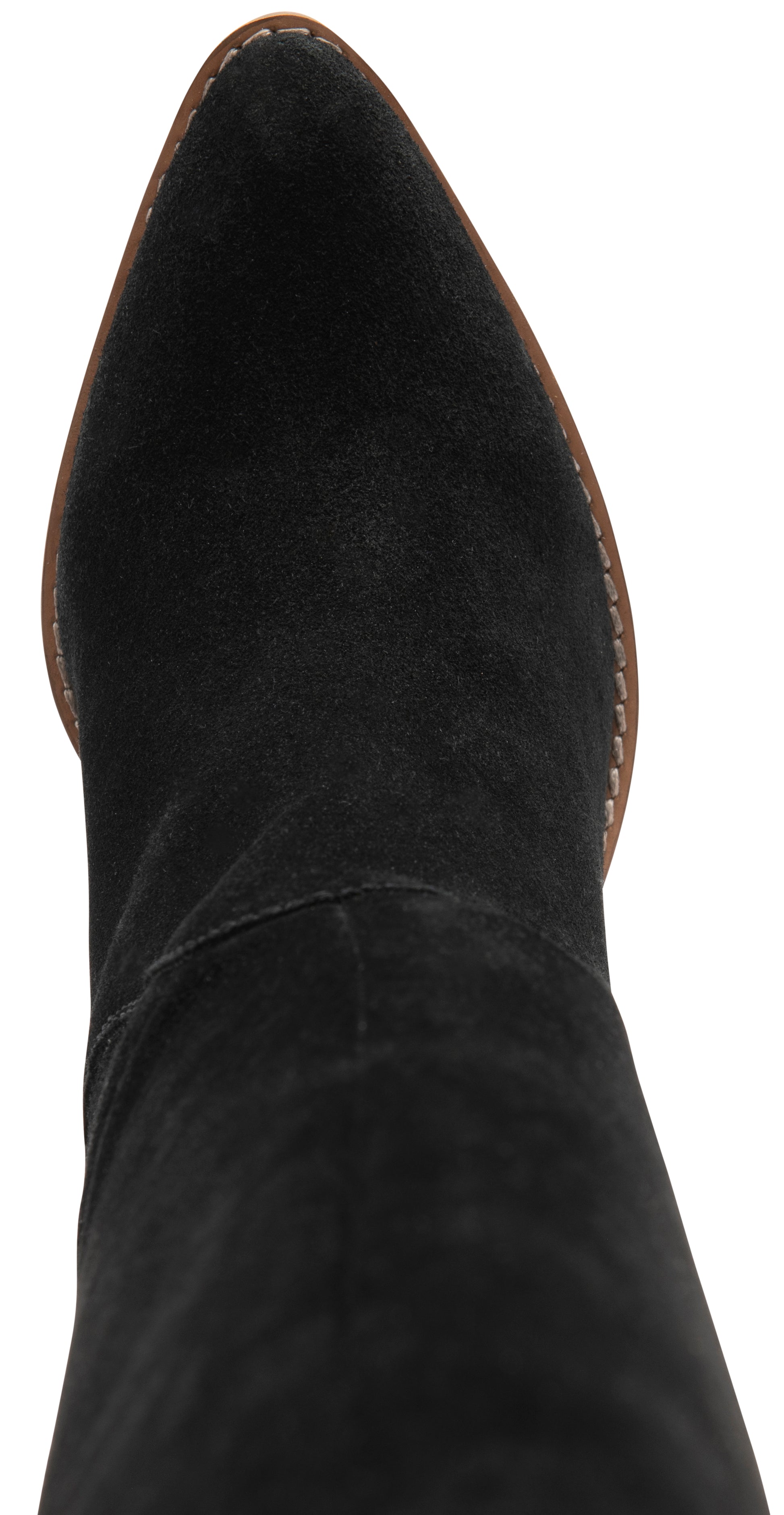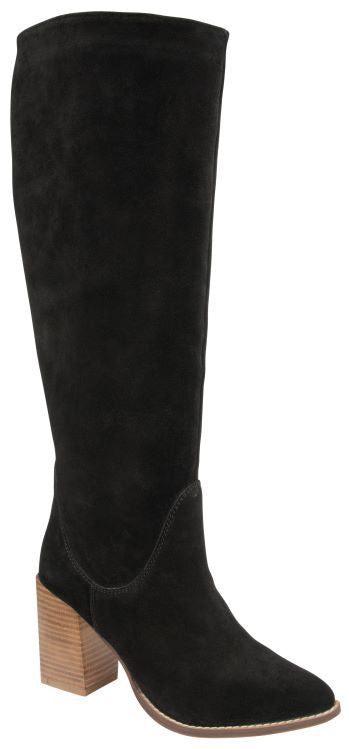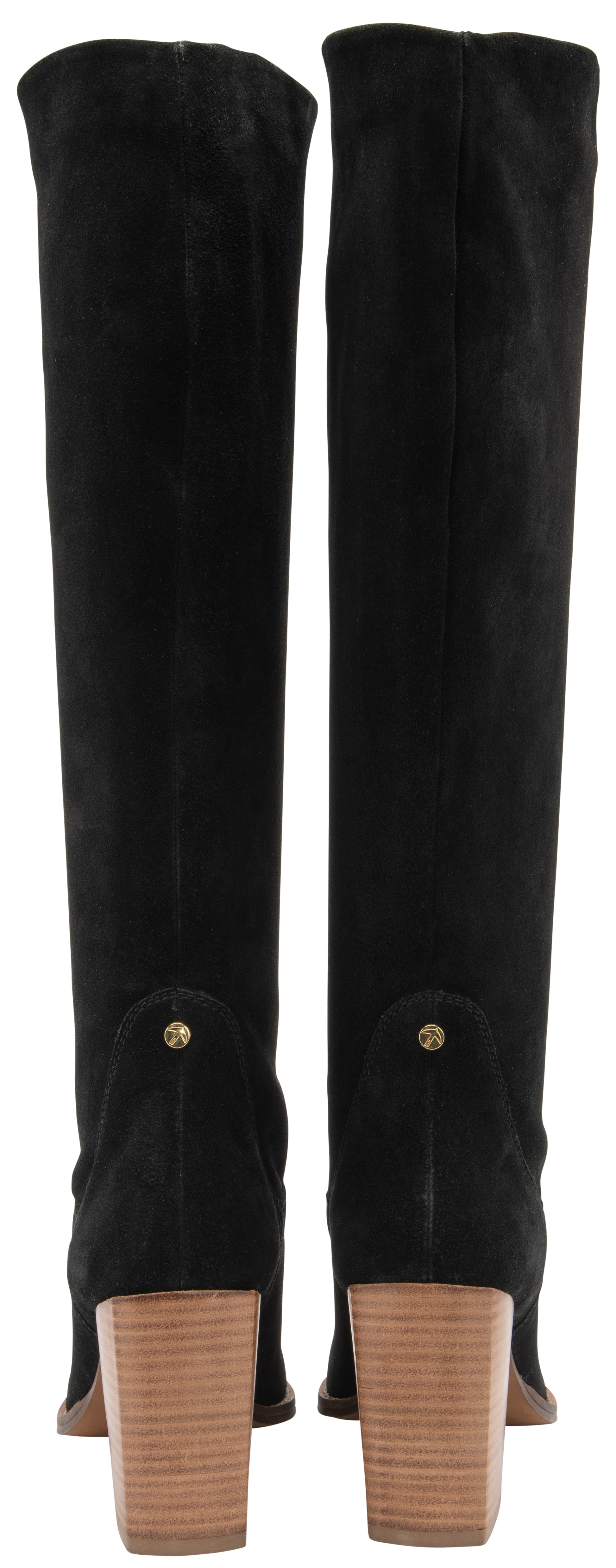 Top off any winter look with this staple knee-high boot from Ravel. Crafted with a black suede upper, this is a 70s inspired style also features an 8.5cm wooden stacked heel and an almond pointed toe. Team Lumsden with a trench coat, denim skirt and chunky jumper for a cosy and stylish look.