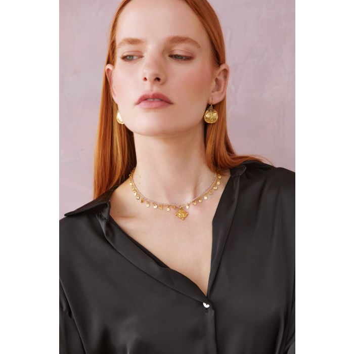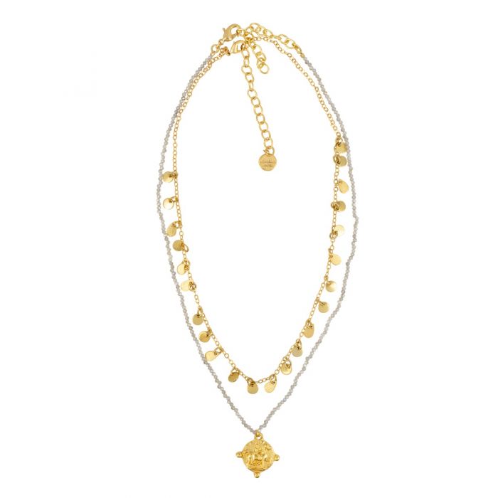 Set of 2 short necklaces, mini gemstone beads with gold antique horse coin and gold petals.