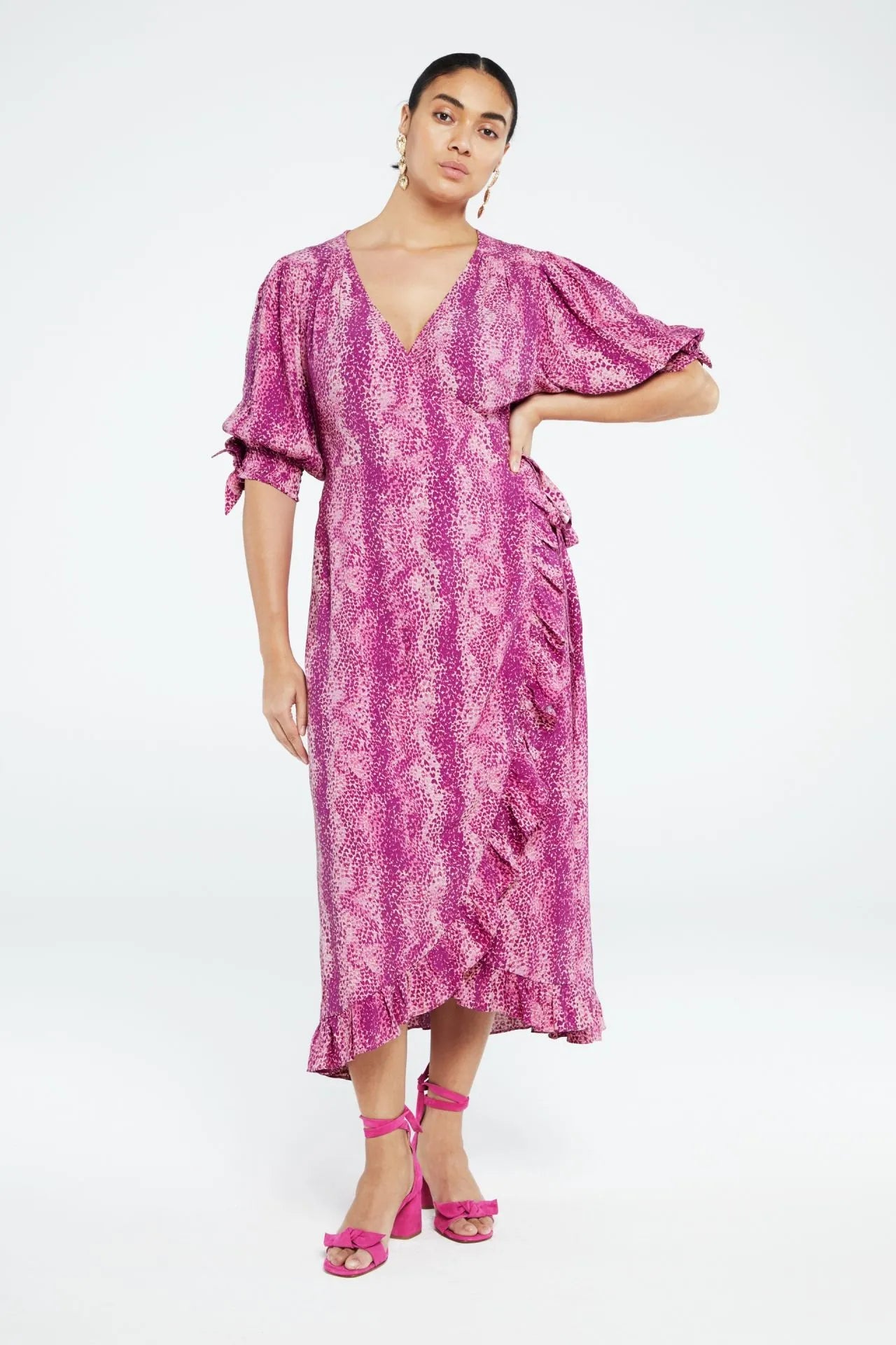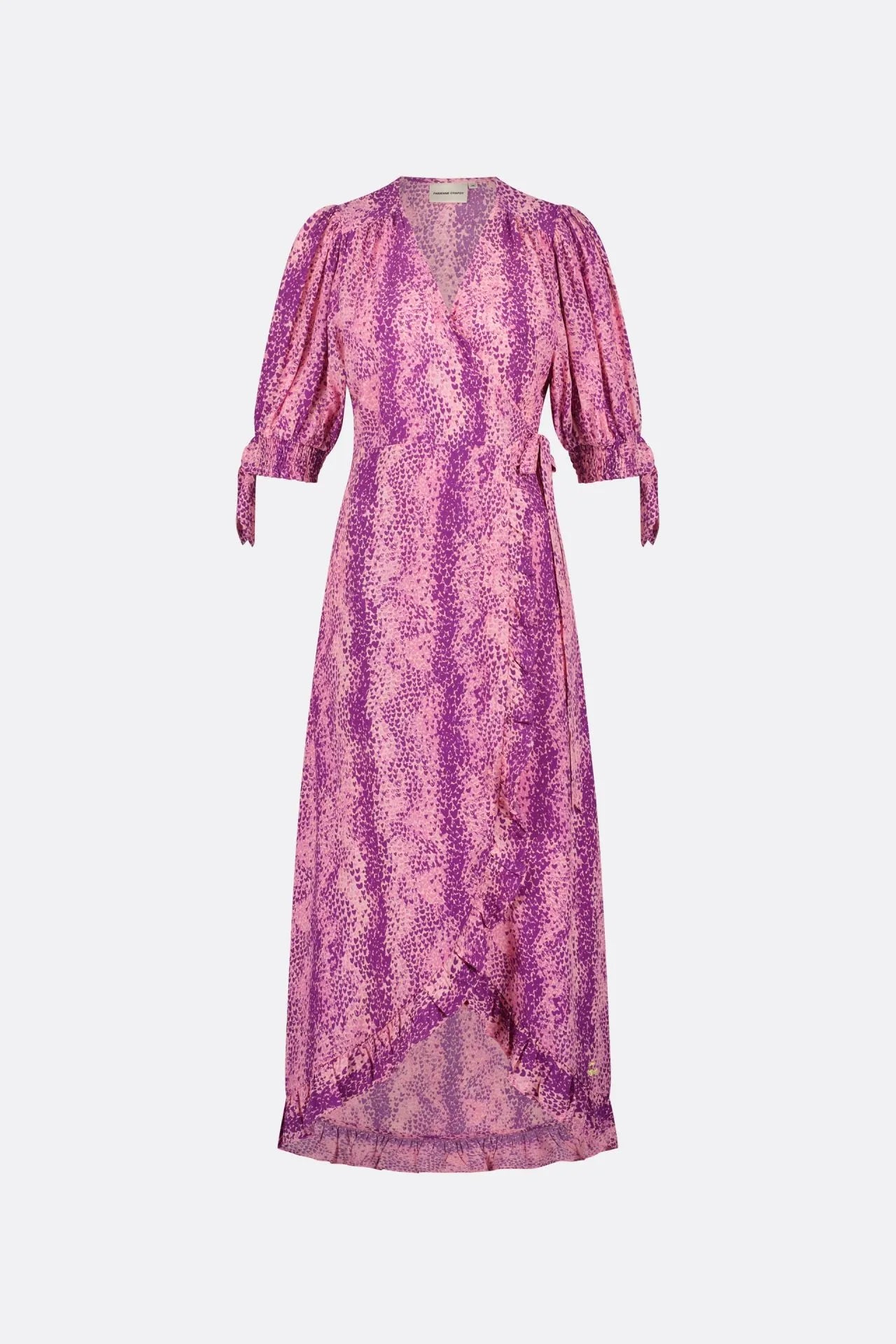Shawl dress with ruffles, three-quarter length sleeves and elastic cuffs with bow. Channa Dress has a V-neckline with snap button and an all over Sweet Snake print. This item is made of 54% LENZING™ ECOVERO™ Viscose: breezy, supple and conscious. LENZING™ and ECOVERO™ are trademarks of Lenzing.