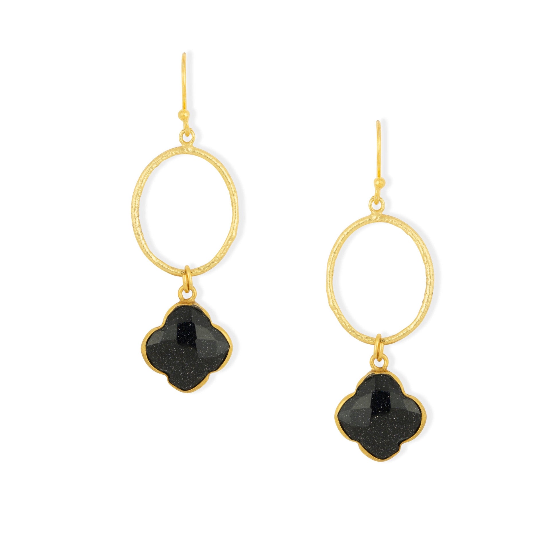 These gold hoop earrings feature a clover-shaped Navy Sunstone gemstone drop, showcasing a shimmering deep navy hue. Their refined design exudes elegance and sophistication.