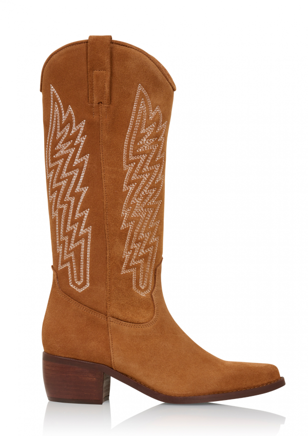The suede western boot in the colour cognac has flamed details, a small zipper on the inside and a nice fit.