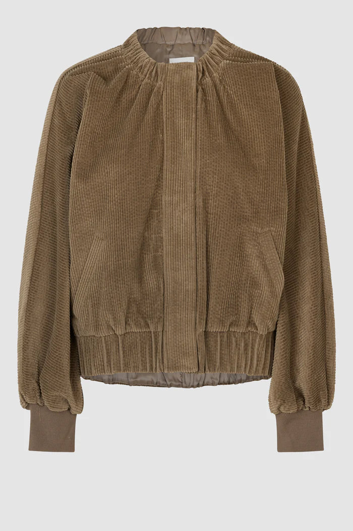 Second Female jacket in soft 100% cotton corduroy. The jacket long bat sleeves with elastic cuffs, as well as elasticated casing along neck and bottom. At the front there are pockets and a button and zipper closure with placket on top.Â