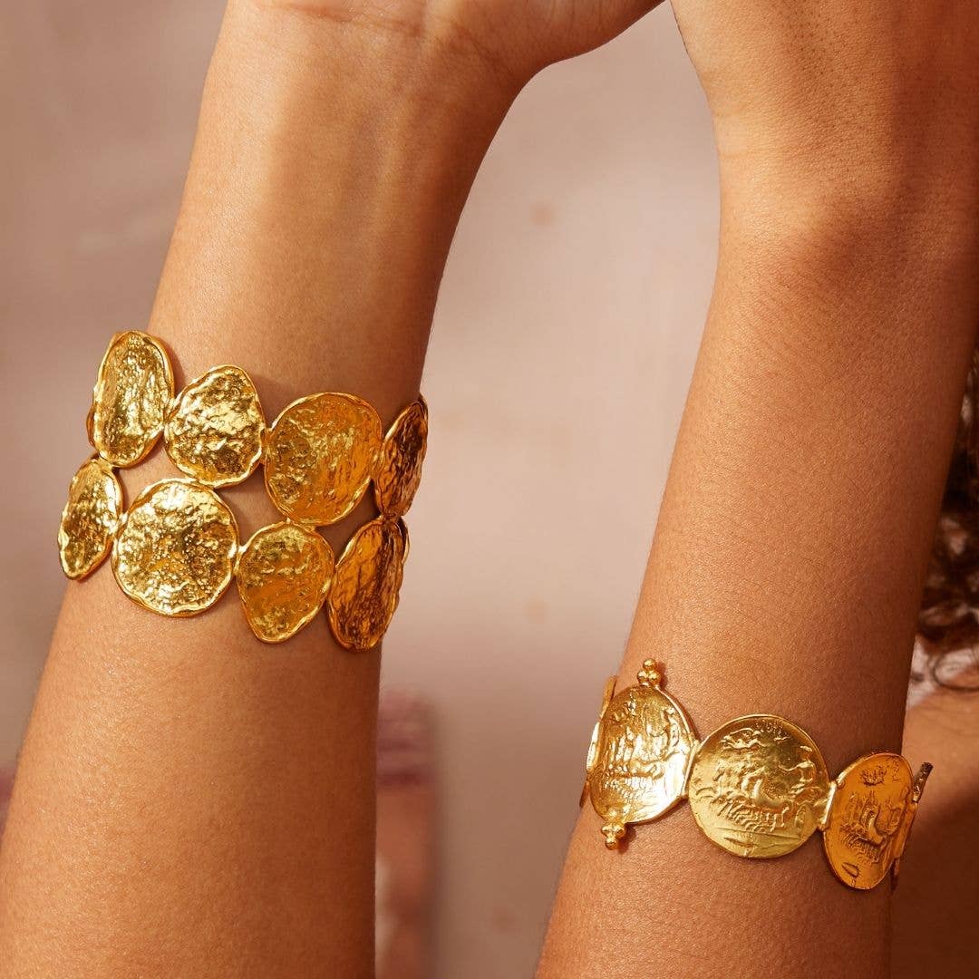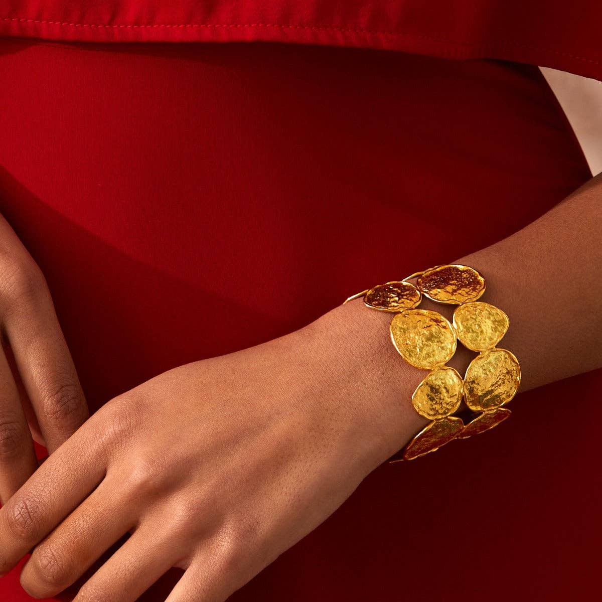 The is the the bracelet to make an impact! This cuff features two rows of molten effect coins that wrap elegantly around the wrist to make a bold statement. Stunning in its simplicity this is a must have piece for your wardrobe.
