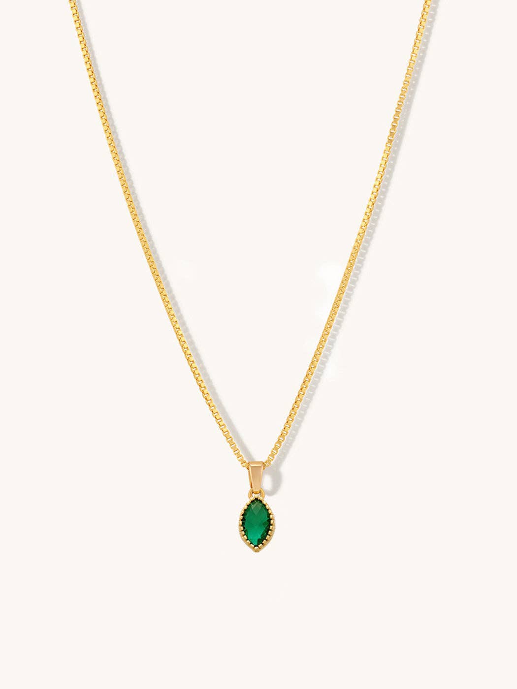 Add some green glimmer to your chain stack with this minimal emerald drop charm on delicate box chain. Just enough colour to brighten your day.