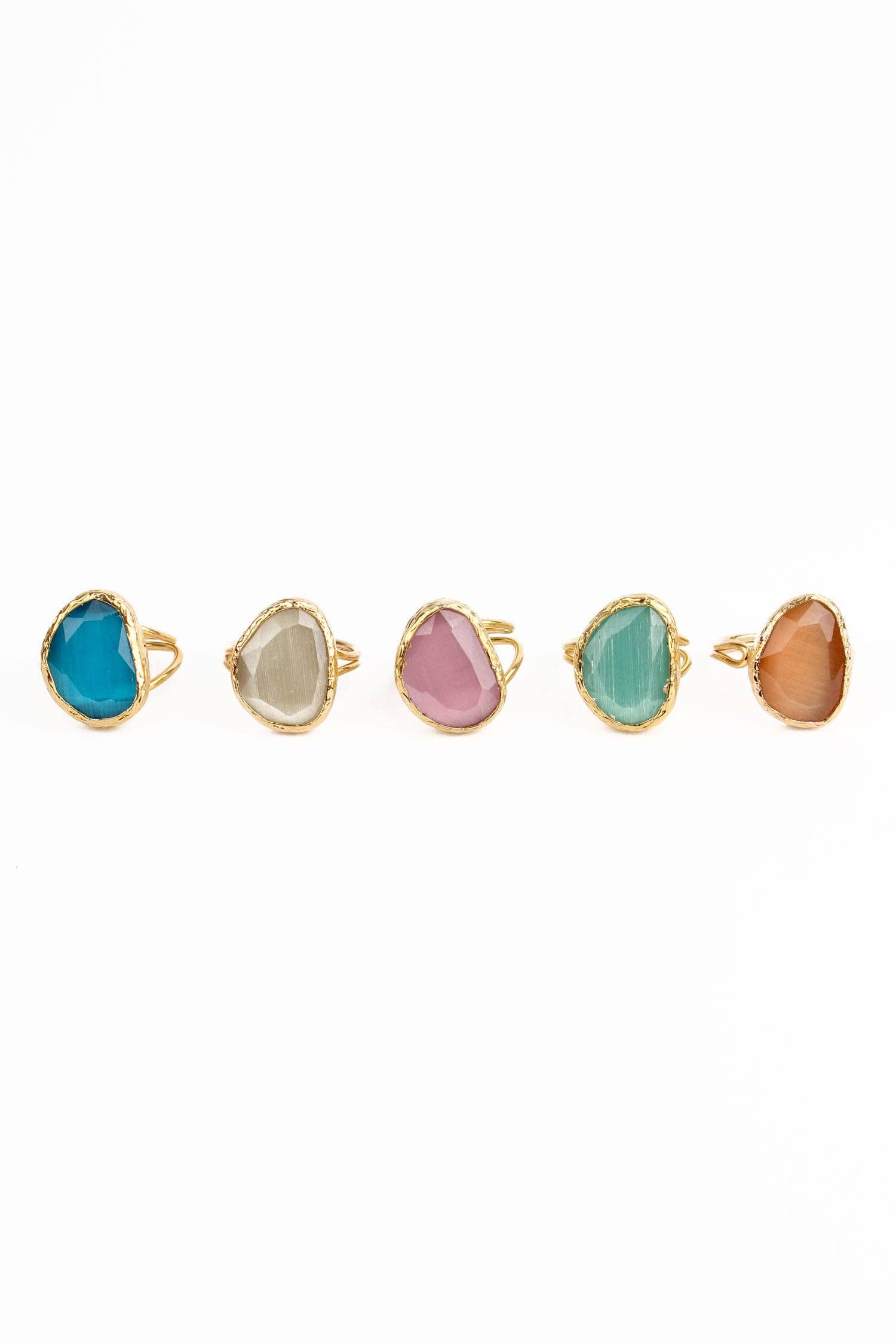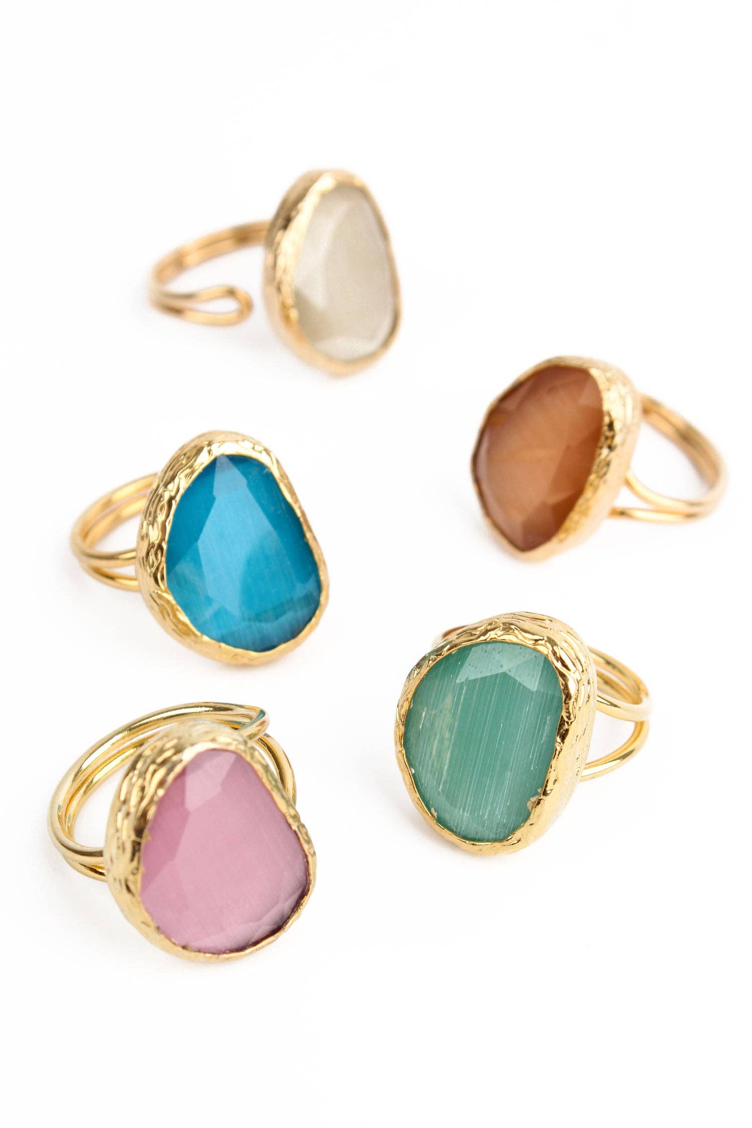 These 5 rings are made from stunning facet glass in fresh, vibrant colours perfect for spring. With an adjustable fit, these cocktail rings bring both style and comfort to your wardrobe. Handmade in Turkey by talented artisans. Adjustable 18ct gold plated rings featuring facet stones, approximate size 20mm long x 16mm wide.