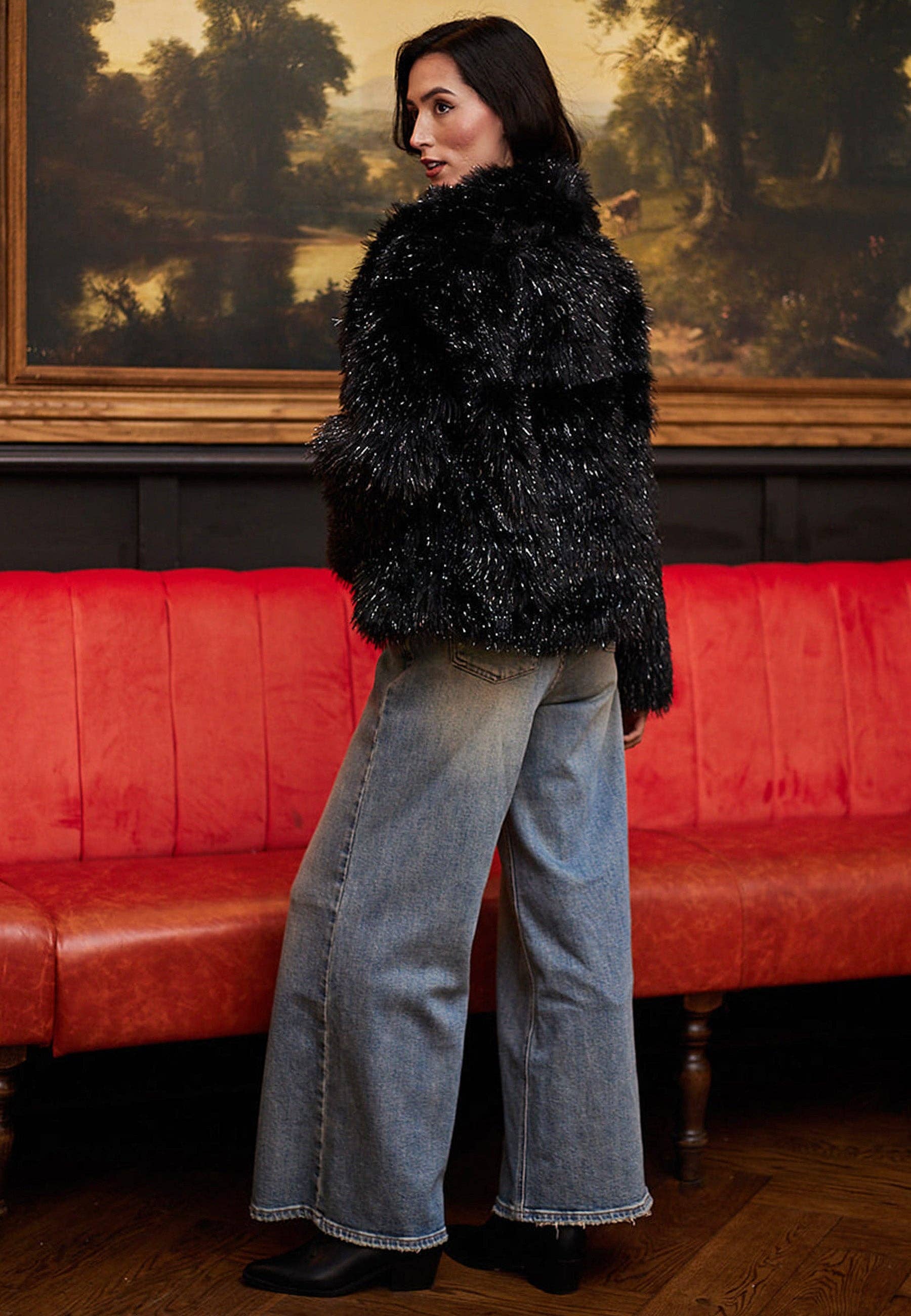 Keep warm in the Faux Fur Glittery Short Coat in Black by ANGELEYE. Made from a sumptuous fluffy-blend ultra-soft faux fur with practical, invisible clasps. This timeless shape will live in your closet forever for stylish weather shielding. This style has added glamour with glittery thread detail, perfect for party season! Layer over everything for an instantly elegant look, especially for occasions or special events.