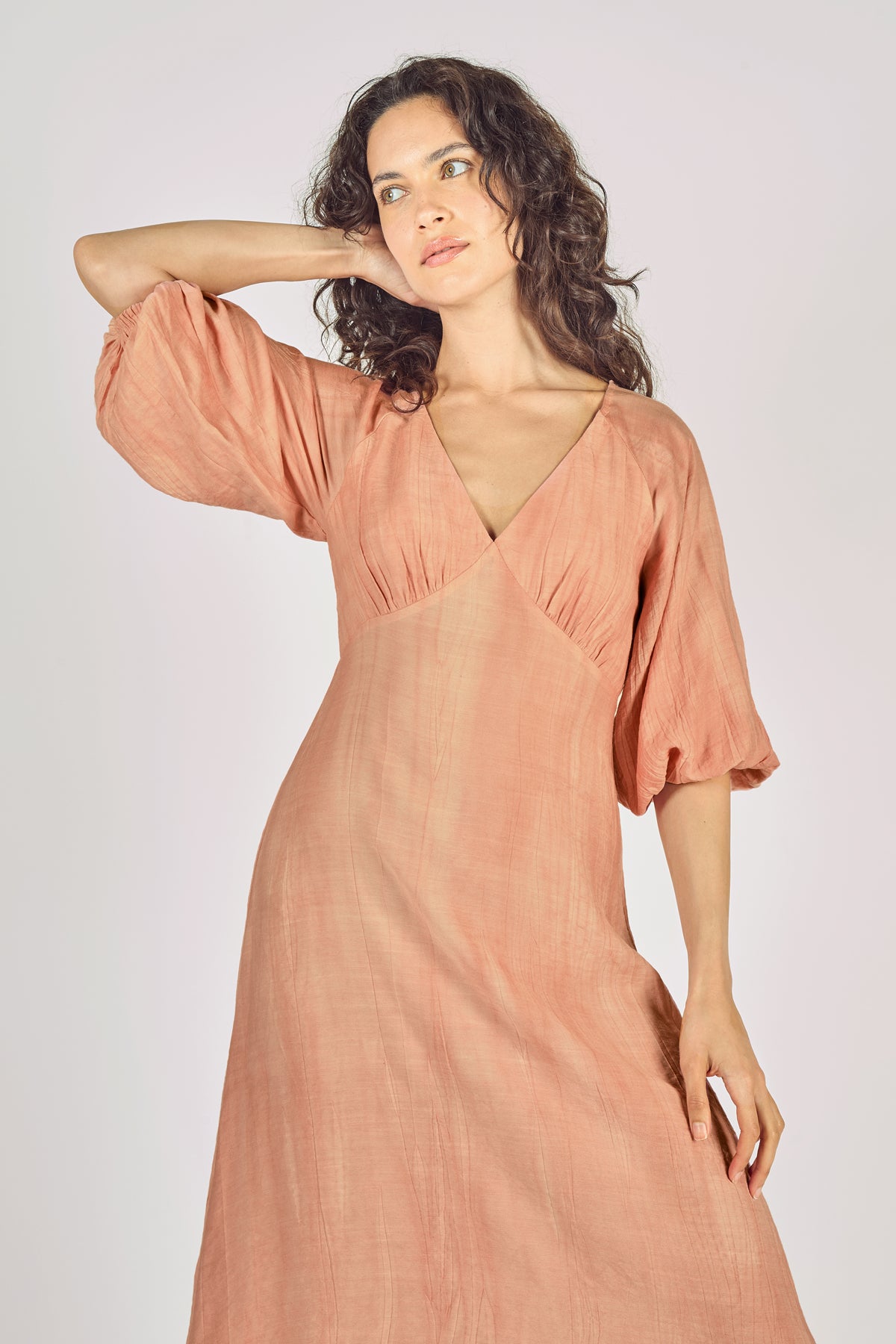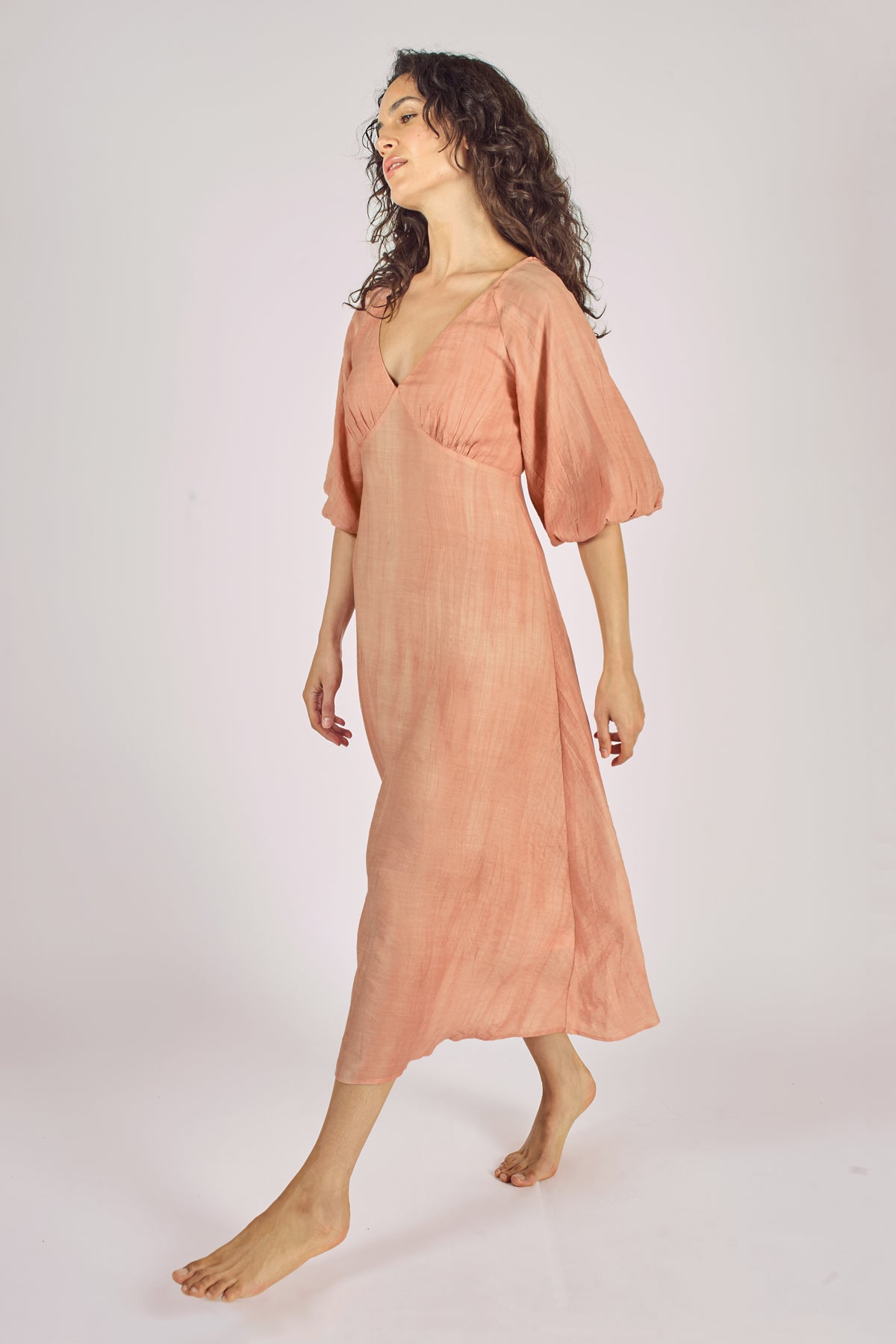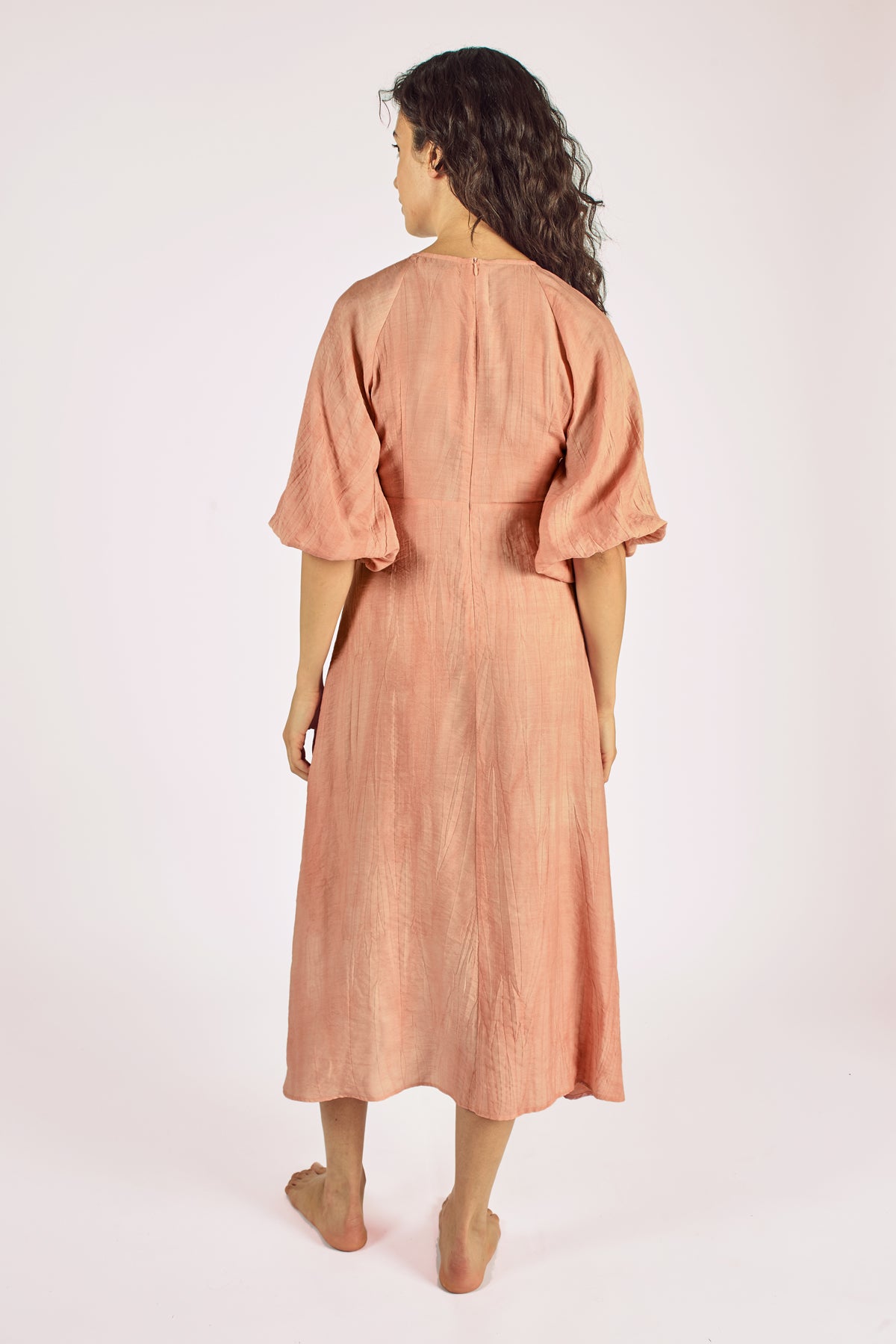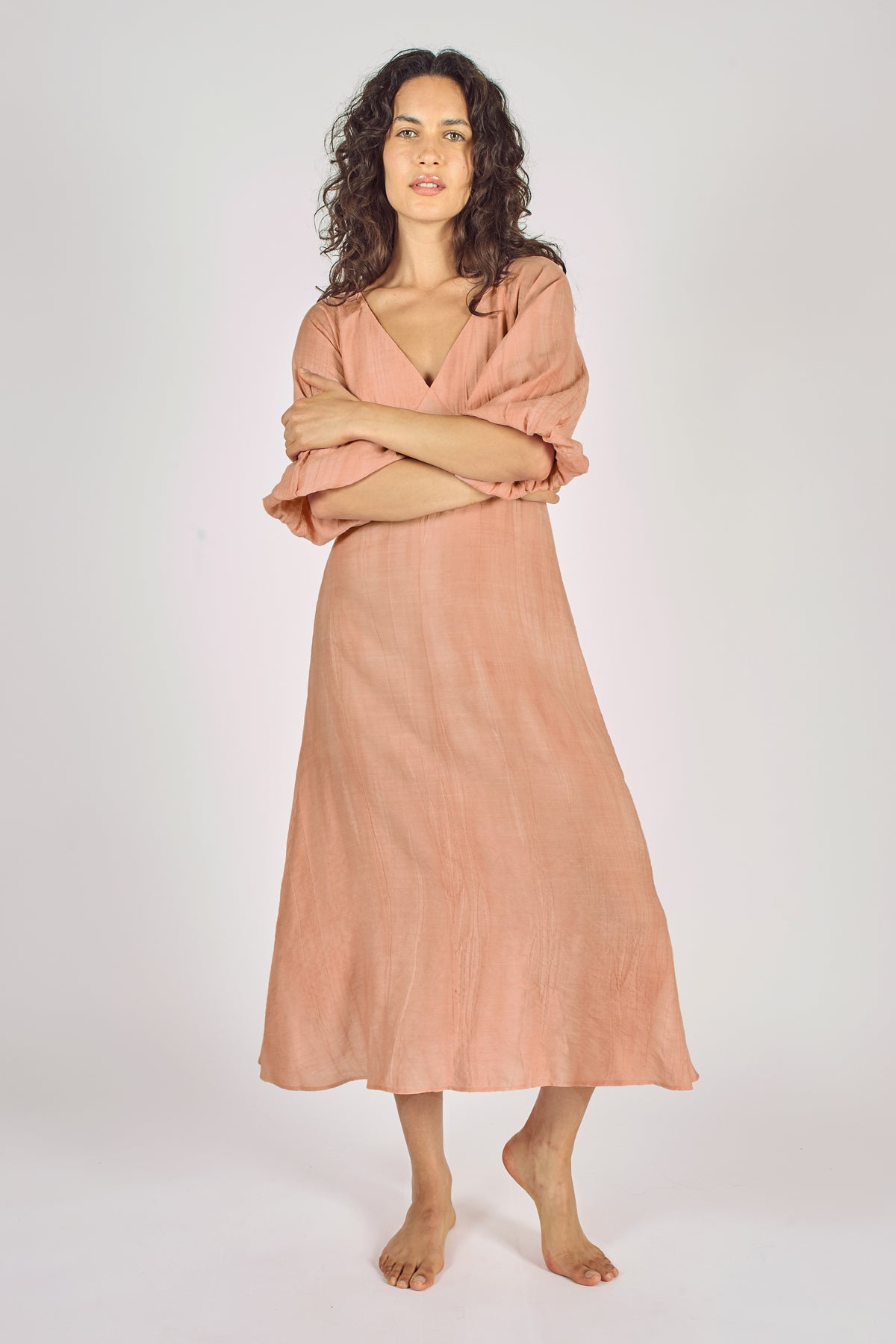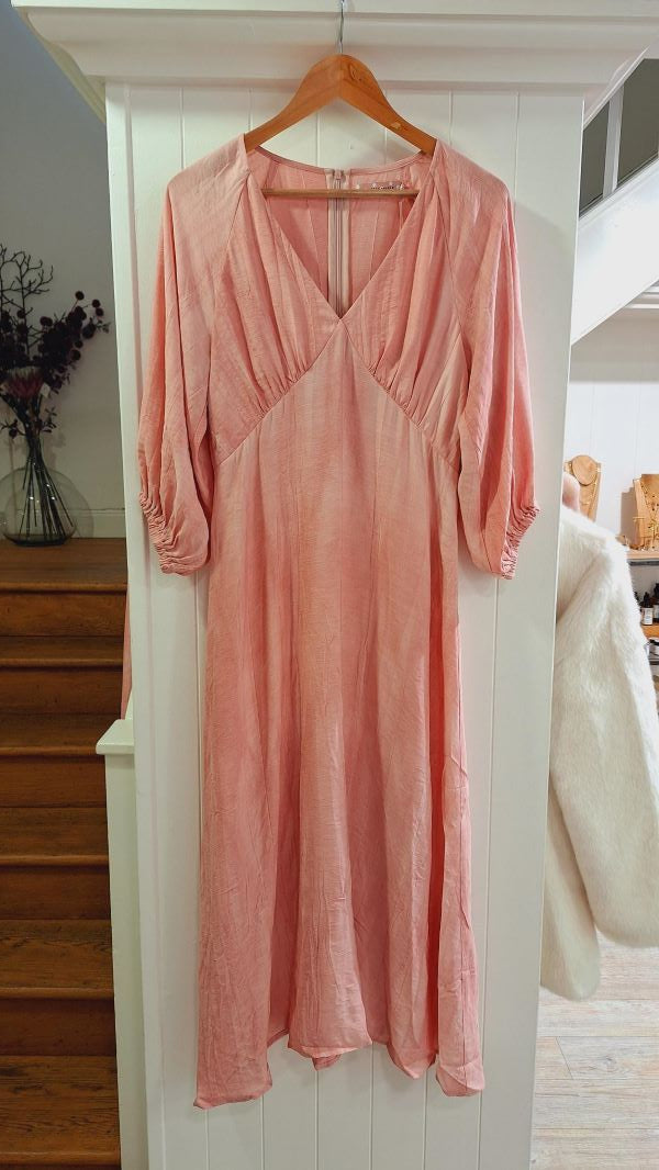 The Gloria is back and looks gorgeous in distressed pink cotton. A stunning midi dress with a deep V-neck, gathering on the bust, beautiful 3/4 sleeves and elasticated cuffs. Keep it casual with some sandals, or dress it up with a pair of heels.