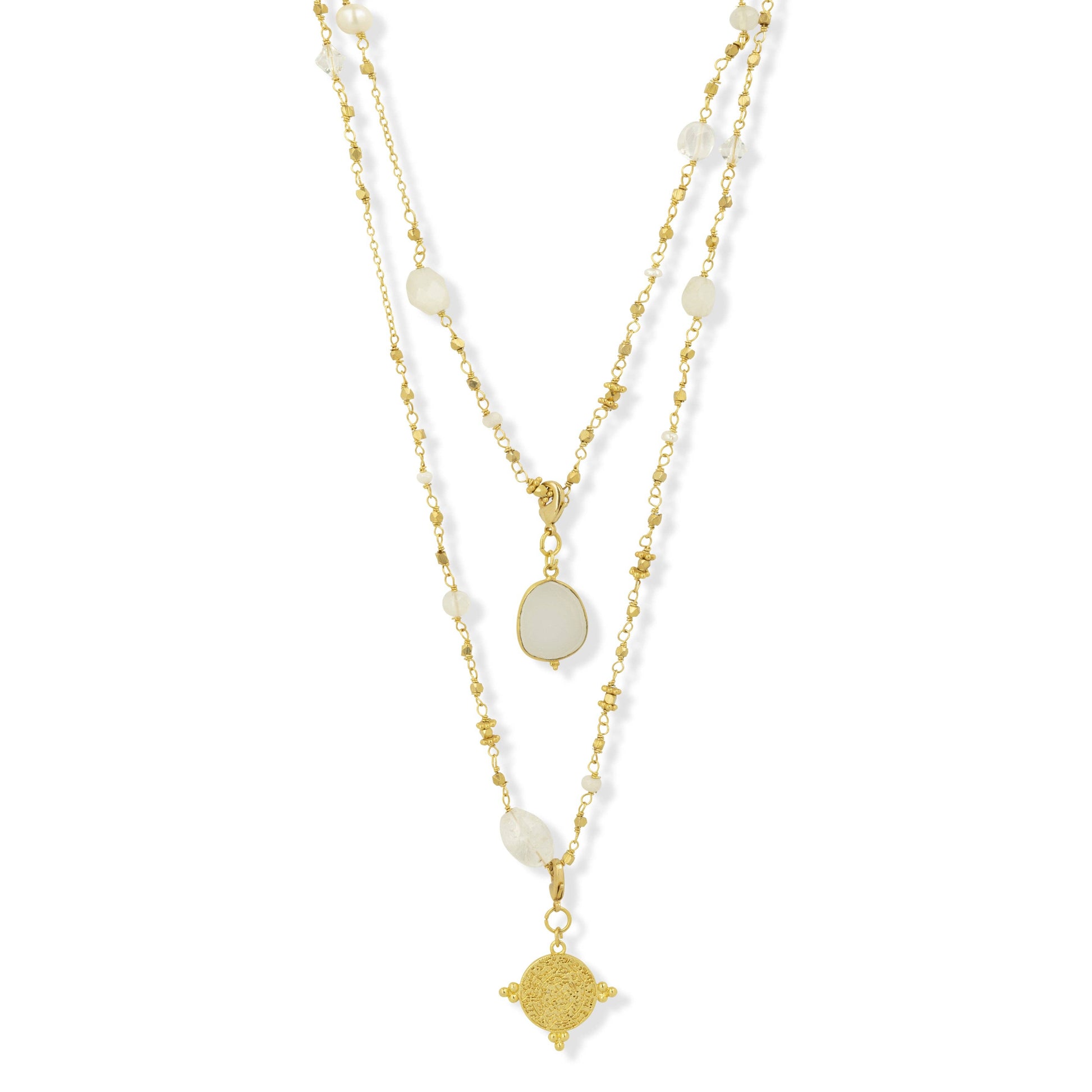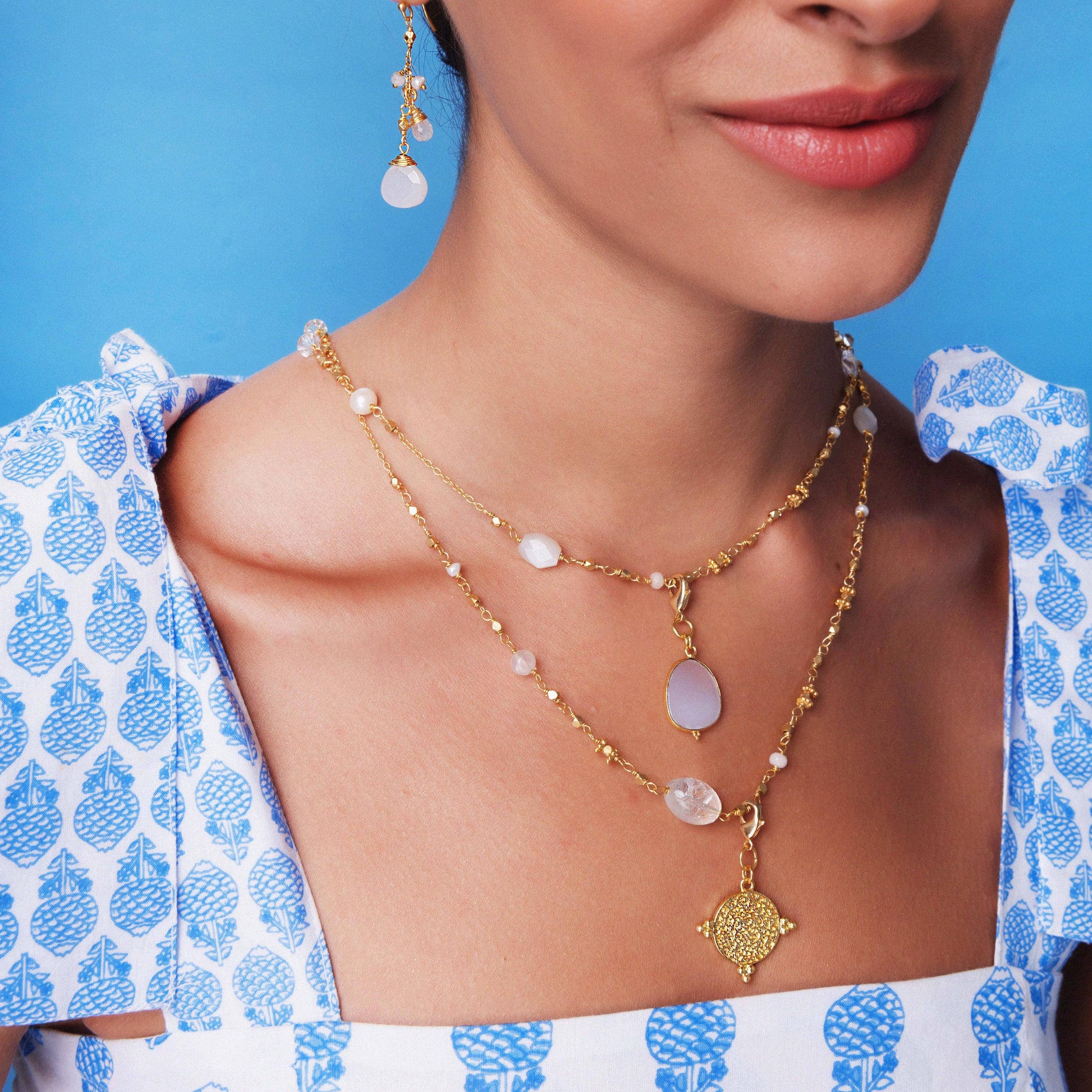 Multiway necklace with looped gemstones, coin and gemstone pendant A long gemstone looped necklace with a mix of moonstone, chalcedony, crystal and freshwater pearl. It has two detachable charms: a signature gold coin and white chalcedony set gemstone. The necklace can be worn long, or wrapped in a double layer. You can re-attach the charms the suit your style so they fall in the right place. A stunning addition to your jewellery collection.