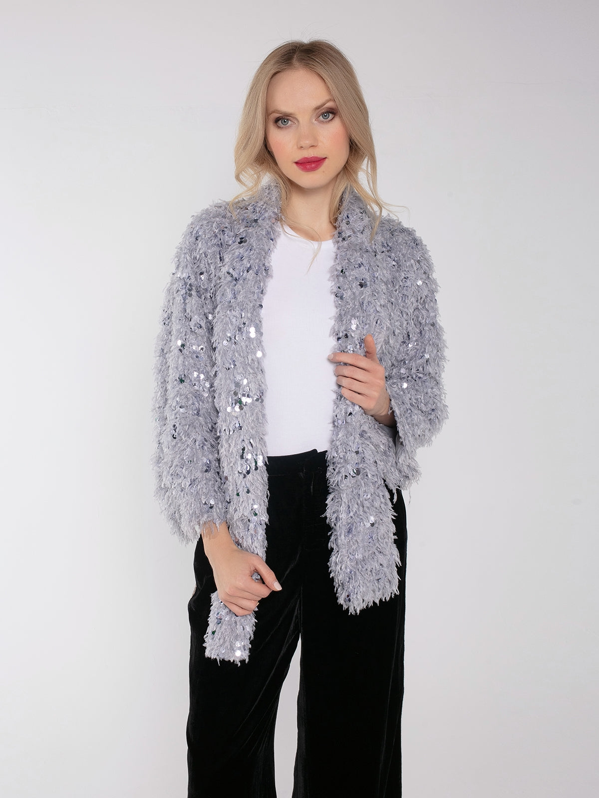 HARLOW SEQUIN AND FAUX FUR SCARF-GREY