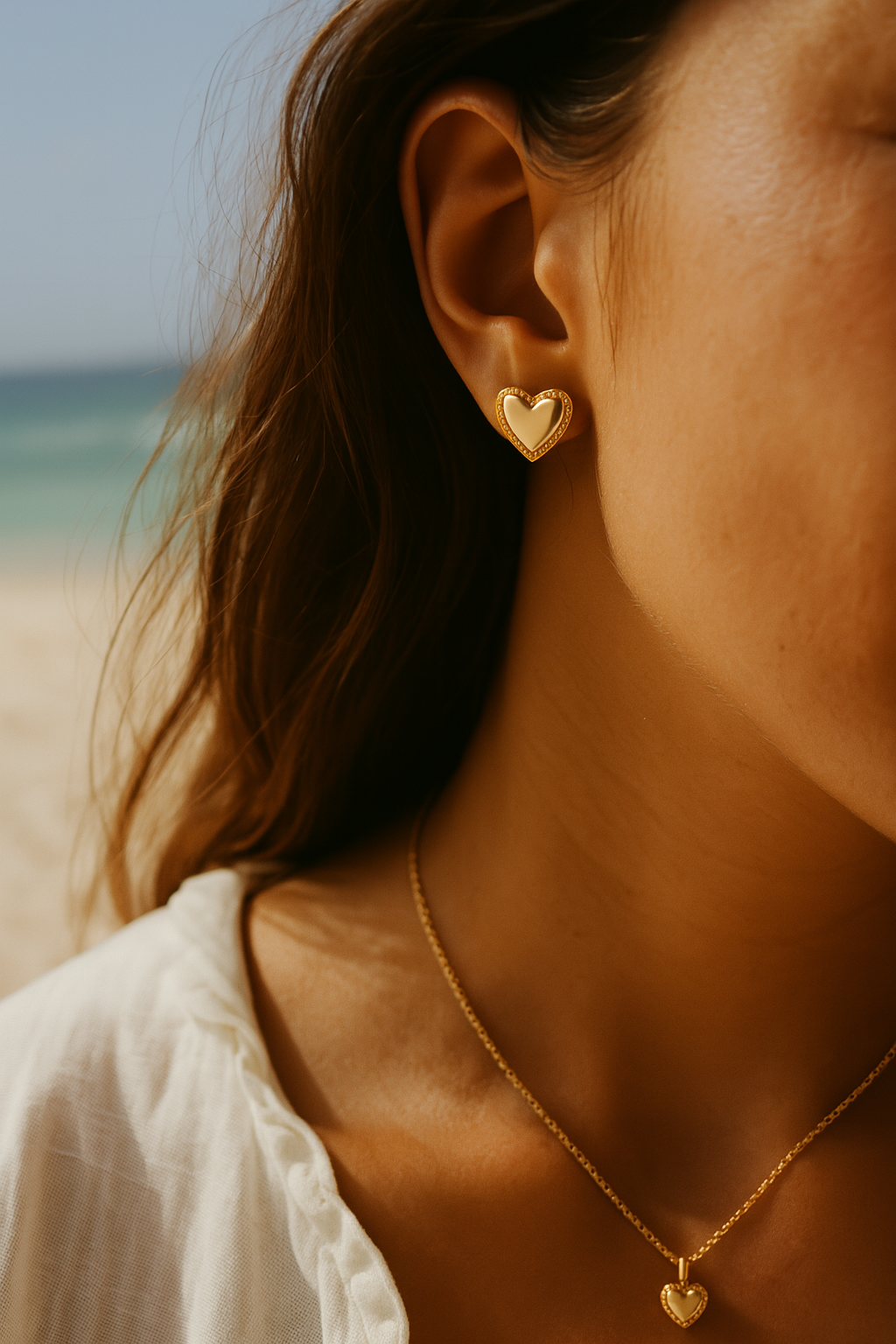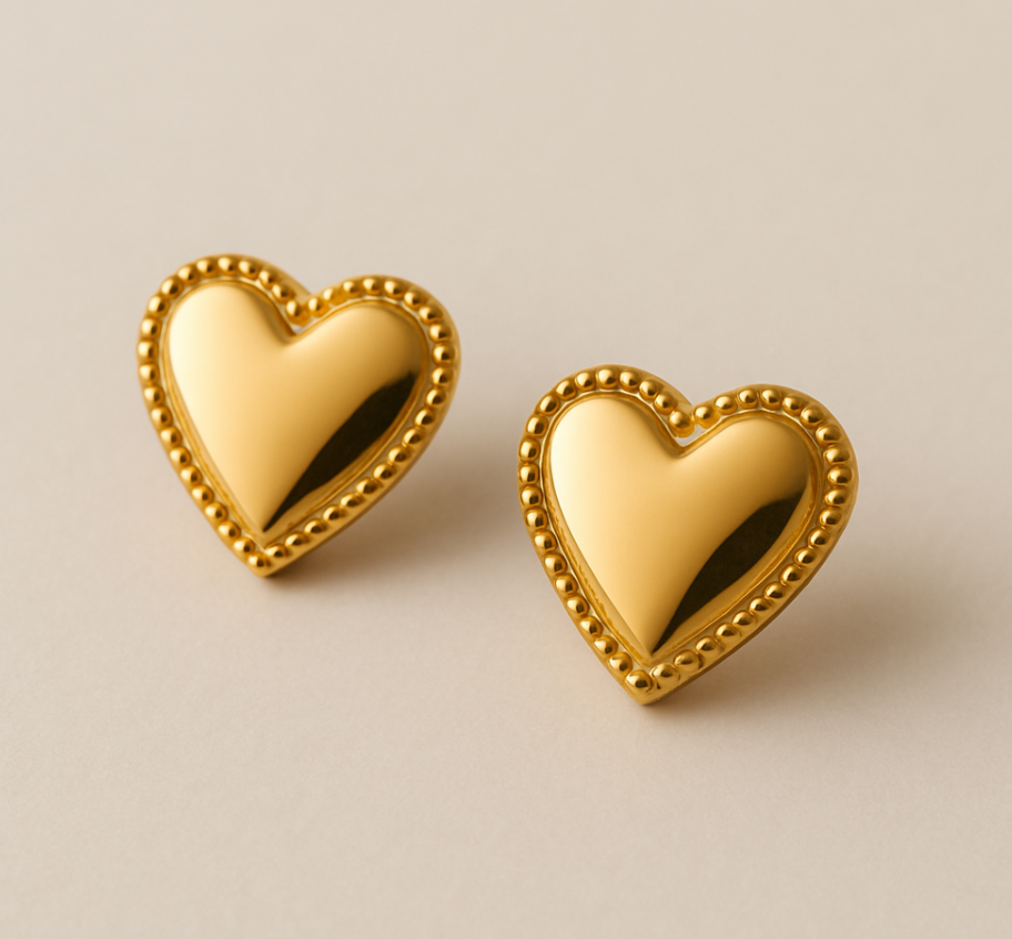 Small but statement-making. These heart stud earrings are gold-plated with a polished finish and detailed edge, offering a subtle touch of romance for everyday wear. Their clean, minimal silhouette makes them a go-to piece—perfect for first piercings, stacking, or gifting with meaning.
