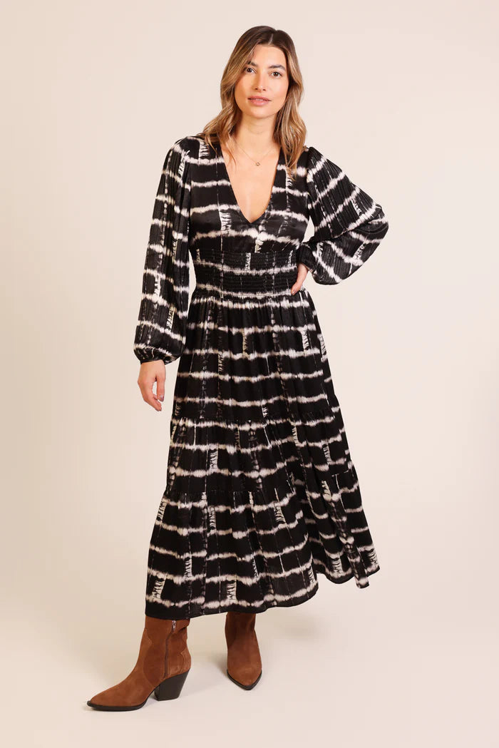 If you loved our Aurora dresses, you're sure to fall in love with the Whisper dress. A stunning long billow sleeved midi dress, with a flattering deep V neckline and a comfortable smocked waist that falls to a flowing tiered skirt. Effortlessly chic in this black and white stone wall print. Unlined.