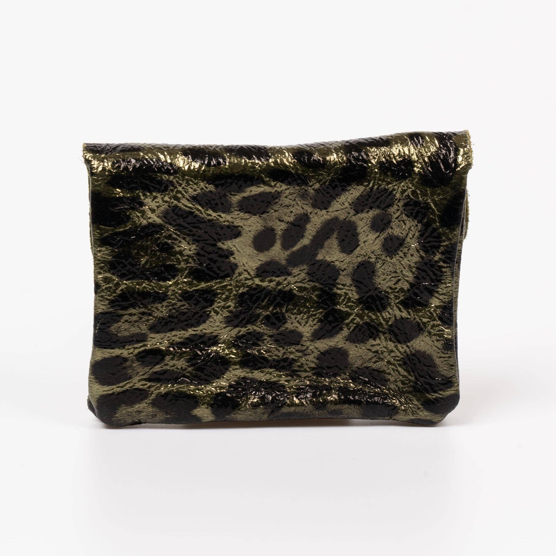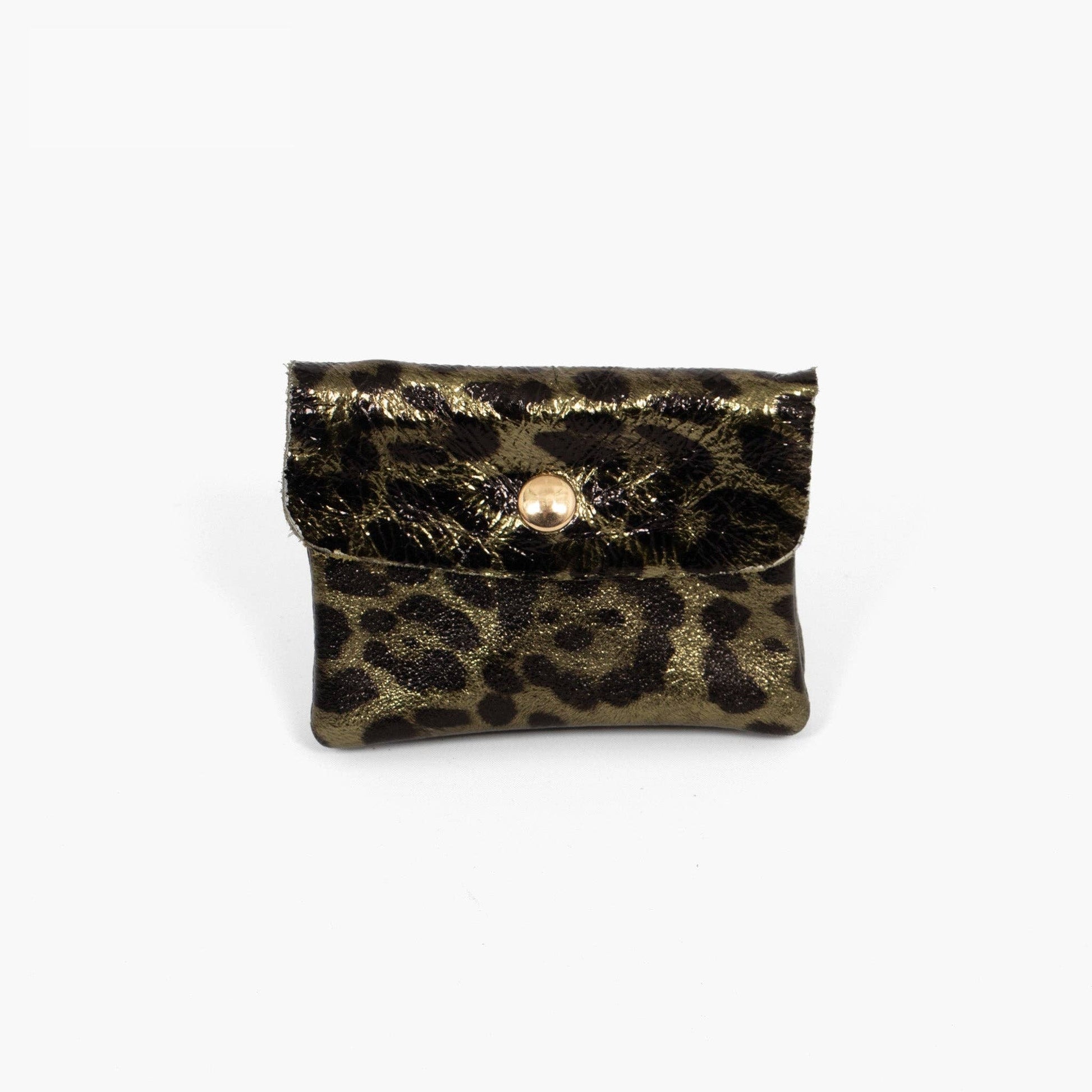 Italian Leather Coin Purse - Khaki Leopard Print, Metallic
