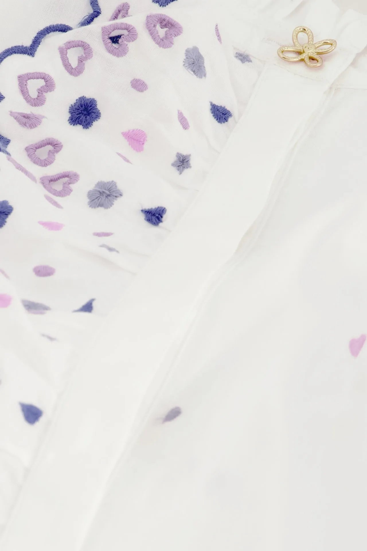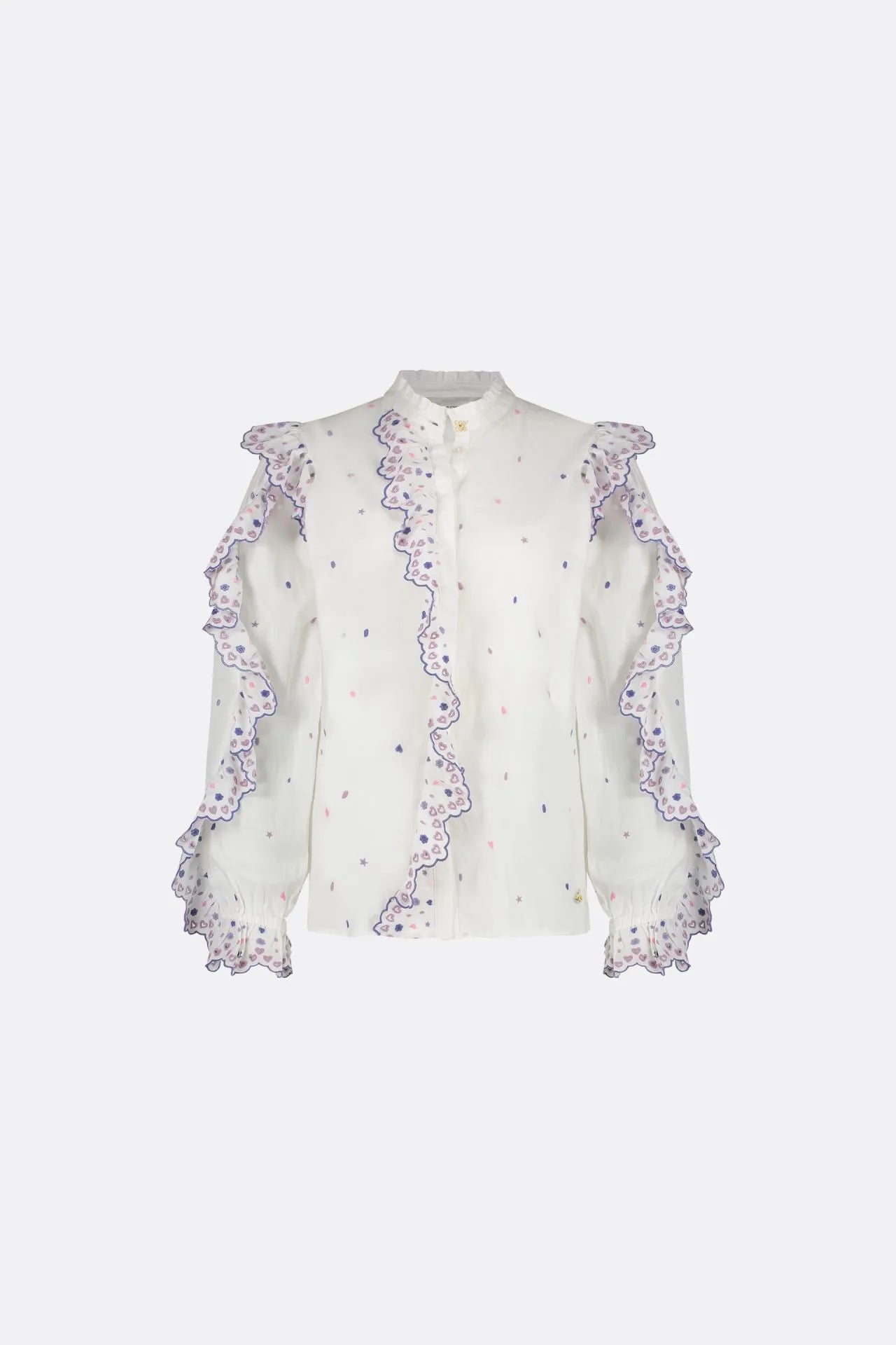 Blouse with long, voluminous sleeves and openwork details. Josie Blouse has a gold button on the hem, beautiful ruffles on the sleeves and elastic at the cuffs. This blouse is made of 100% organic cotton: soft, comfortable and sustainable (GOTS certified).