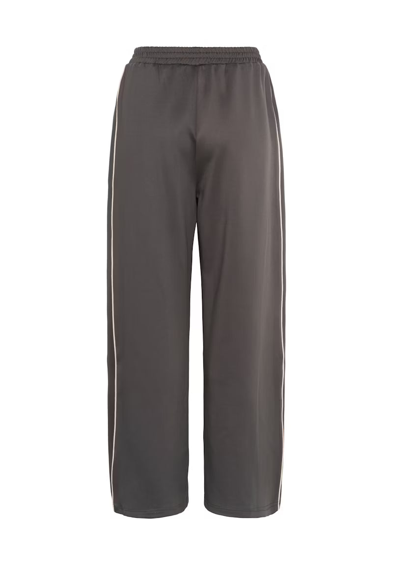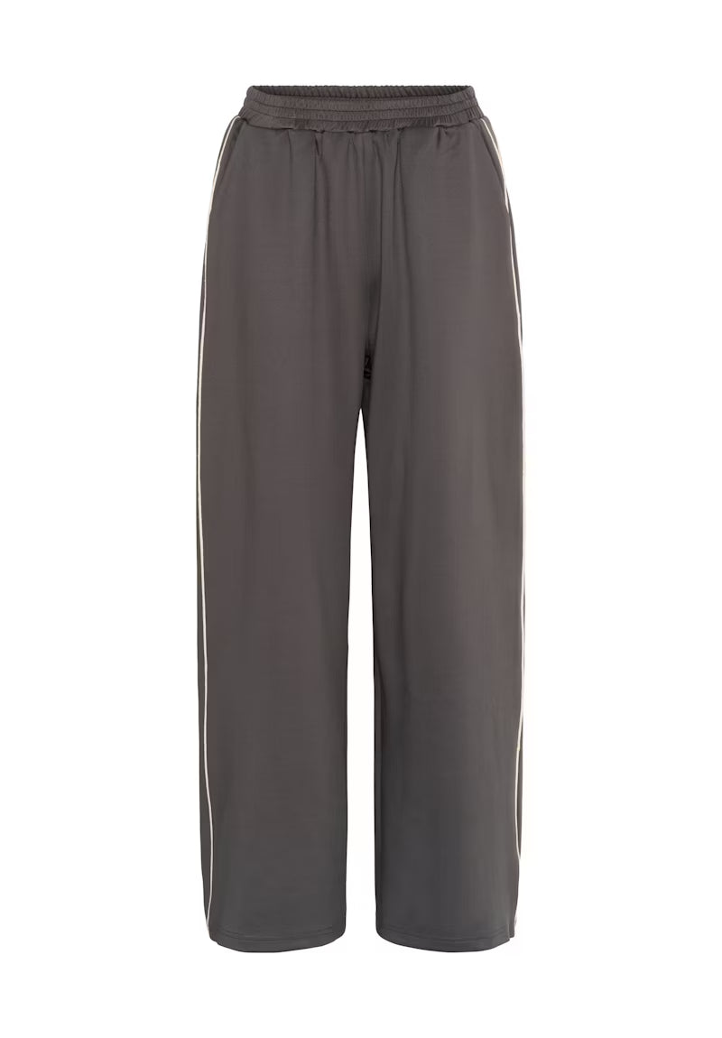 Wide leg pants offer a relaxed fit with an elastic waistband for all-day comfort. Side piping adds a modern accent, making these trousers a versatile choice for casual or athleisure looks.