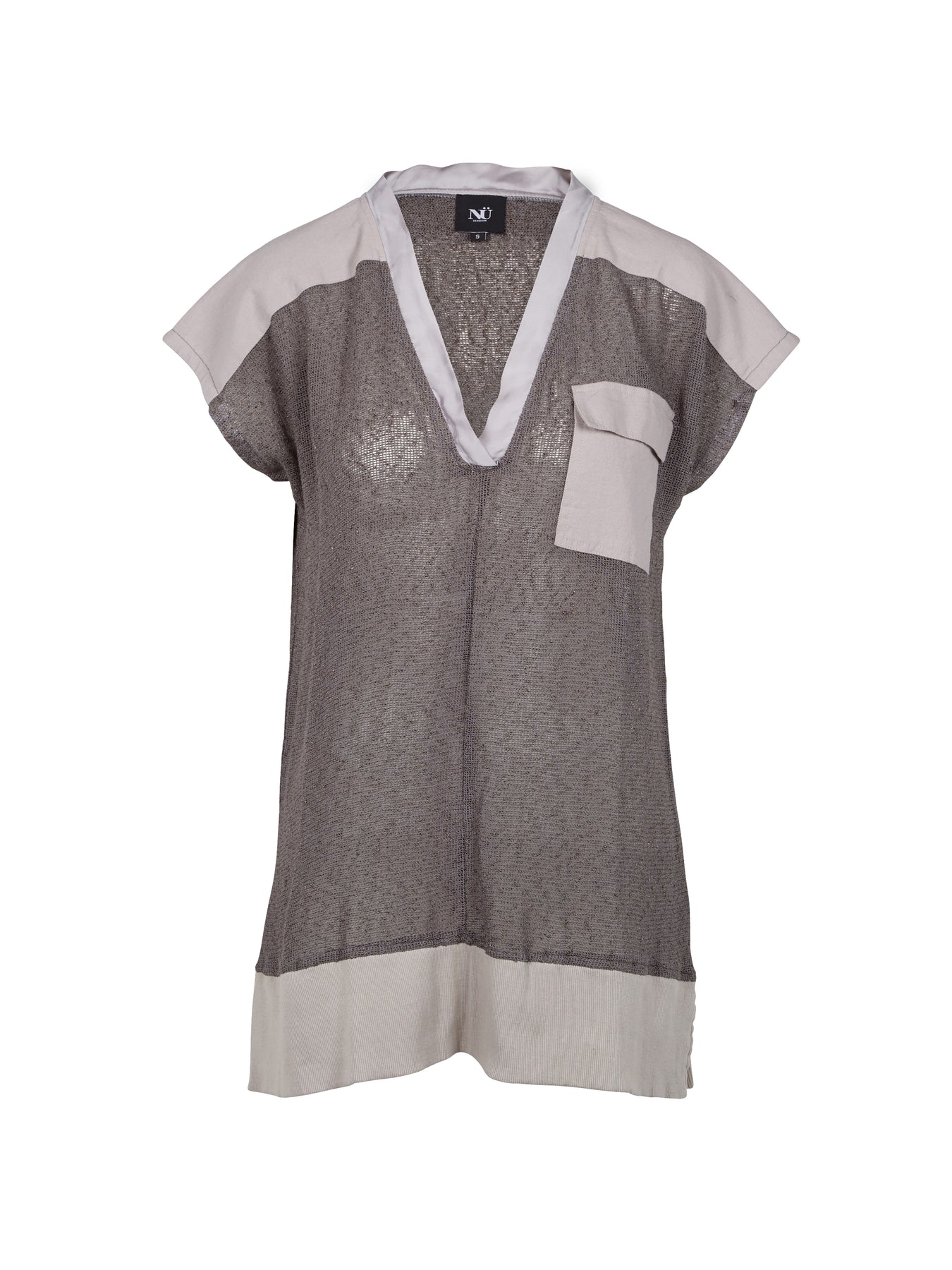 Cool tunic made in a lightweight and breathable, hand-woven bouclé fabric. The tunic has a lovely V-neckline with satin trim as well as a chest pocket and shoulders in a cotton fabric.