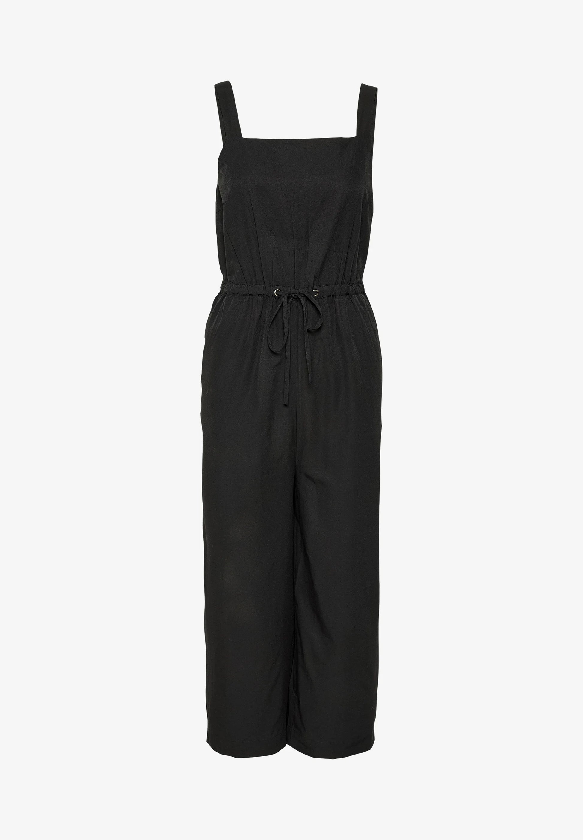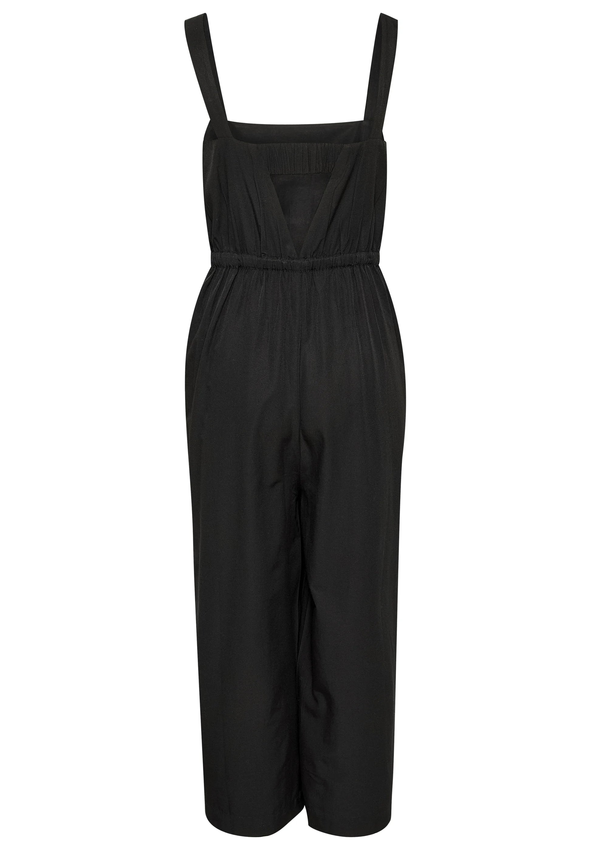 What's not to love about a jumpsuit! Woven in a deep black, this beauty has a drawstring to cinch the waist for a more structured look. Square across the front and wide legged, this jumpsuit is particularly attractive across the back with an elasticated band that exposes the back but hides the bra strap at the same time!