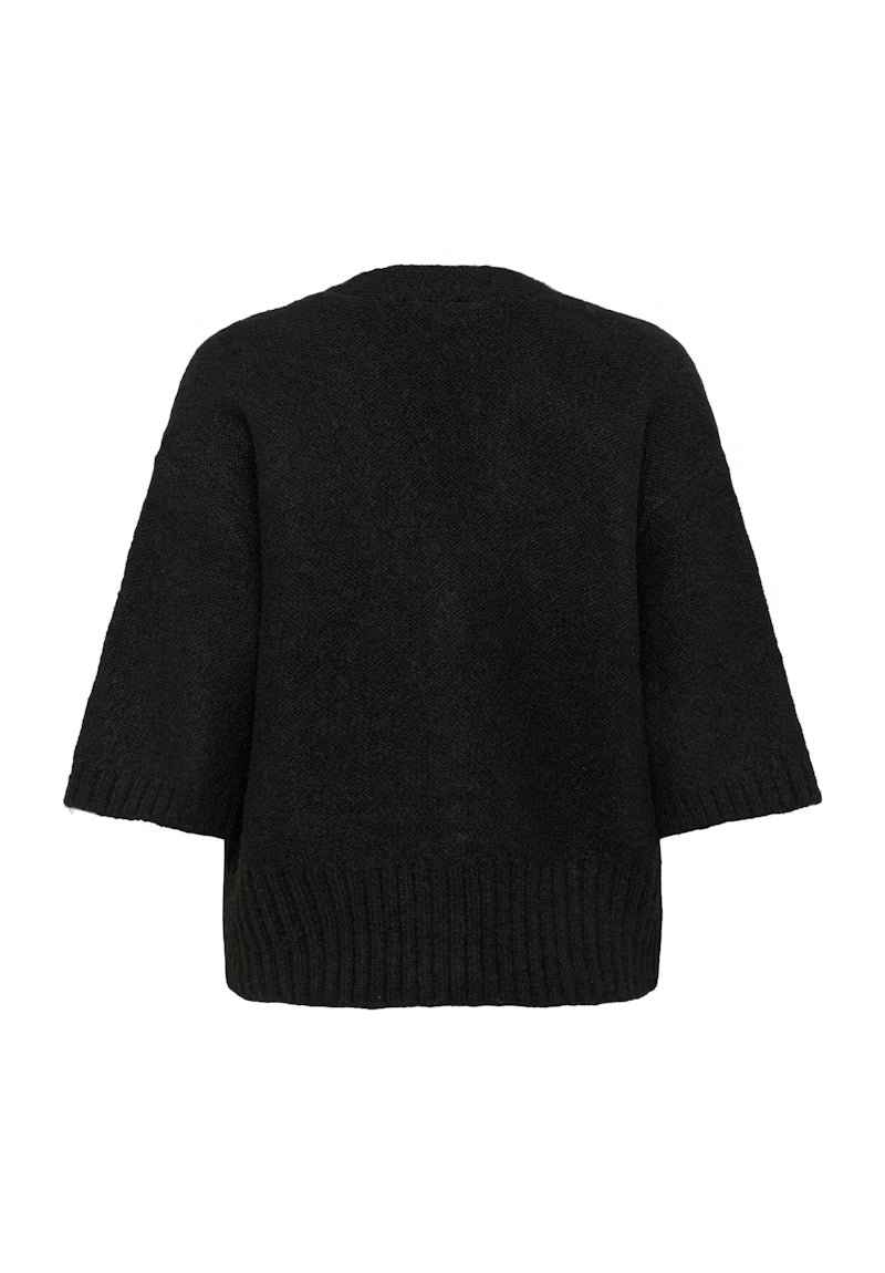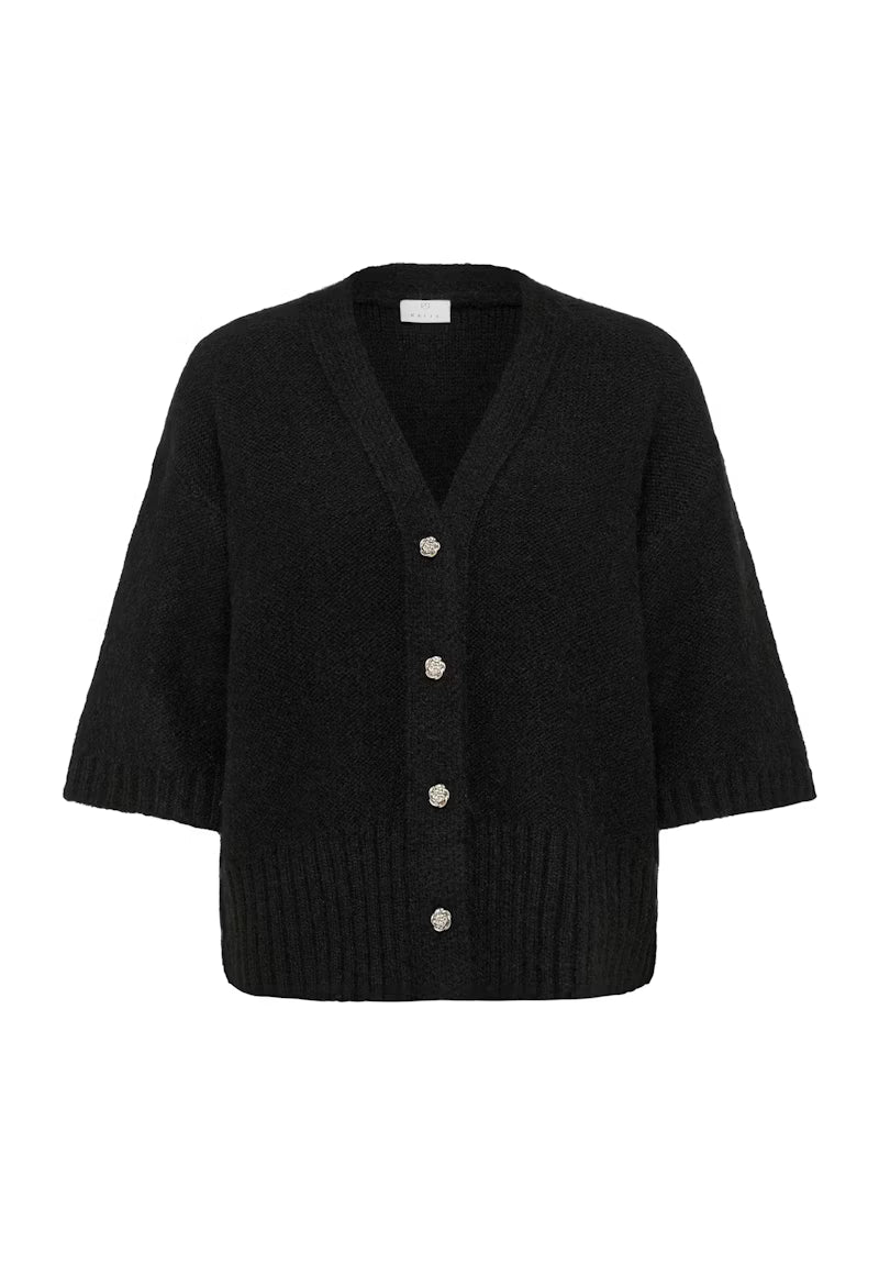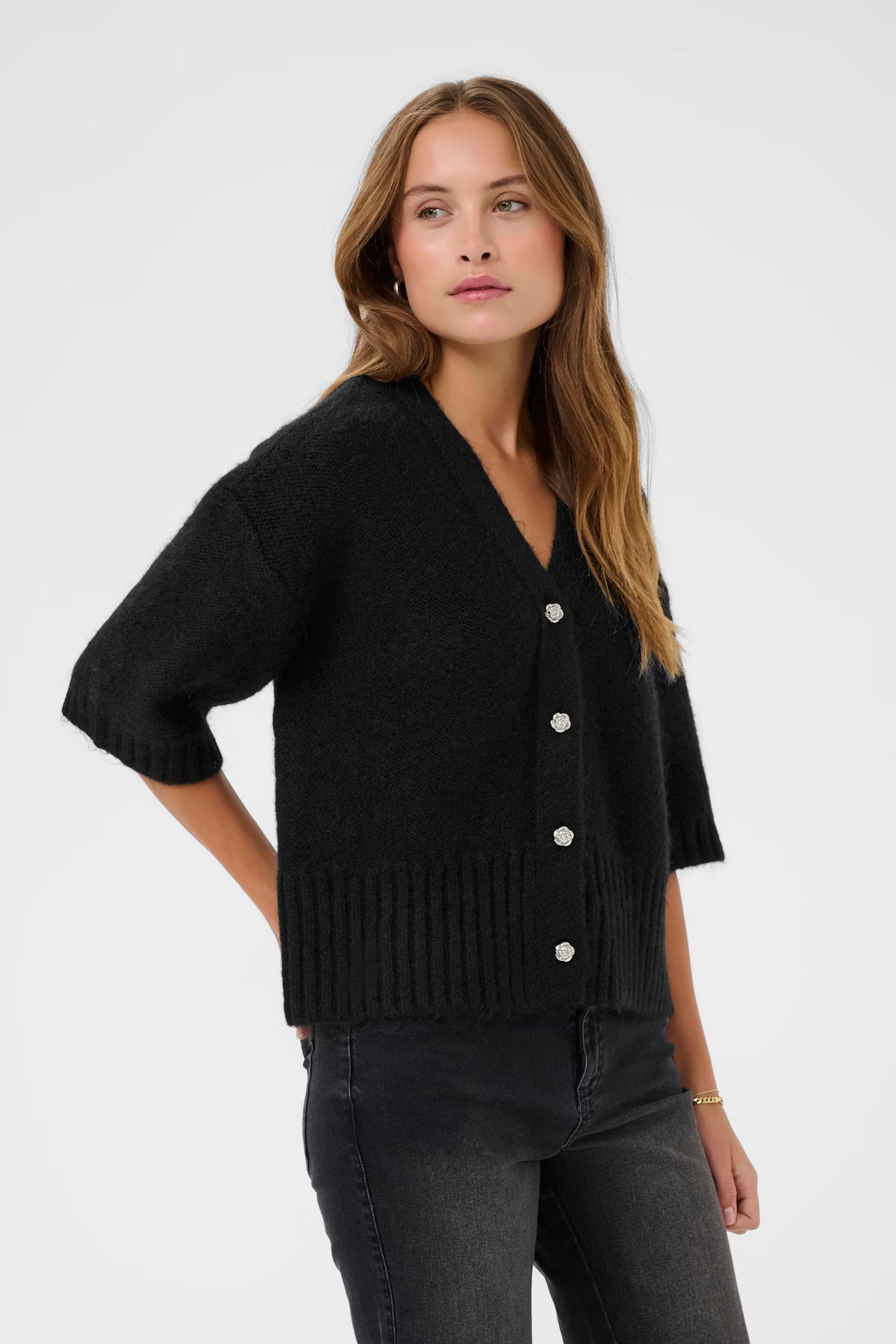 This women’s cardigan features a relaxed fit, cropped length, and V-neckline. Elbow-length sleeves and textured buttons offer chic style and versatile layering comfort.