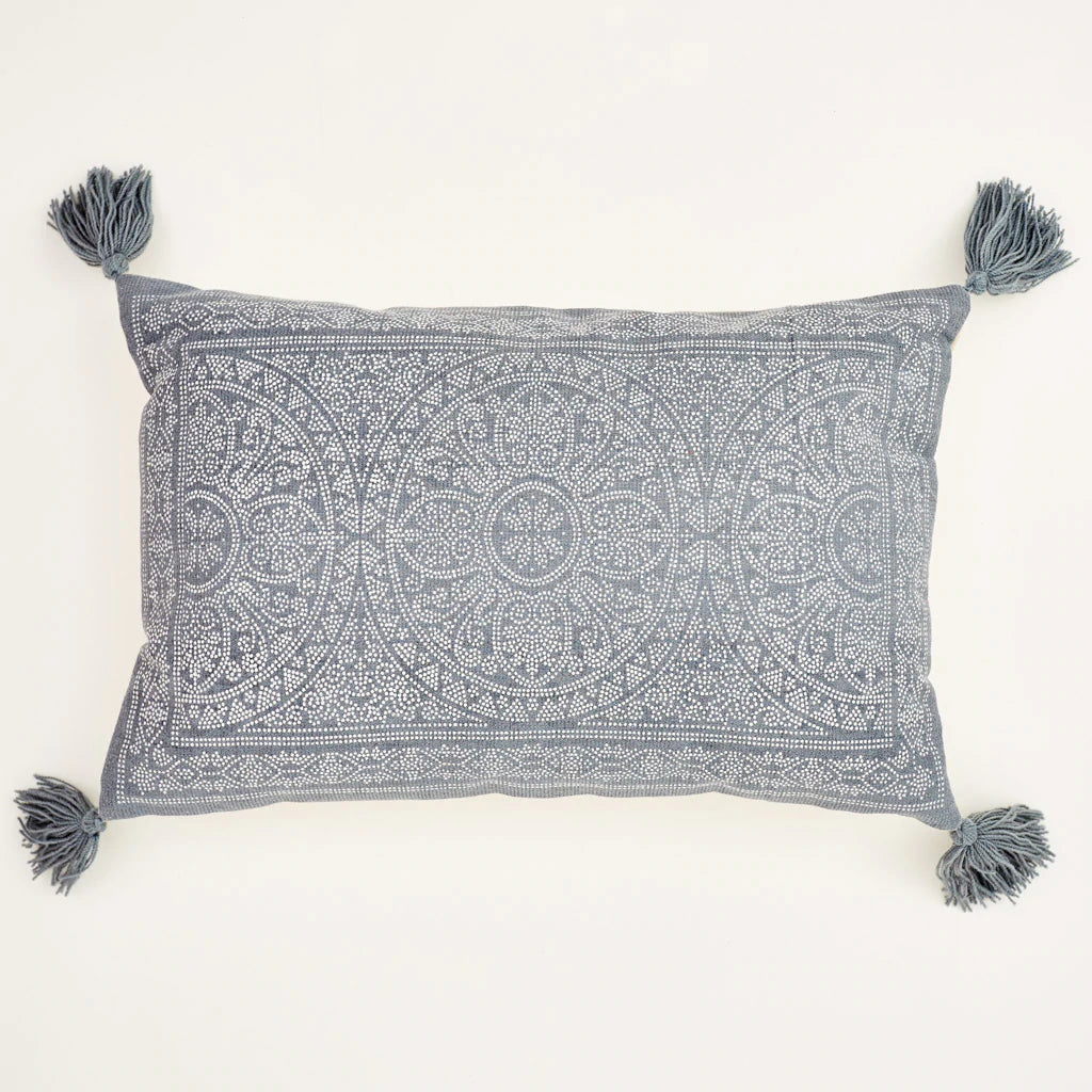 These fabulous blue Kas Navy Cushions feature an intricate dotted pattern inspired by Turkish and Middle Eastern design. With matching navy blue tassels, each printed Kas cushion is made from approximately 150 recycled plastic bottles.
