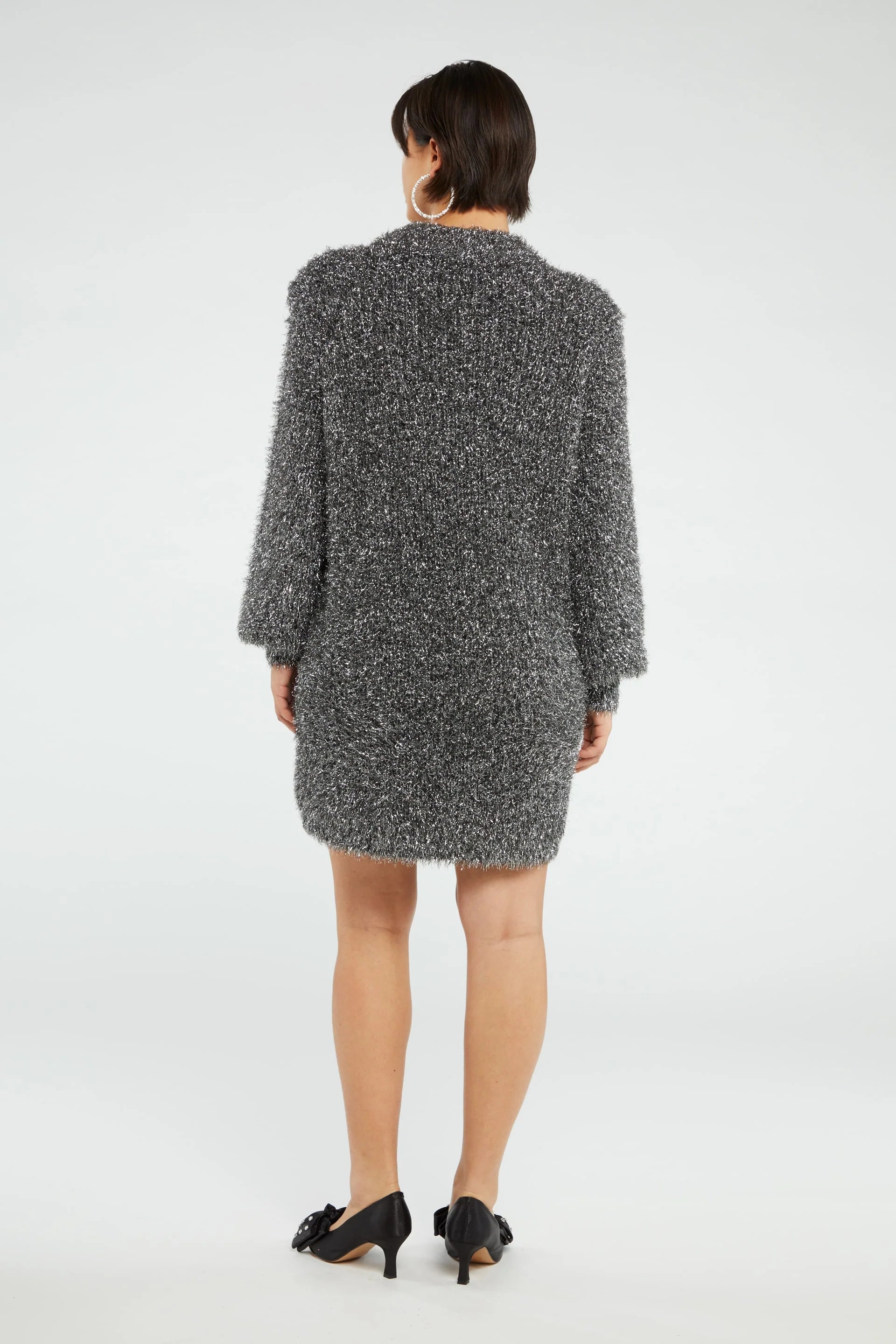 Above the knee, shiny, beautifully soft. and glittery. Luxury Bubble says this is the most fabulous brillo pad they have ever seen! Kitty Dress has shoulder pads, balloon sleeves and round neck. A fabulous statement dress, perfect for the Festive Season.
