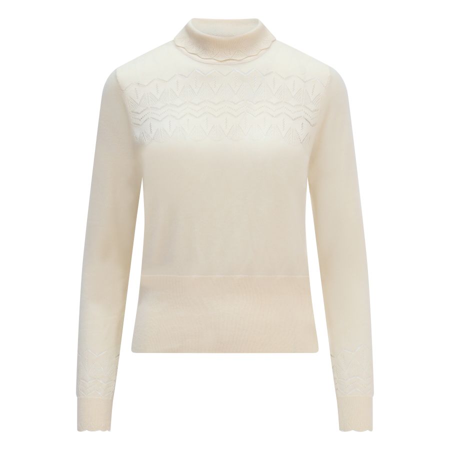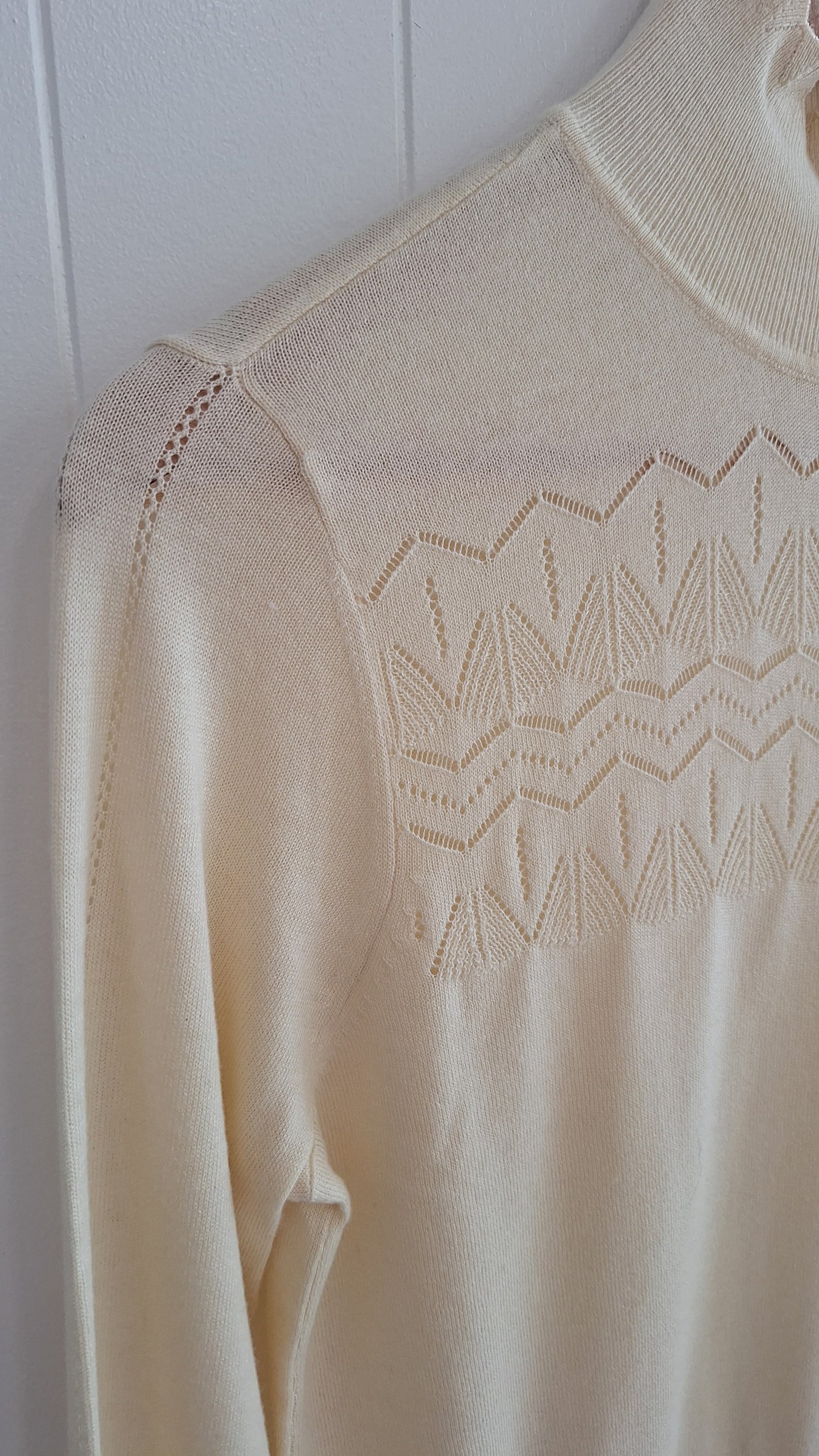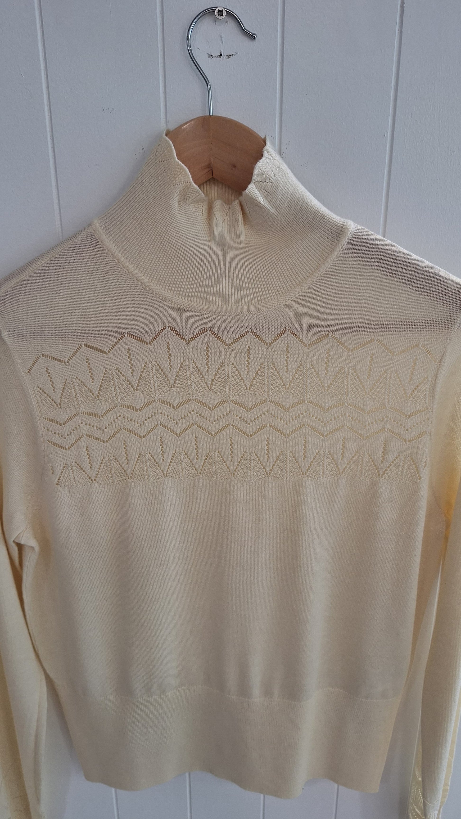 Delicate pointelle sweater in cream. Beautiful detail across the chest with a scalloped polo neck to finish. Great for wearing solo or as a layering piece.
