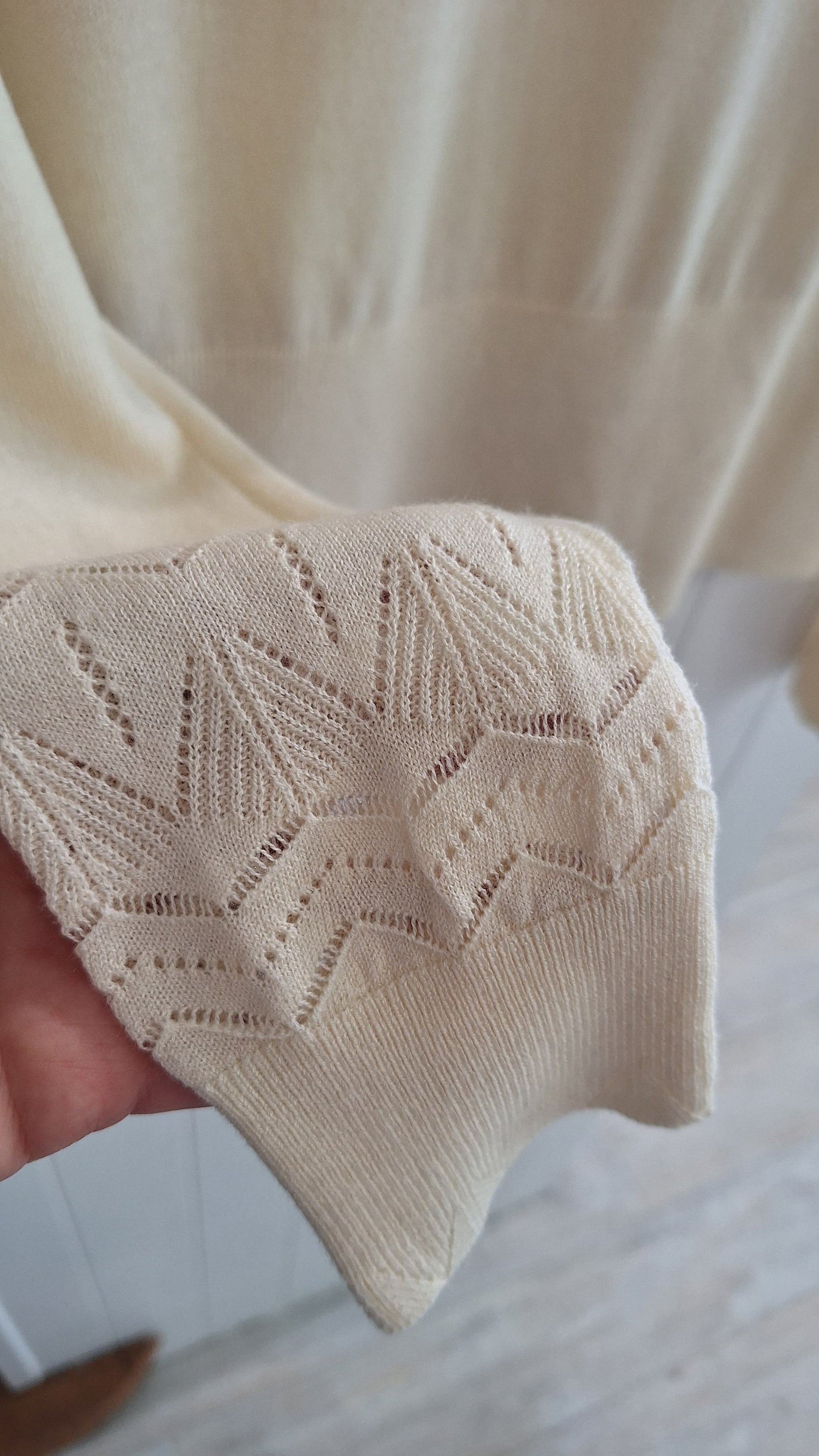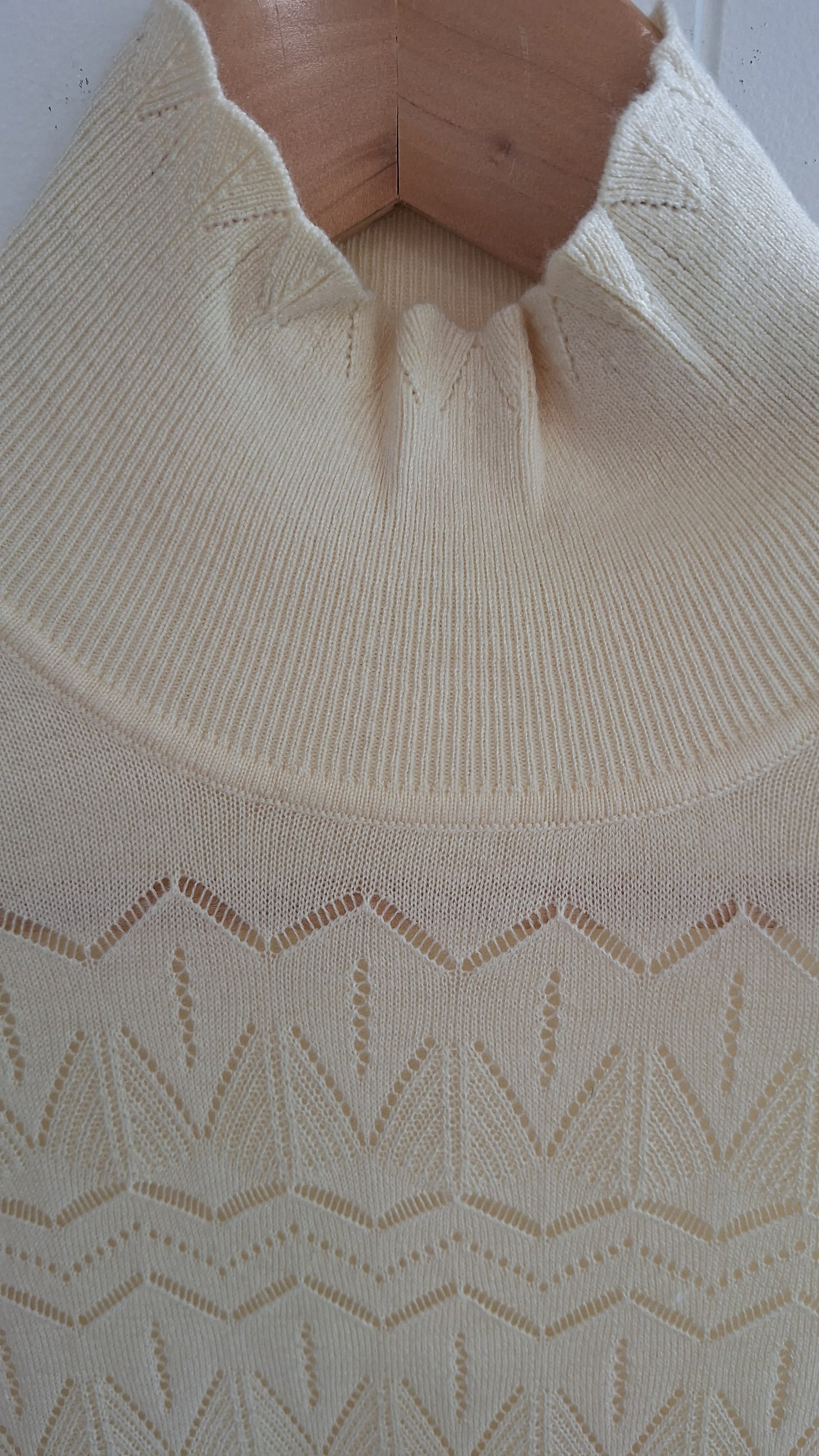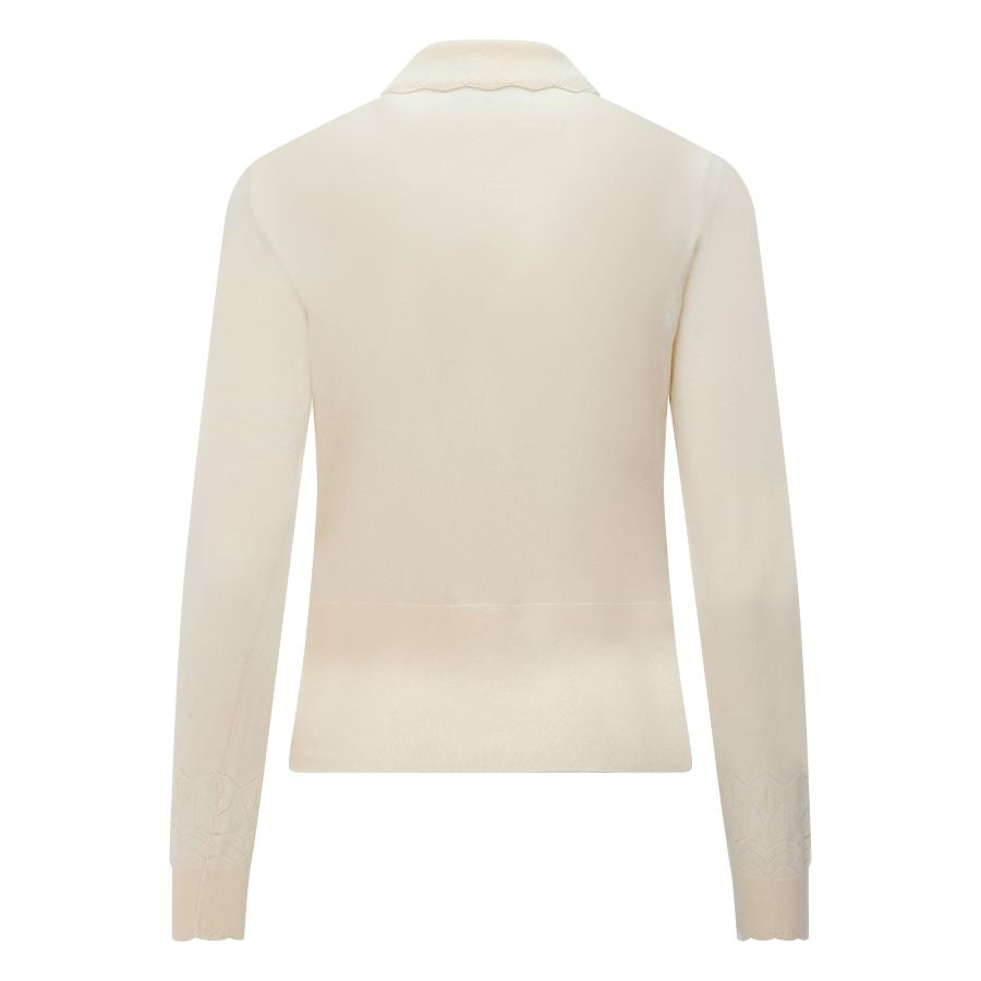 Delicate pointelle sweater in cream. Beautiful detail across the chest with a scalloped polo neck to finish. Great for wearing solo or as a layering piece.