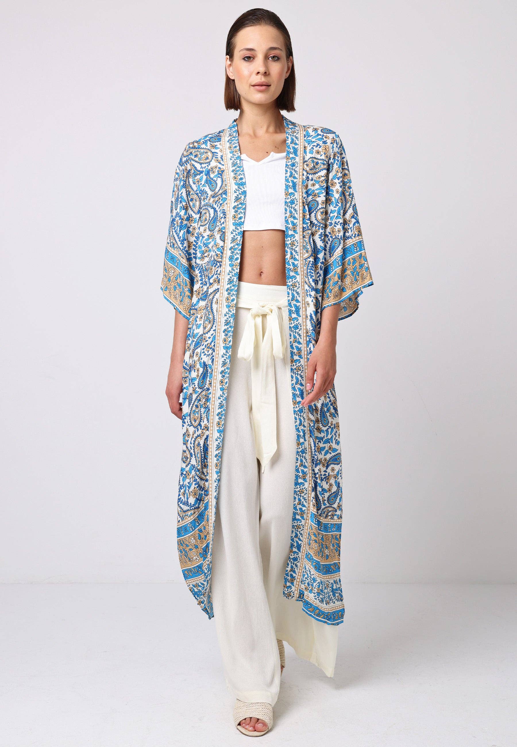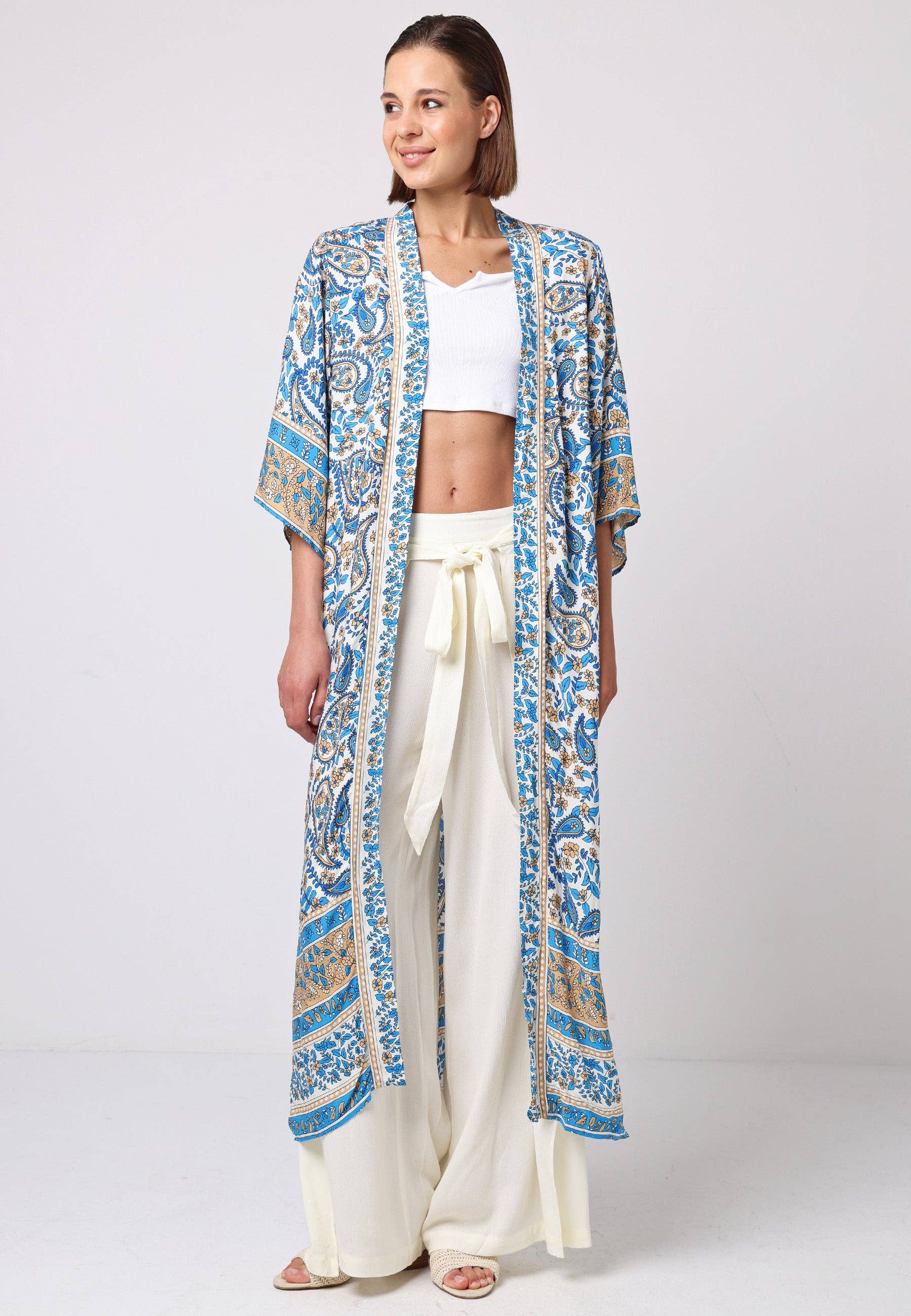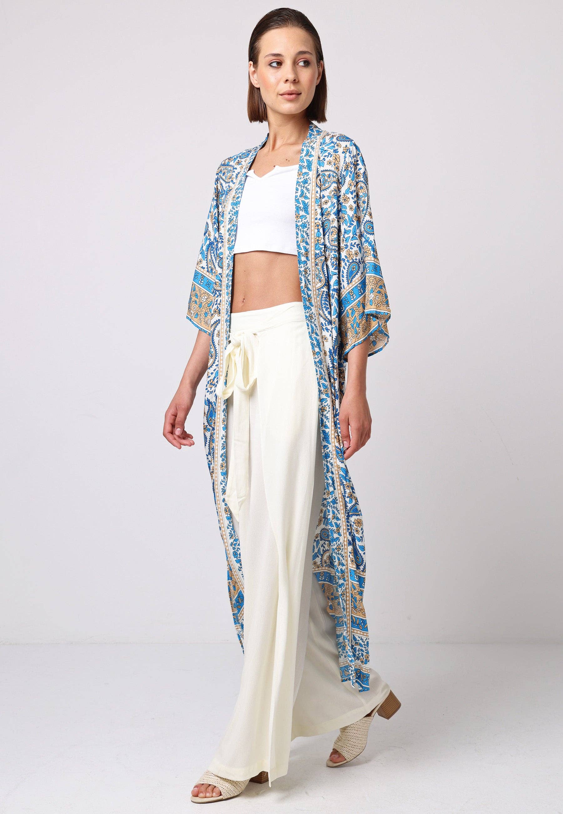 Brighten your outfit with the Long Sleeve Maxi Kimono in Blue Paisley Print by ANGELEYE. Wear this versatile piece to protect your shoulders on beach days or elevate a simple summer outfit. A longline, maxi kimono is elegant and comfortable. Blue paisley print with hints of gold reflects the sun and the sea. Add this loose style over a classic t-shirt and jeans or as a light layer with a dress for cool, romantic summer nights. Maxi Kimono Longline Length Long Sleeve Blue Paisley Print Bohemian Print Beach Wear Summer Layer Light Jacket Work Wear Spring Summer Holiday Picnic Everyday Casual COMPOSITION: 100% VISCOSE MODEL: 5ft 8, wears S.