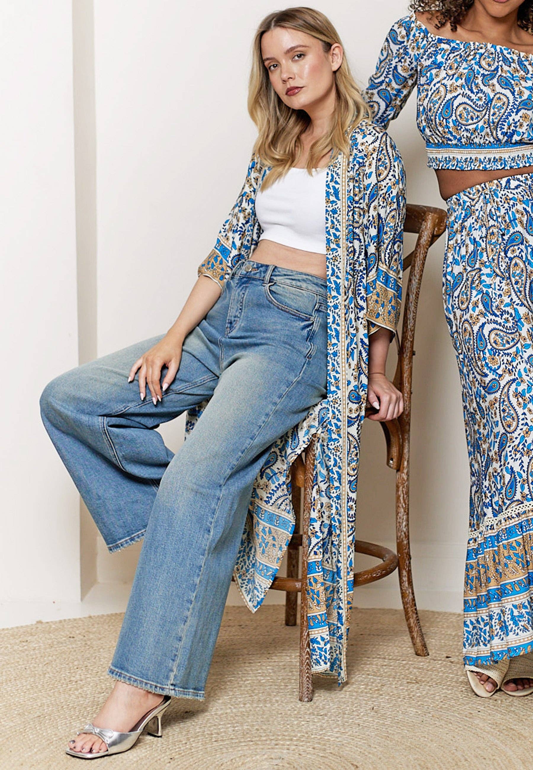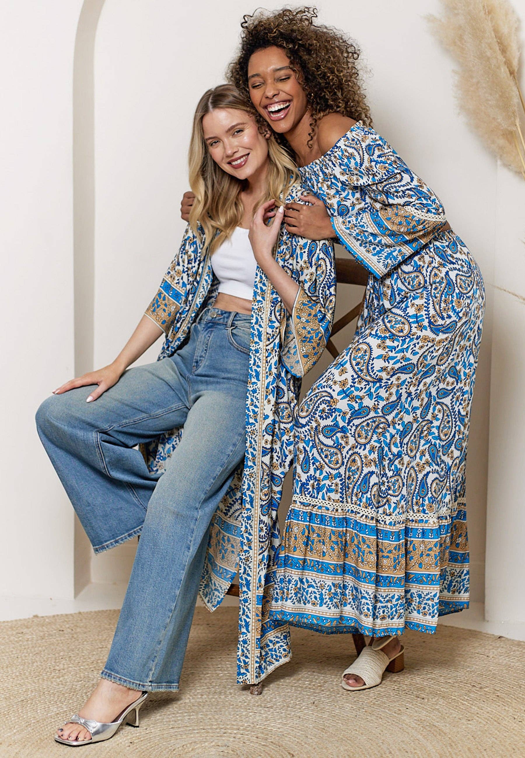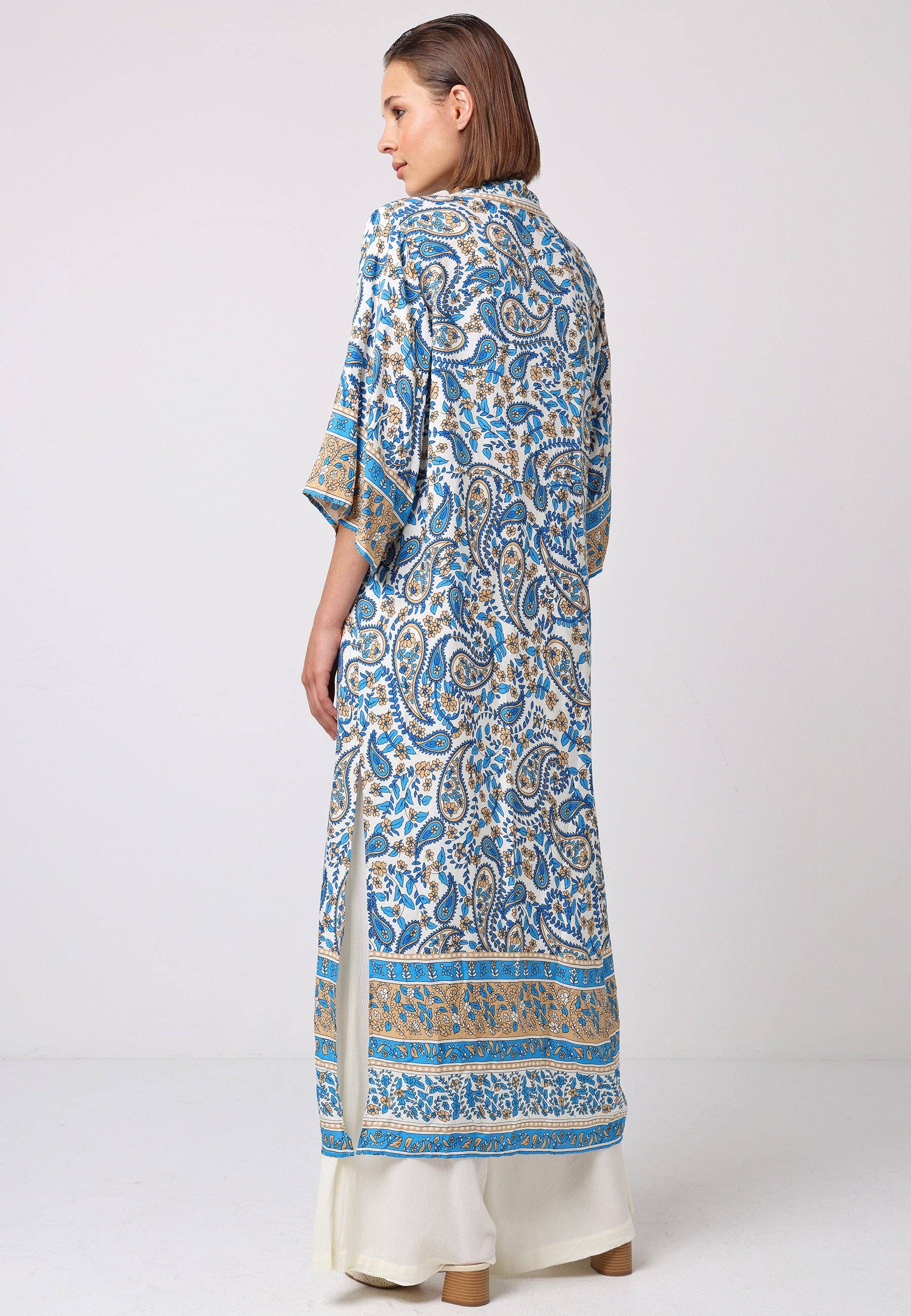 Long Sleeve Maxi Kimono in Blue Paisley Print