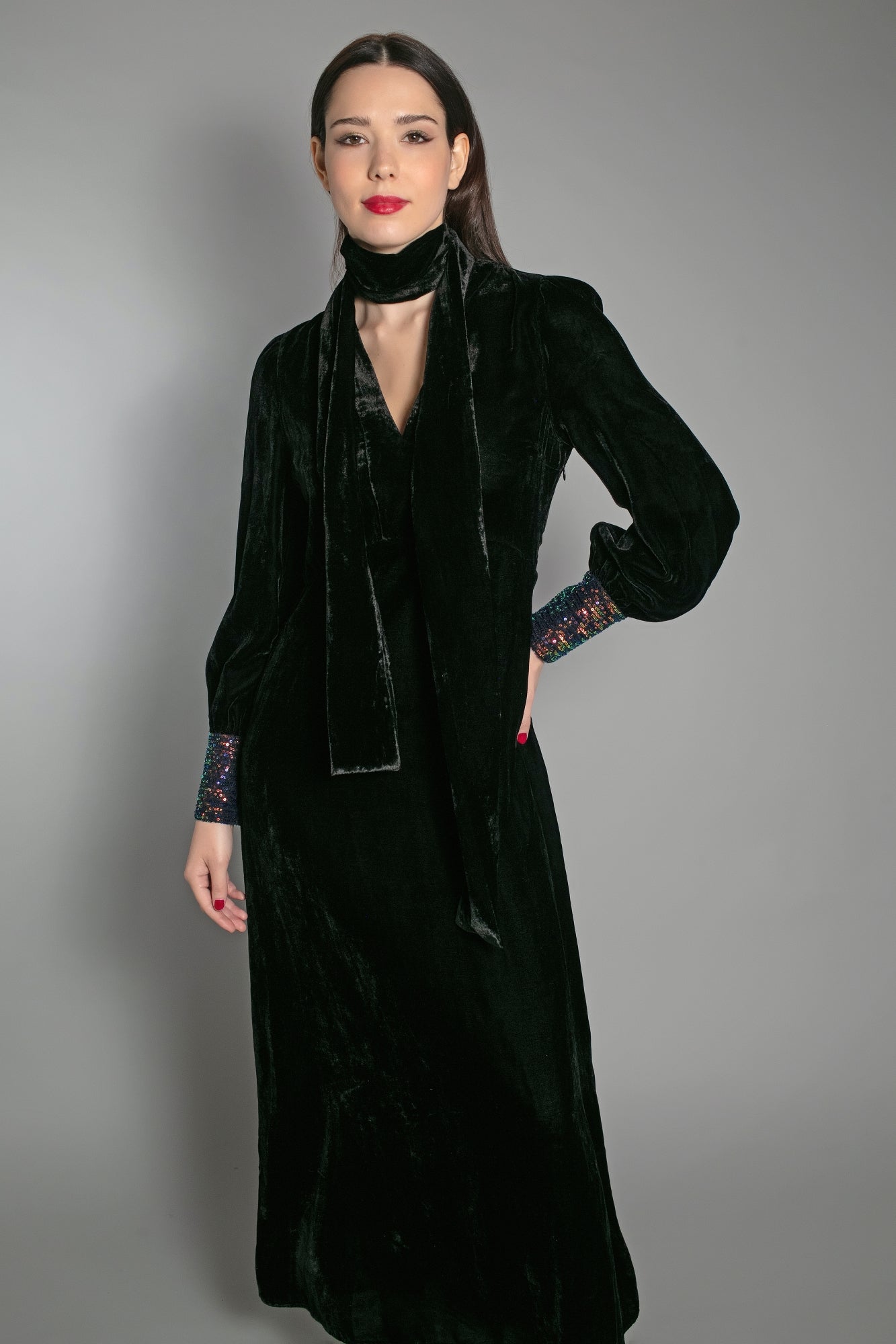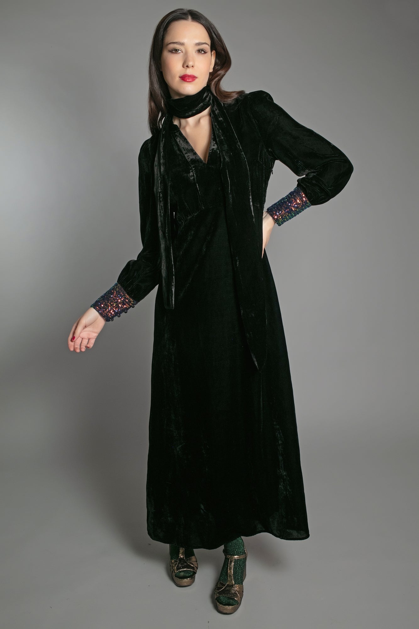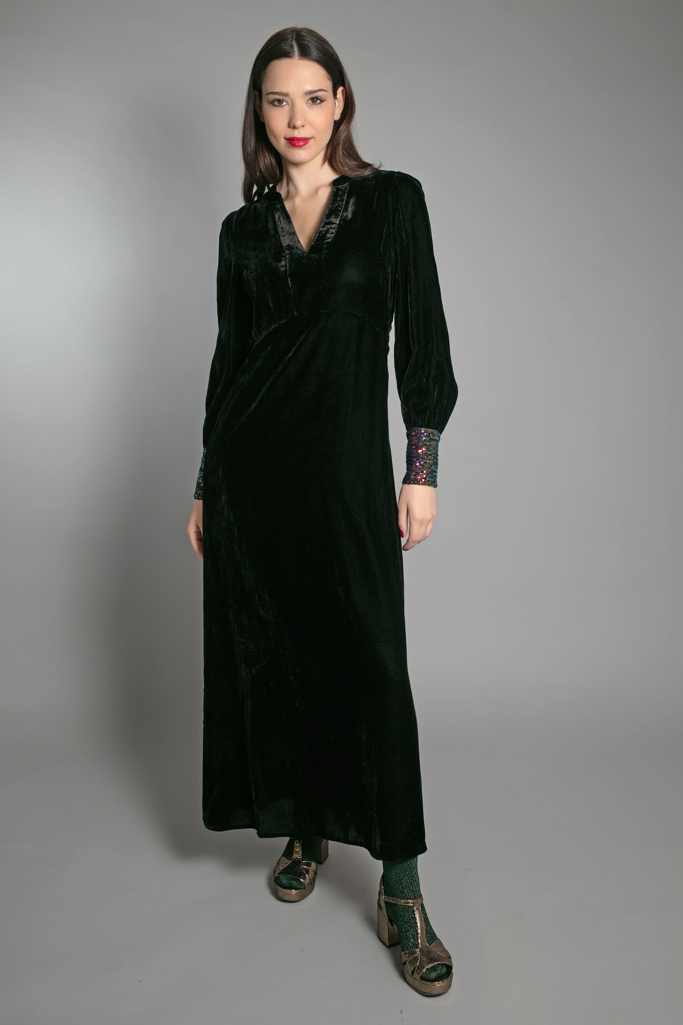 Mandarin collar with v-neck, long sleeves and sequined cuff.