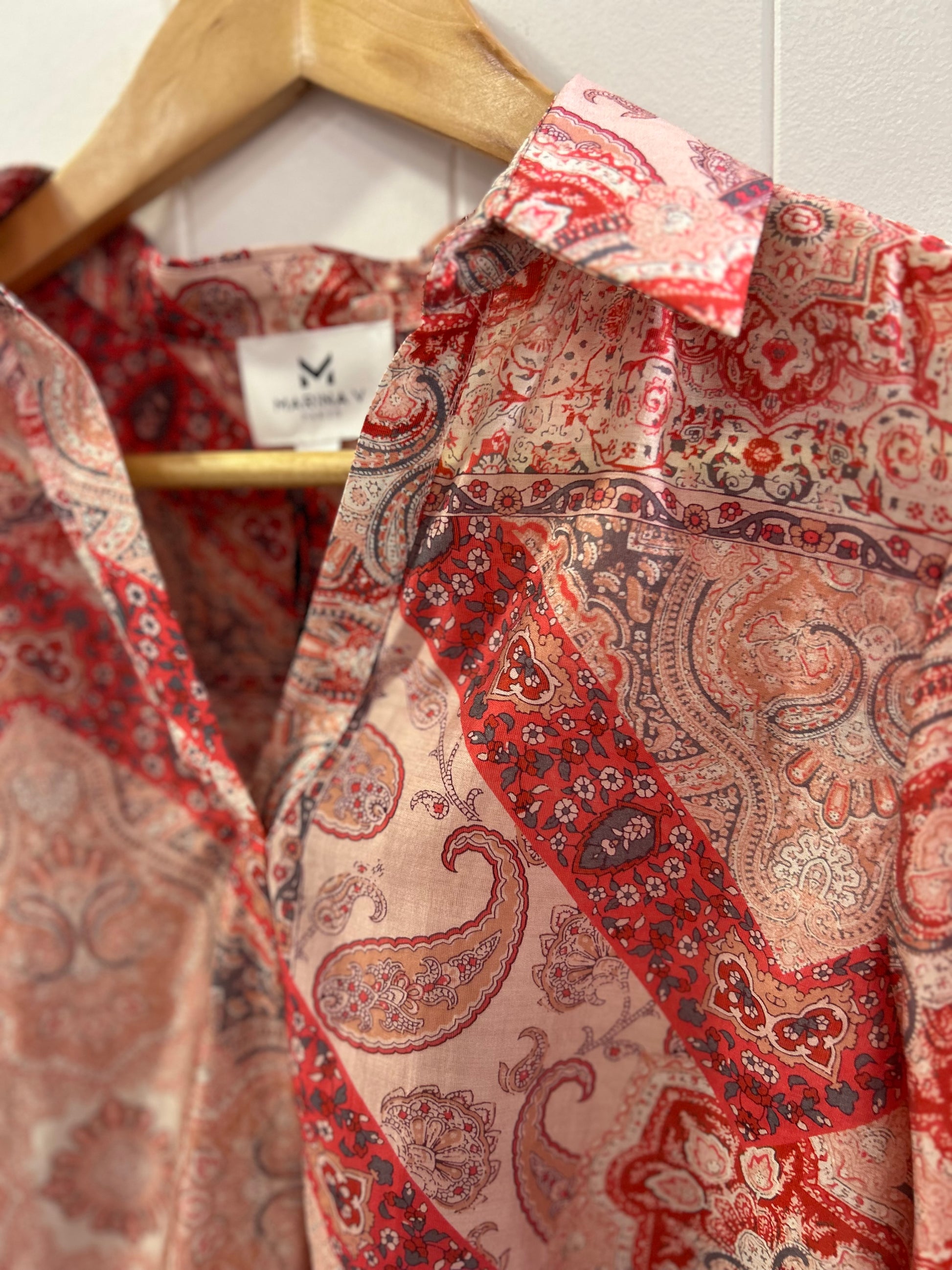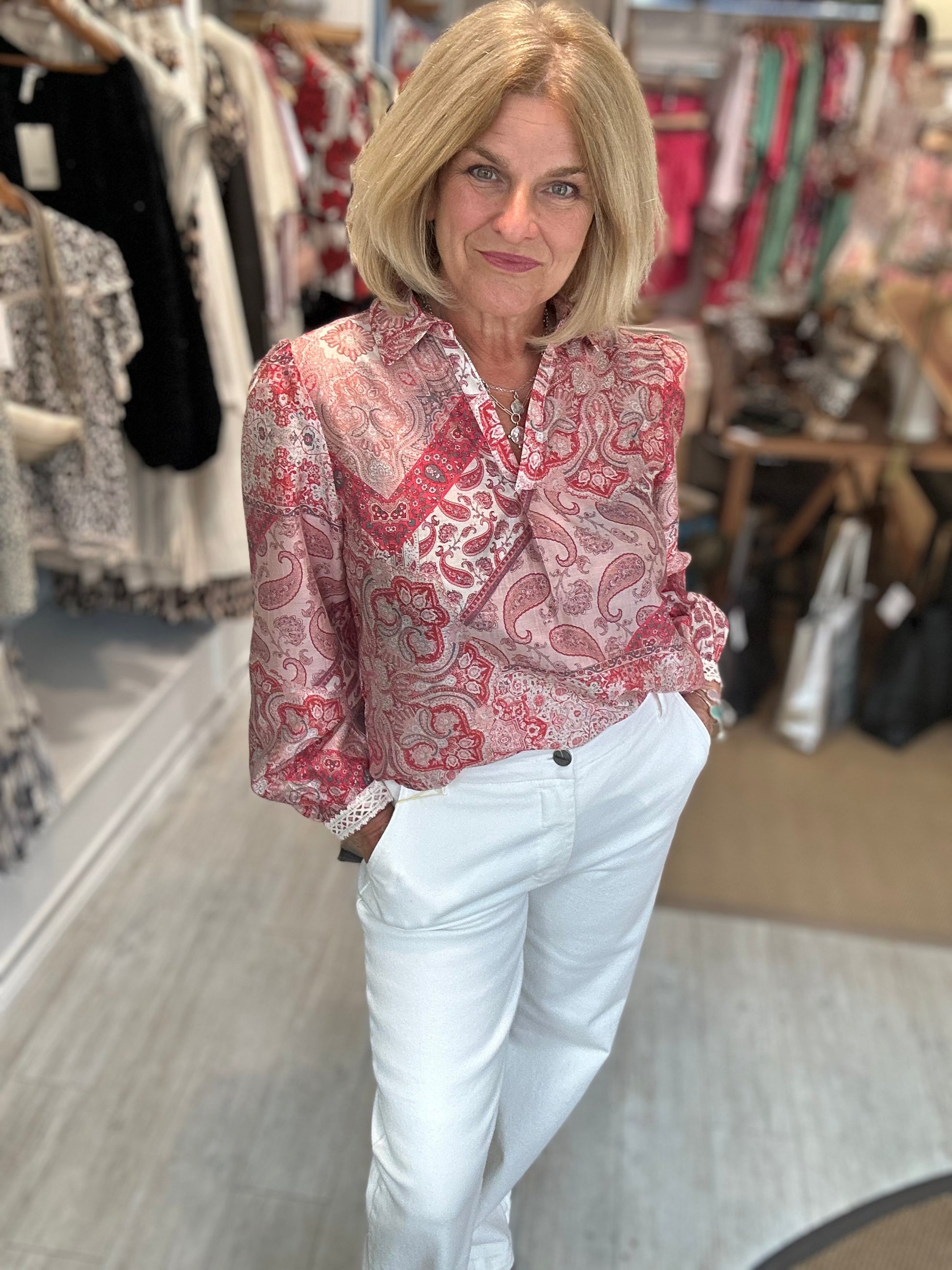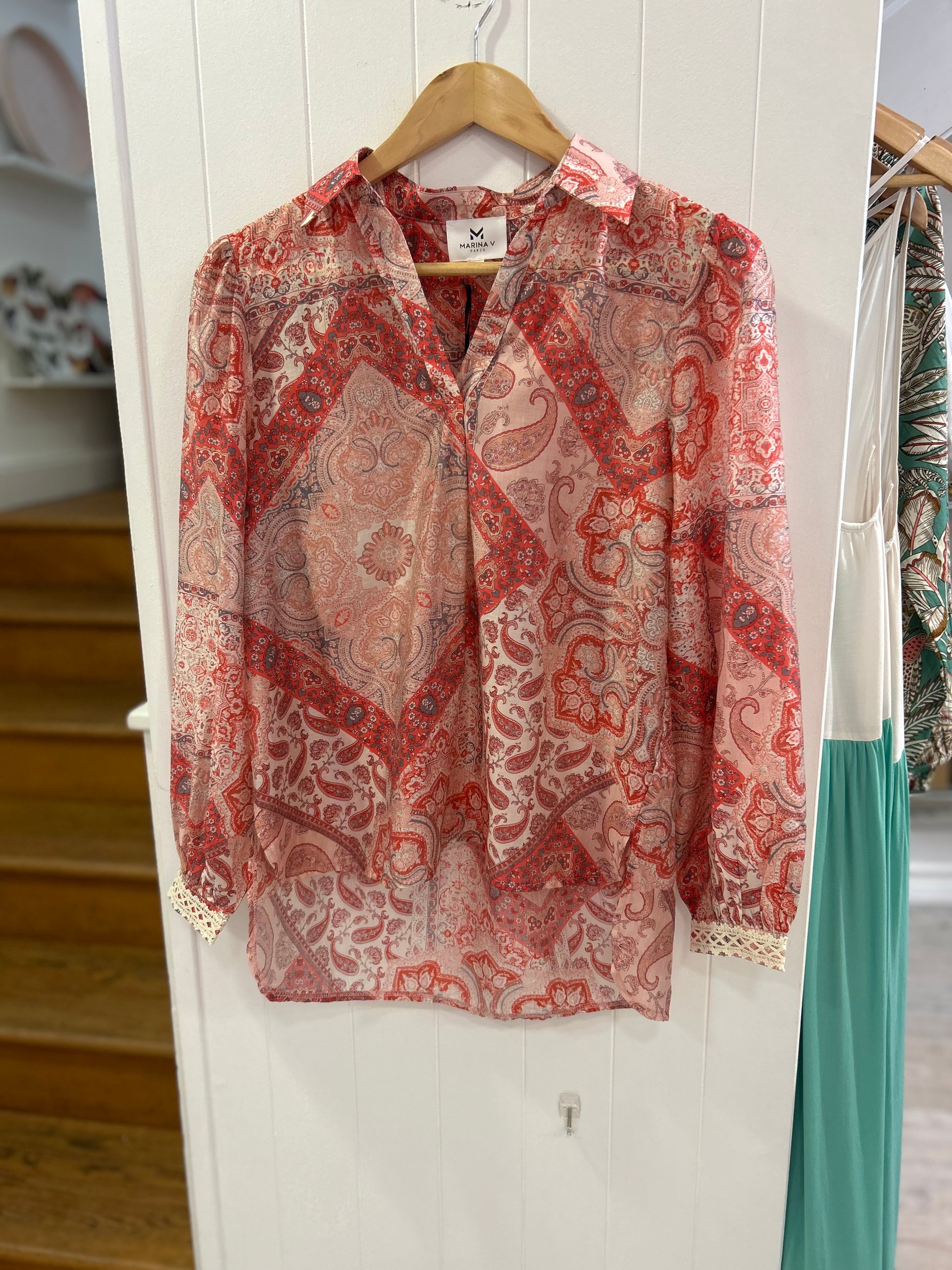 MARINA V Denim Peach ‘Paisley’ Print Blouse in shades of peach. Shirt collar with open v-detail, 3/4 length full sleeves with lace detail button cuffs and shaped hemline. Relaxed fit.
