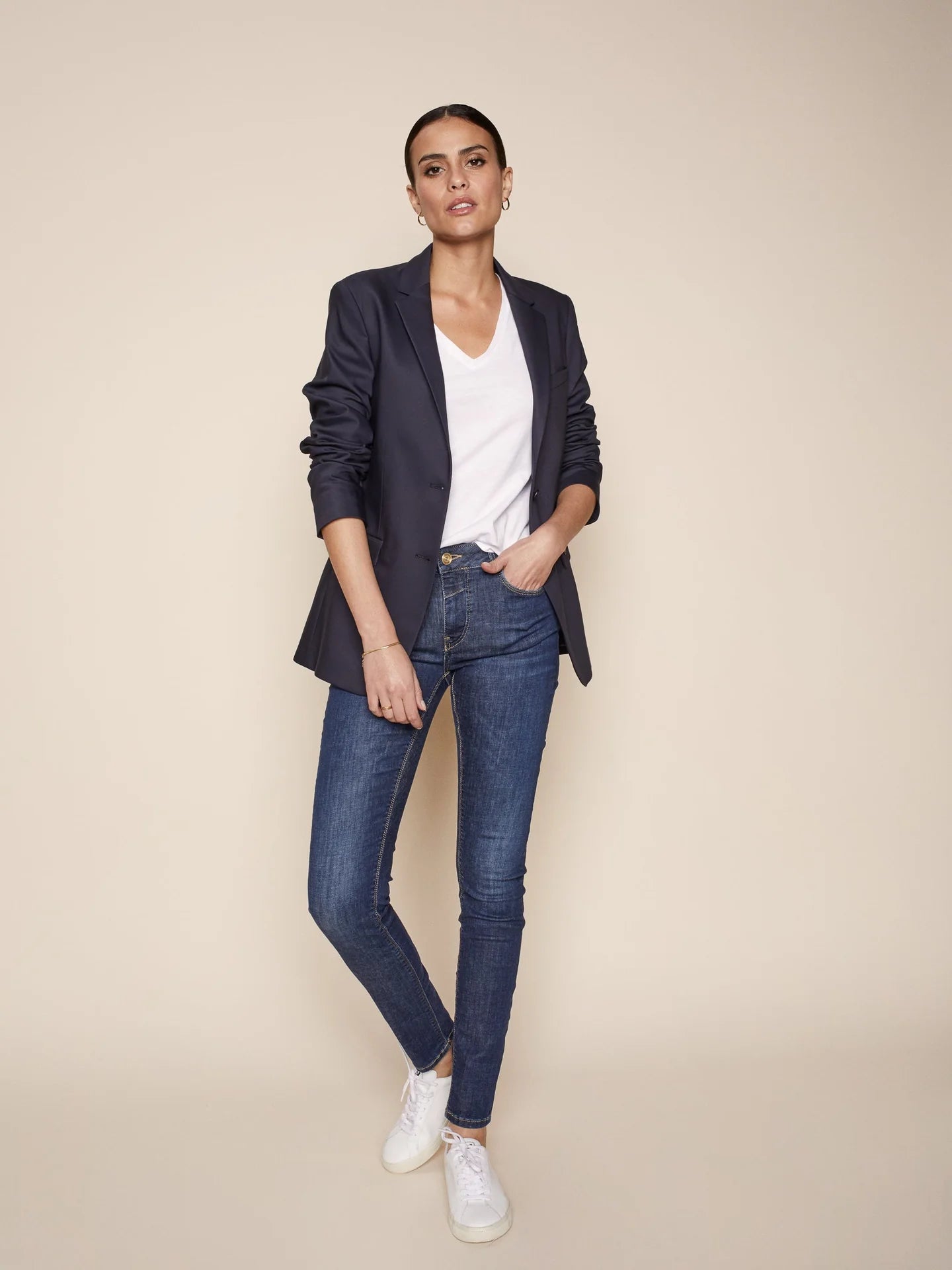 A classic 5-pocket denim construction made with a twist. Cut in a tapered fit with mid/high-rise and stitch detailing at the knees. Made to fit seamlessly in your wardrobe and looks great with anything from tailored shirts, blazers and jumpers.