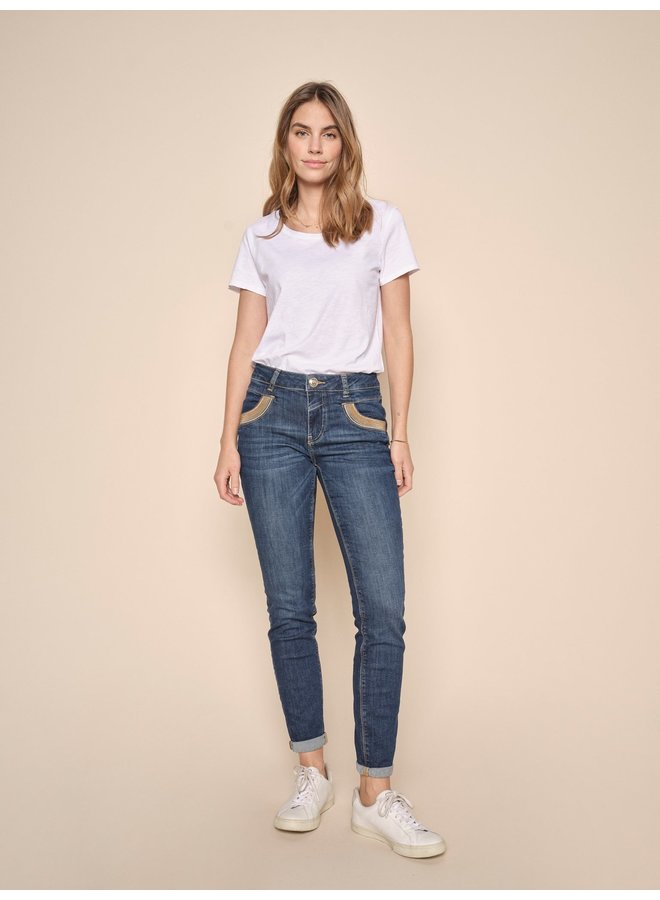 Cool dark-washed jeans, crafted from a BCI cotton blend. These are cut in a regular fit with high/mid-rise and finished with a leather badge at the back and lurex-bead glam at the pockets. Roll up the cuffs and style with a classic shirt and sandals for a chic office look.