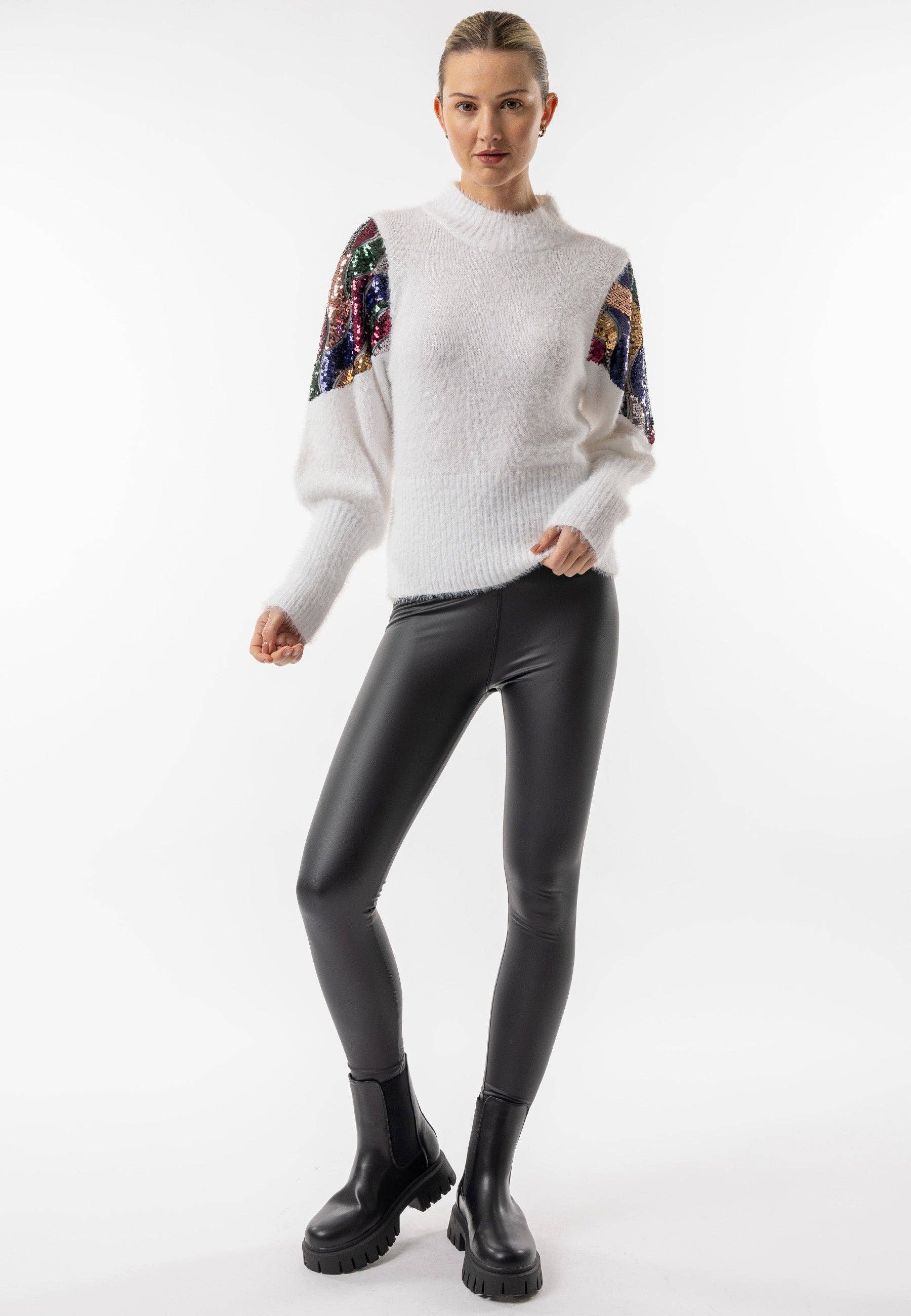 The Mock Neck White Knit Jumper with Sequin Shoulder Detail by ANGELEYE puts a special touch on an everyday style. A white mock neck is a season necessity and we've elevated it with glam sequin shoulder details in rainbow. Practical knit and long sleeves for cool days without compromising on sparkly style. Pair with leather trousers for a night out or jeans for everyday wear.