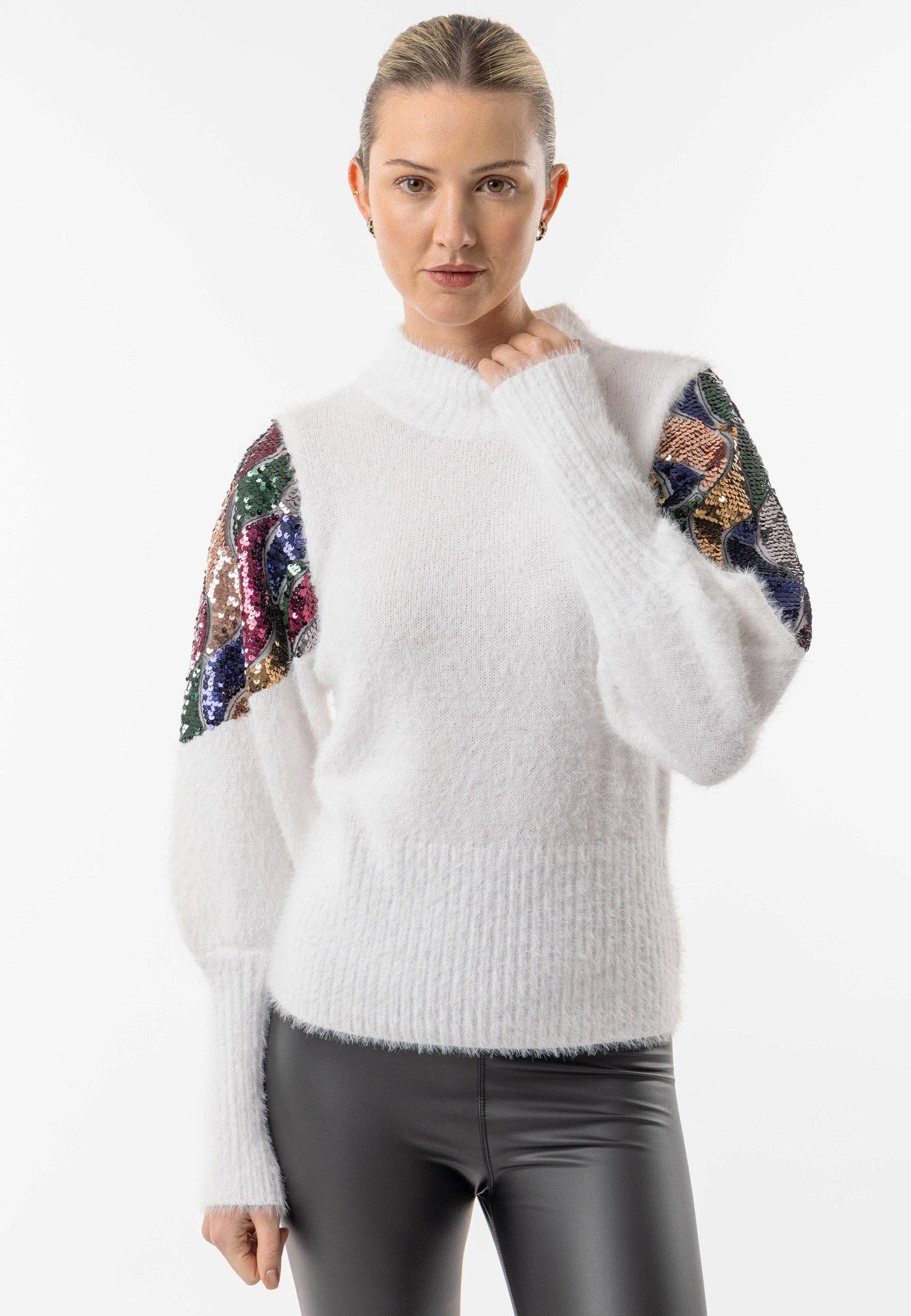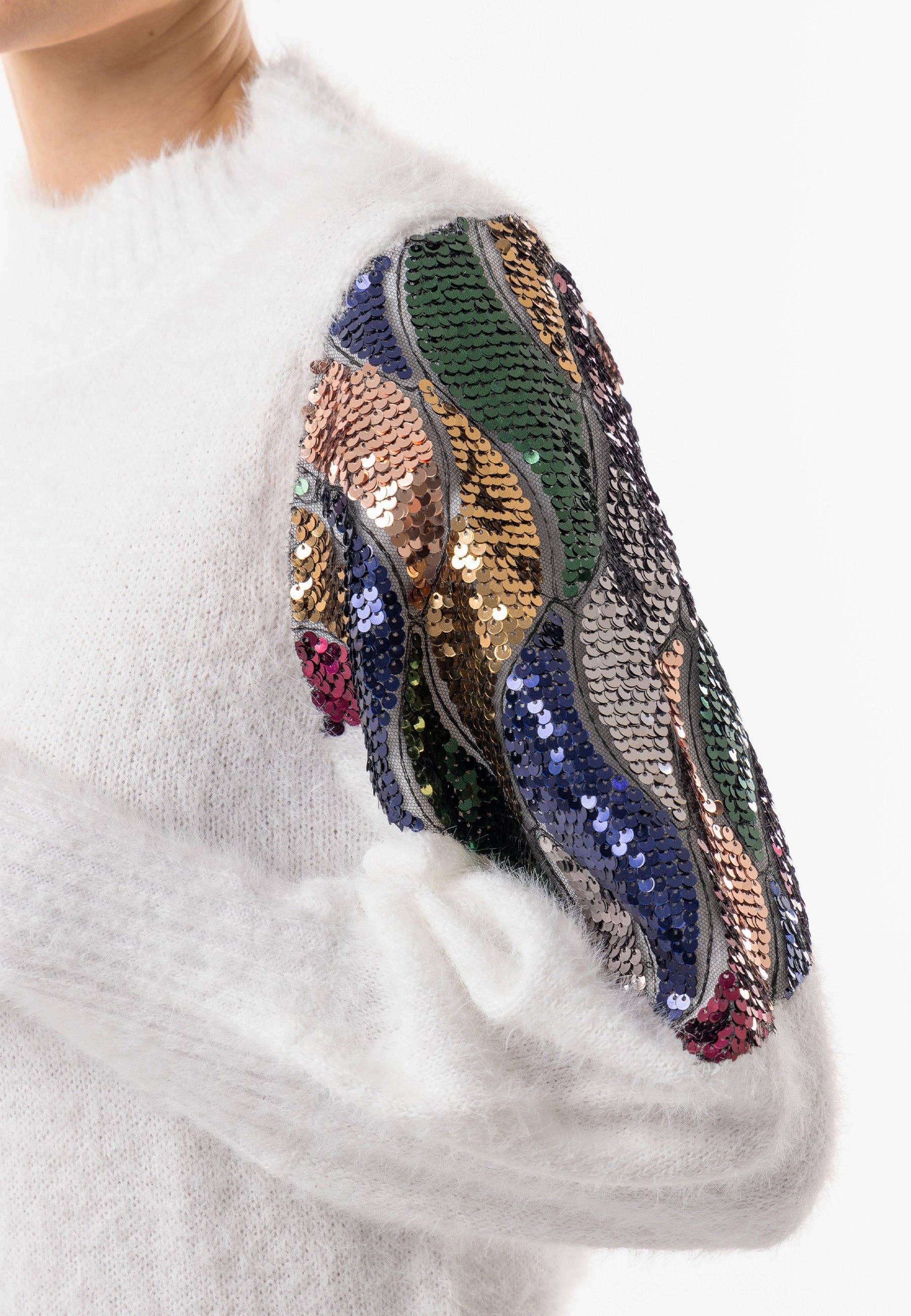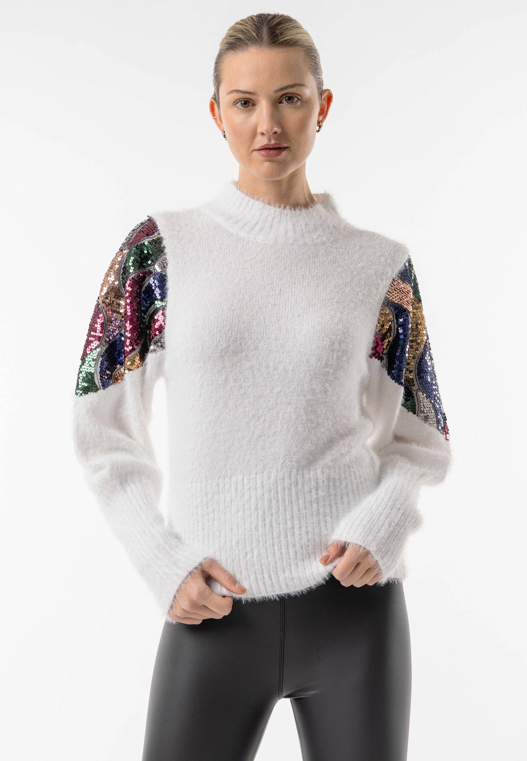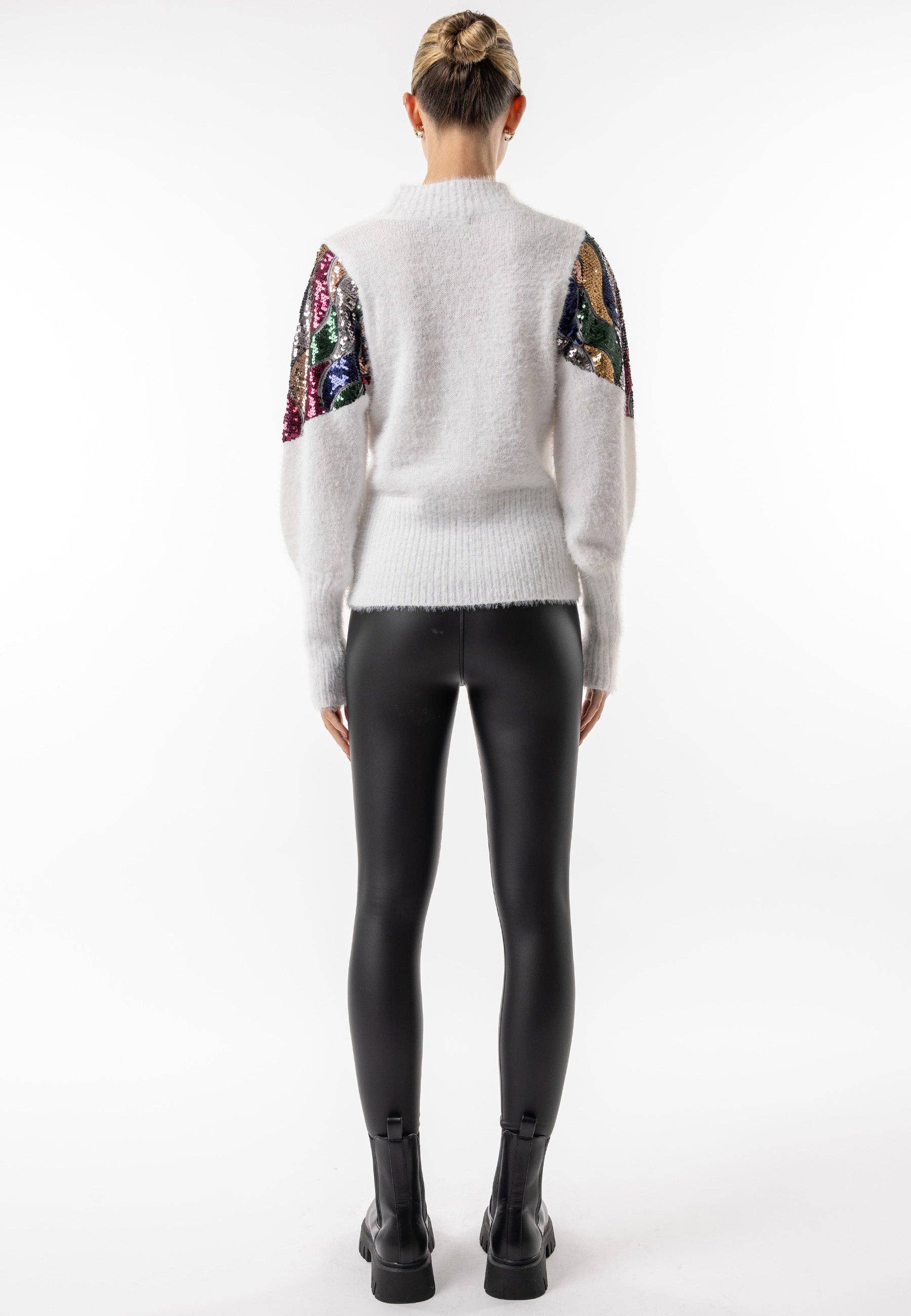 Mock Neck White Knit Jumper with Sequin Shoulder Detail