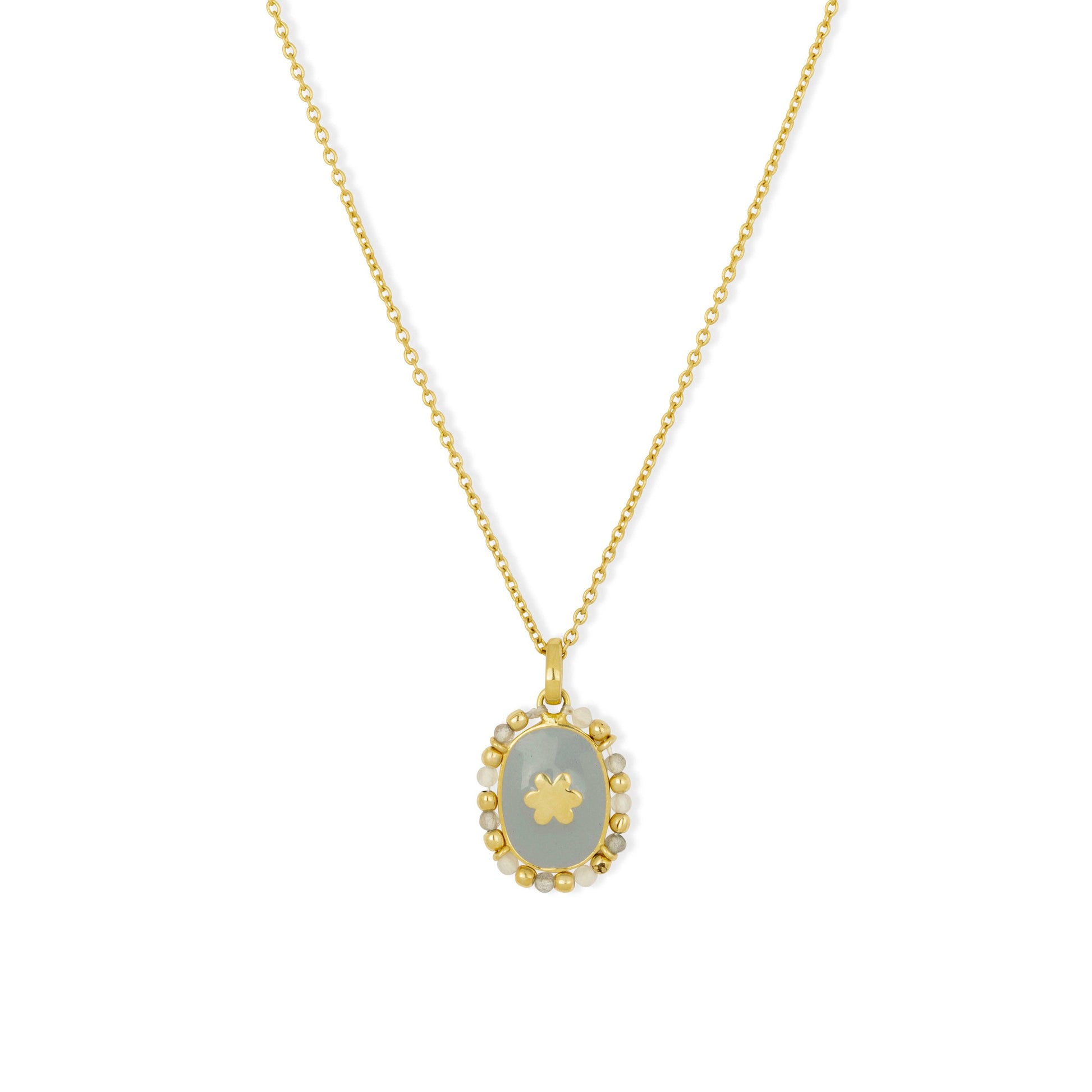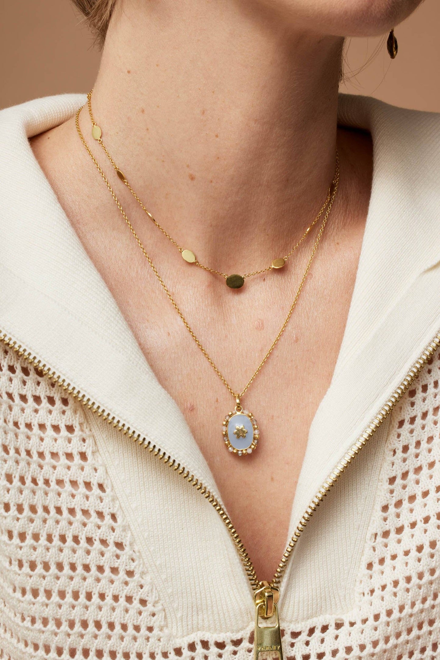 Add a touch of magic to your everyday look with the Newport Star Pendant Necklace in grey enamel. This playful pendant features a shimmering gold star surrounded by delicate labradorite and rainbow moonstone beads, all strung on a thin, easy-to-layer chain. Perfect for brightening up your daytime style with a subtle sparkle and a dash of charm.