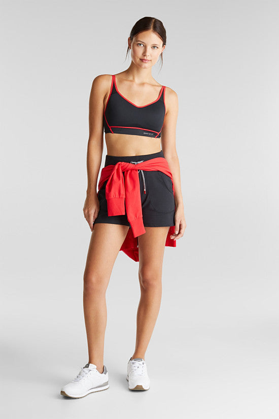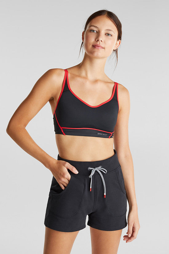 The contrasting coloured piping and straps on this slightly padded sports bra add an eye-catching accent.Â