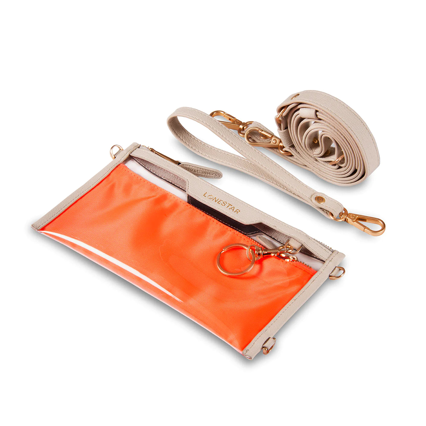 Nova is a stylish cross body phone case bag with a quirky, and very useful feature. Our clear pocket allows you to see AND use your phone without having to remove it. Perfect for when you’re on the slopes, the beach, with the dogs, in fact you can enjoy Nova in countless other ways, your imagination is the limit. Our internal pocket provides ample space for those extra bits-and-bobs; lipstick, money and have added a handy key ring. Nova comes with a leather strap and can also be personalised to your style with any of our other straps. Rest assured Nova has the signature Lonestar features of brushed gold and quality fixings. Enjoy your ‘Nova’ found freedom!