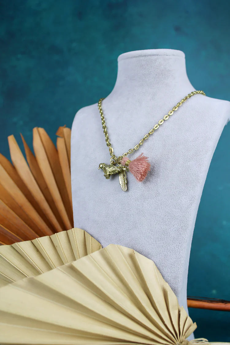 Perfect for layering up these gorgeous little pheasant charm necklaces are the great piece to carry through any season. With a beautiful nude pink tassel, feather and pheasant charm.