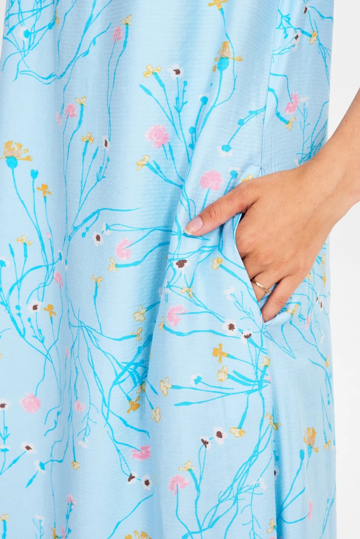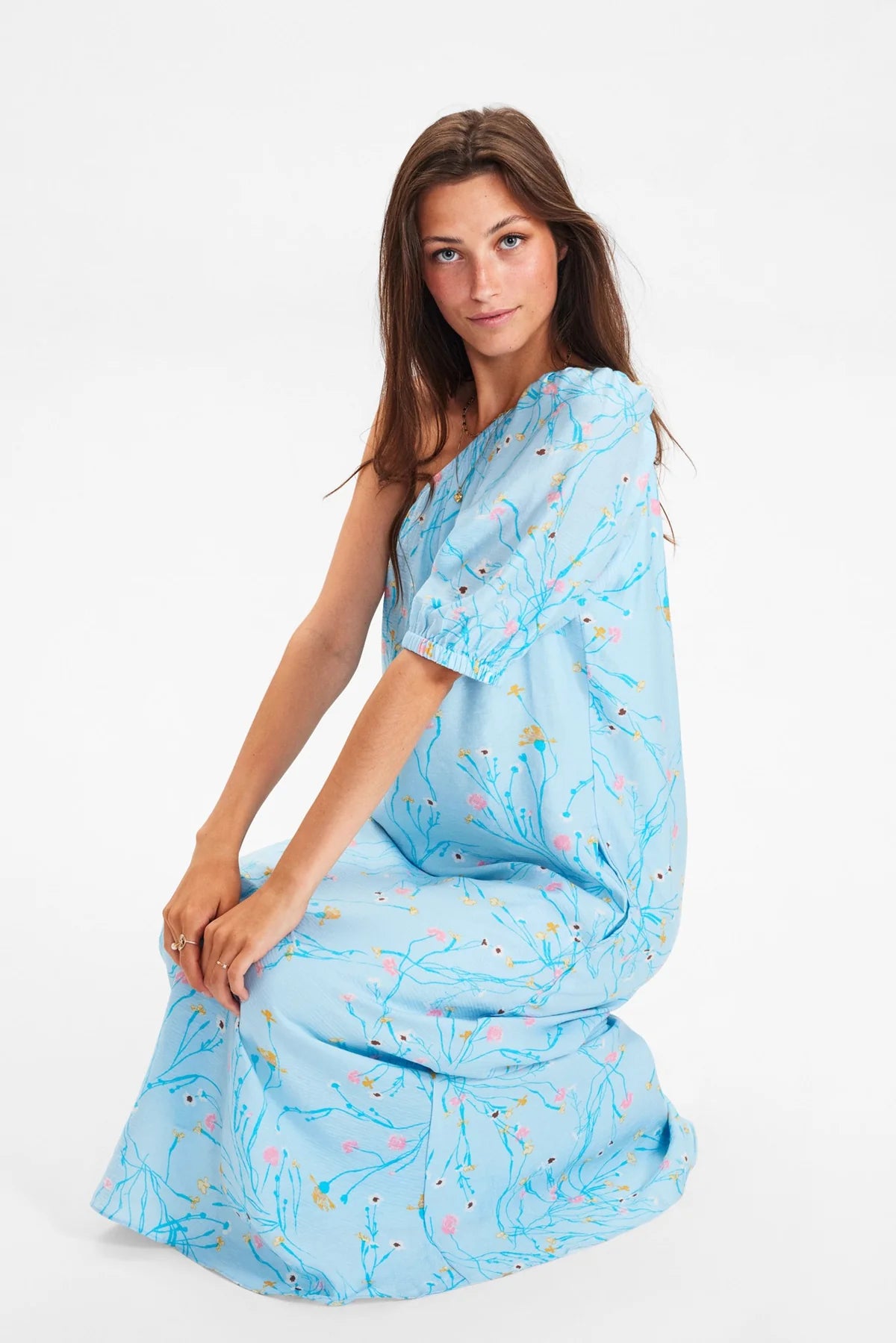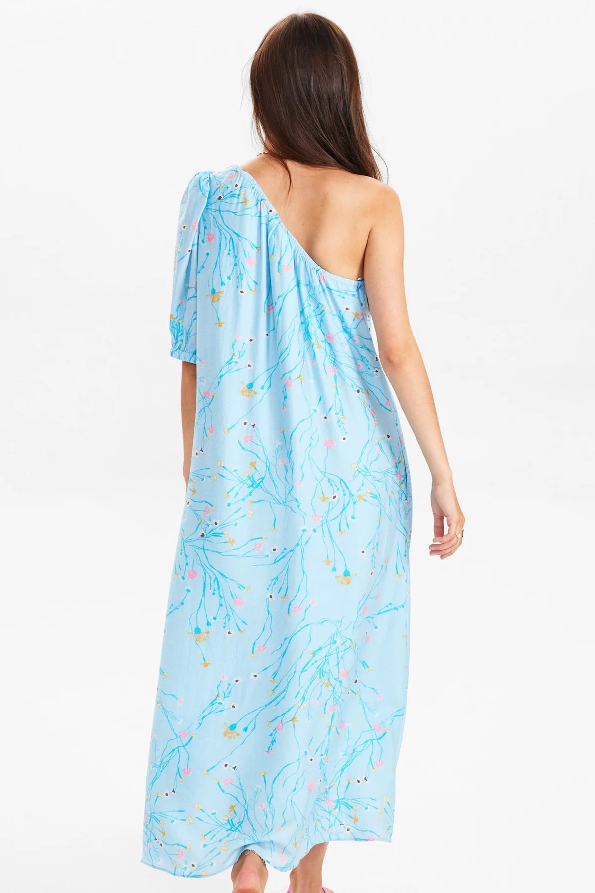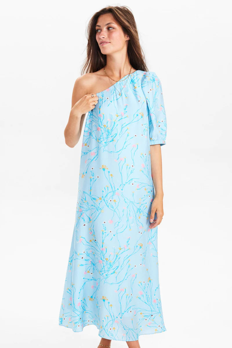 This delicate crystal blue dress has one shoulder for that extra touch of Summer fun. Midi in length, this dress would pair well with trainers, flipflops or an espadrille heel. A relaxed fit make this is particularly comfortable choice on a warmer night. The cross shoulder is elasticated so will suit/fit various sized busts.