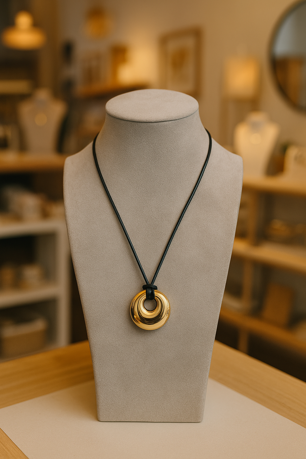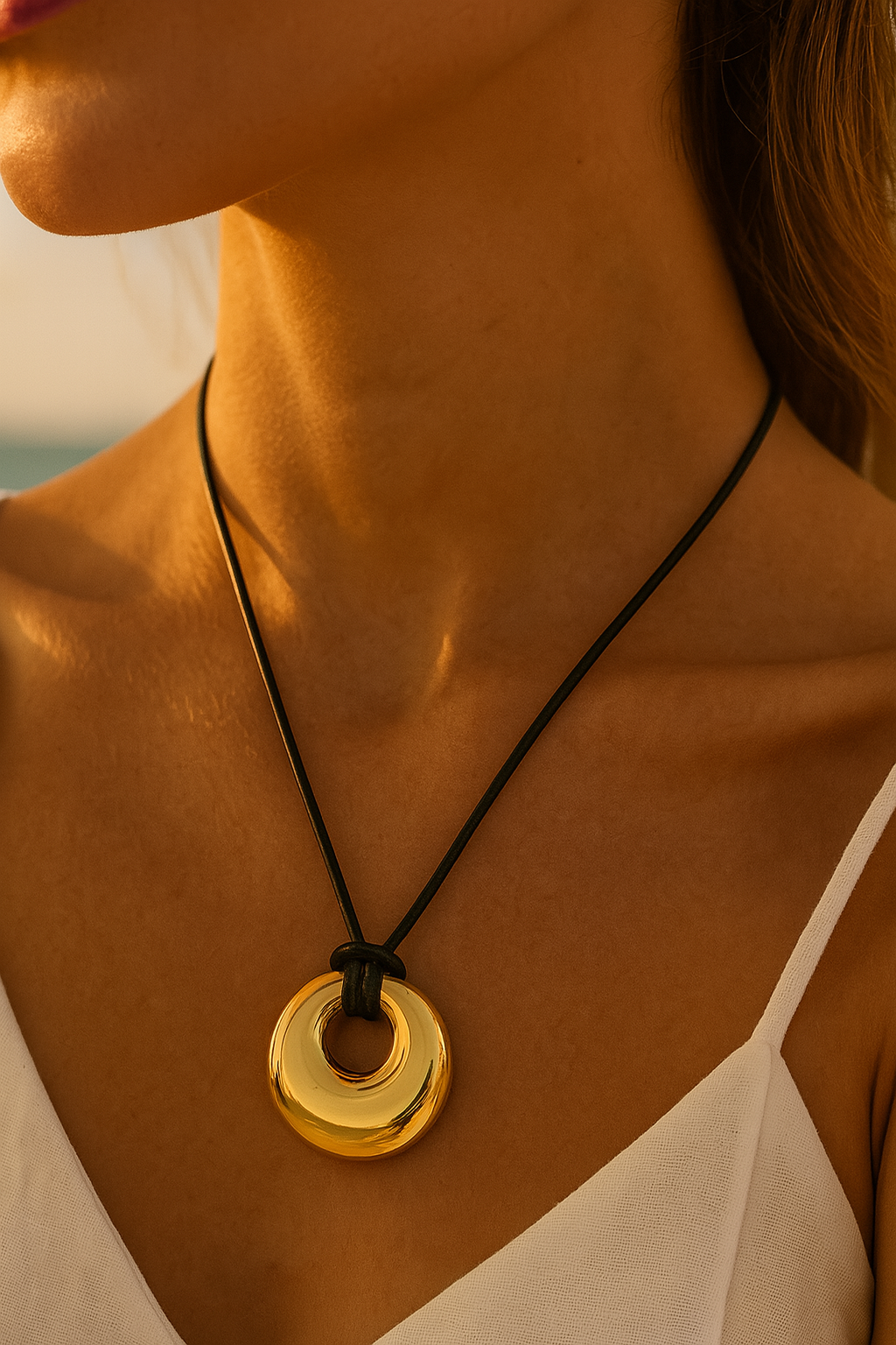 A smooth, circular pendant with a high-polish 18k gold-plated finish, suspended from a black waxed cord. The contrast between the sleek gold and the soft, casual cord makes this piece feel effortless and modern — ideal for layering or wearing solo as a statement of quiet confidence.
