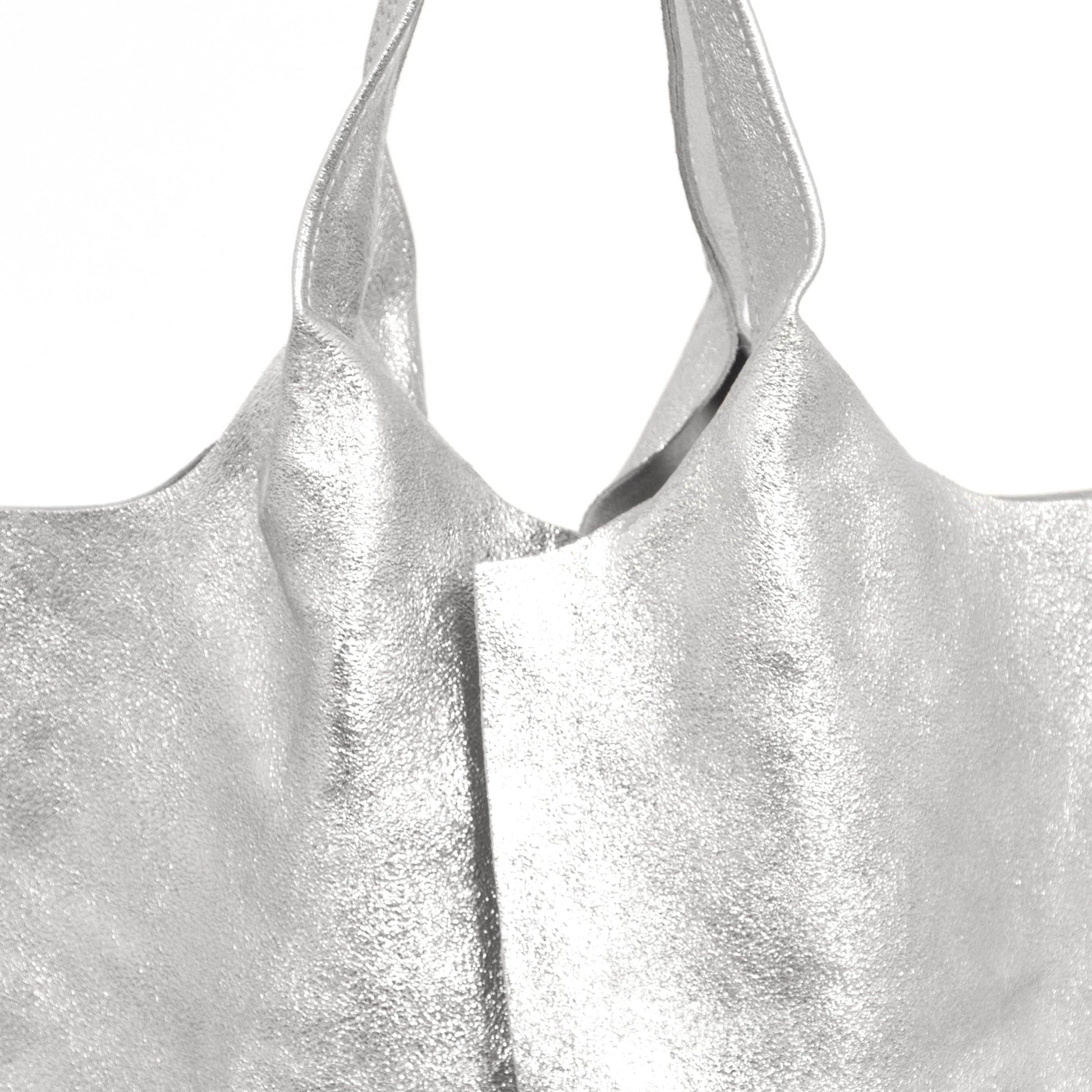 A timeless silver tote bag crafted from soft metallic Italian leather. Featuring a spacious internal compartment with a complimentary zip wallet for convenience. This large shoulder bag is an ideal carry-all.