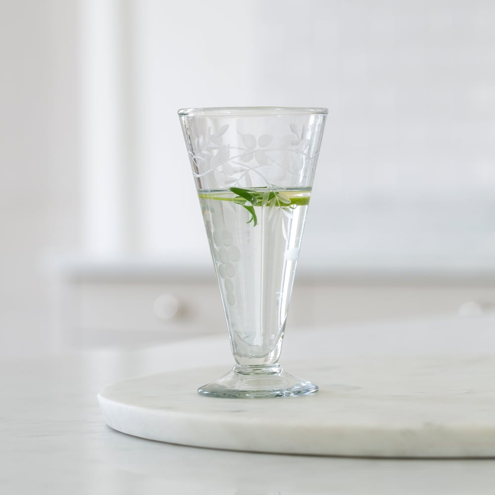 We love the beautiful etching on our Vinage Style Prosecco Coupes which is a signature of our hand-crafted Indian glassware. They bring a certain air of Joie De Vivre to the table and are one of the stars amongst our widely eclectic range of Vintage Glassware. Our glassware is handmade from 100% recycled glass. Dimensions: L: 8cm x H: 14cm