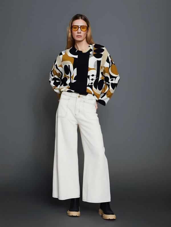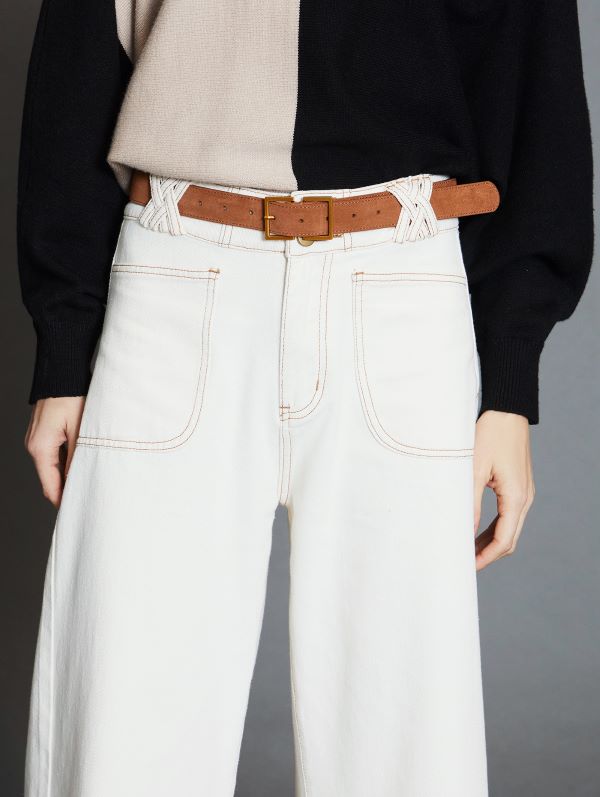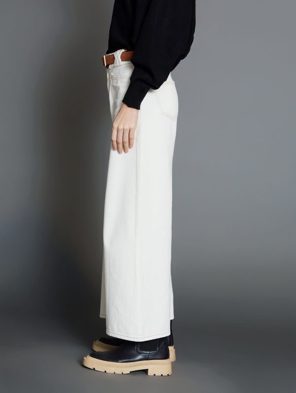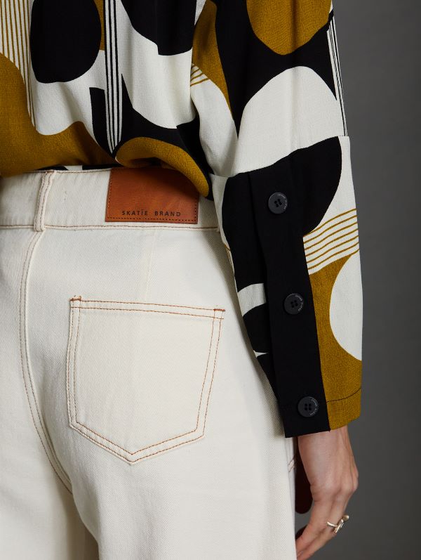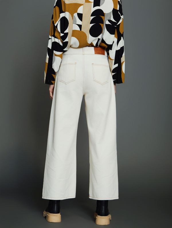 Wide legged, high rise jeans in ivory with ginger contrast stitching. Two deep front pockets and brass buttons around waist.