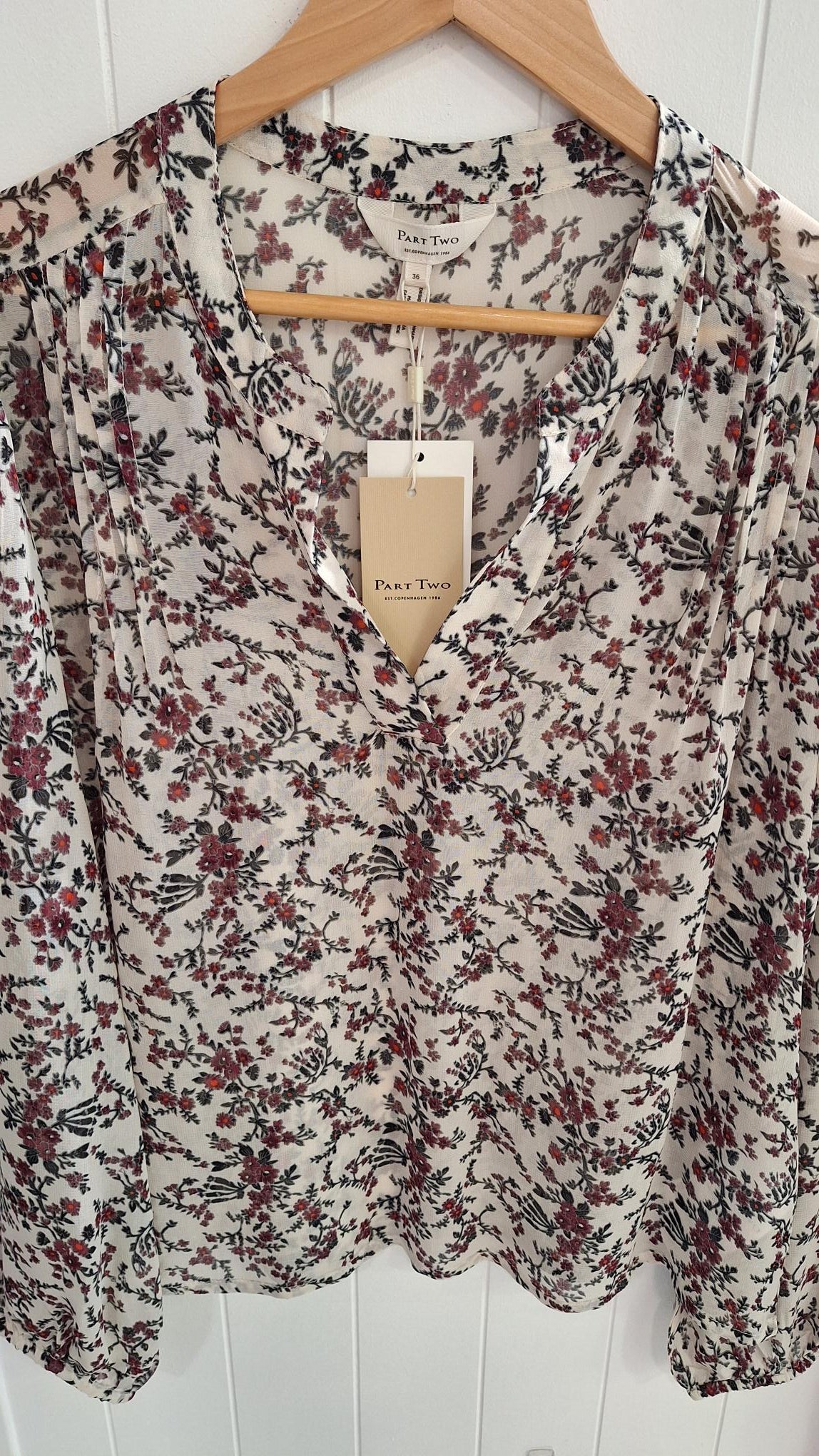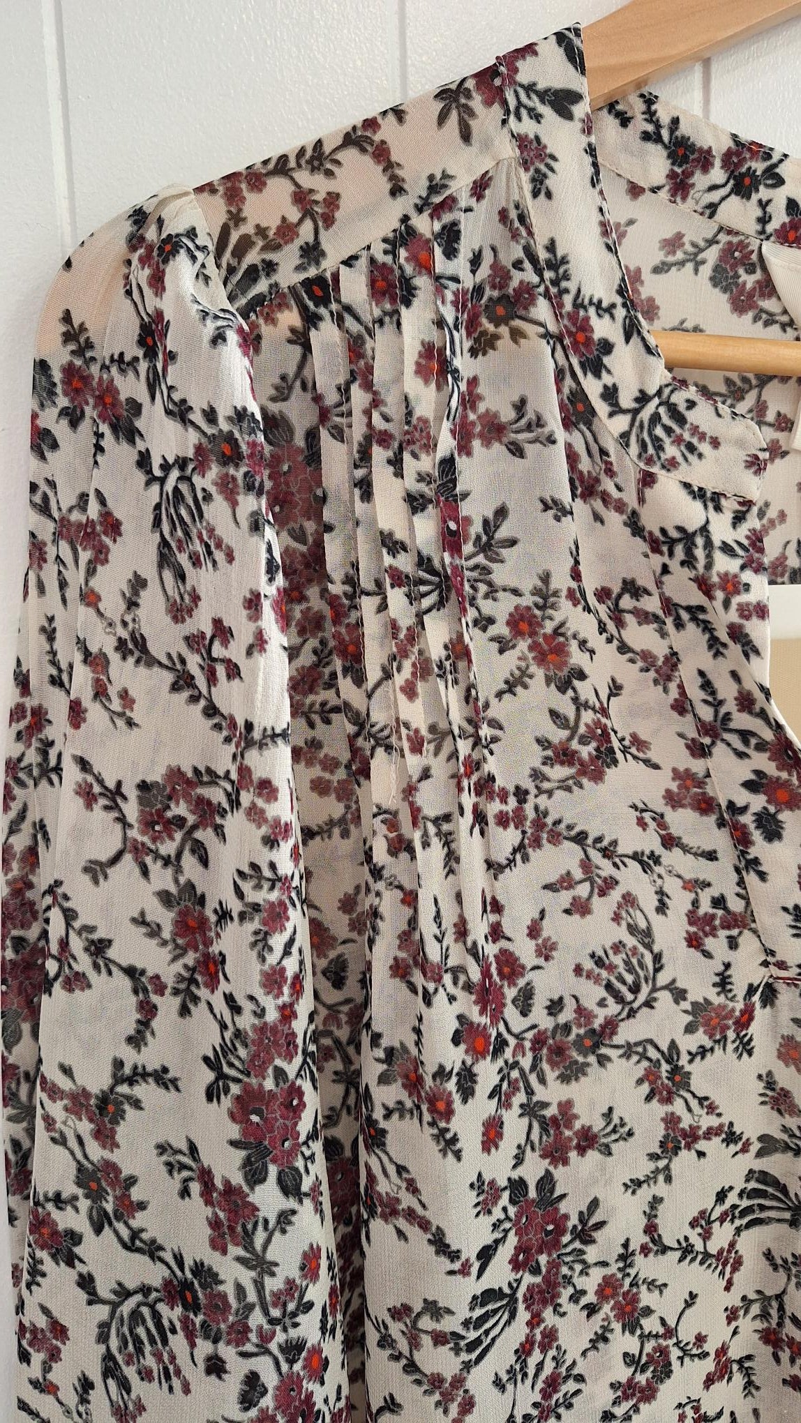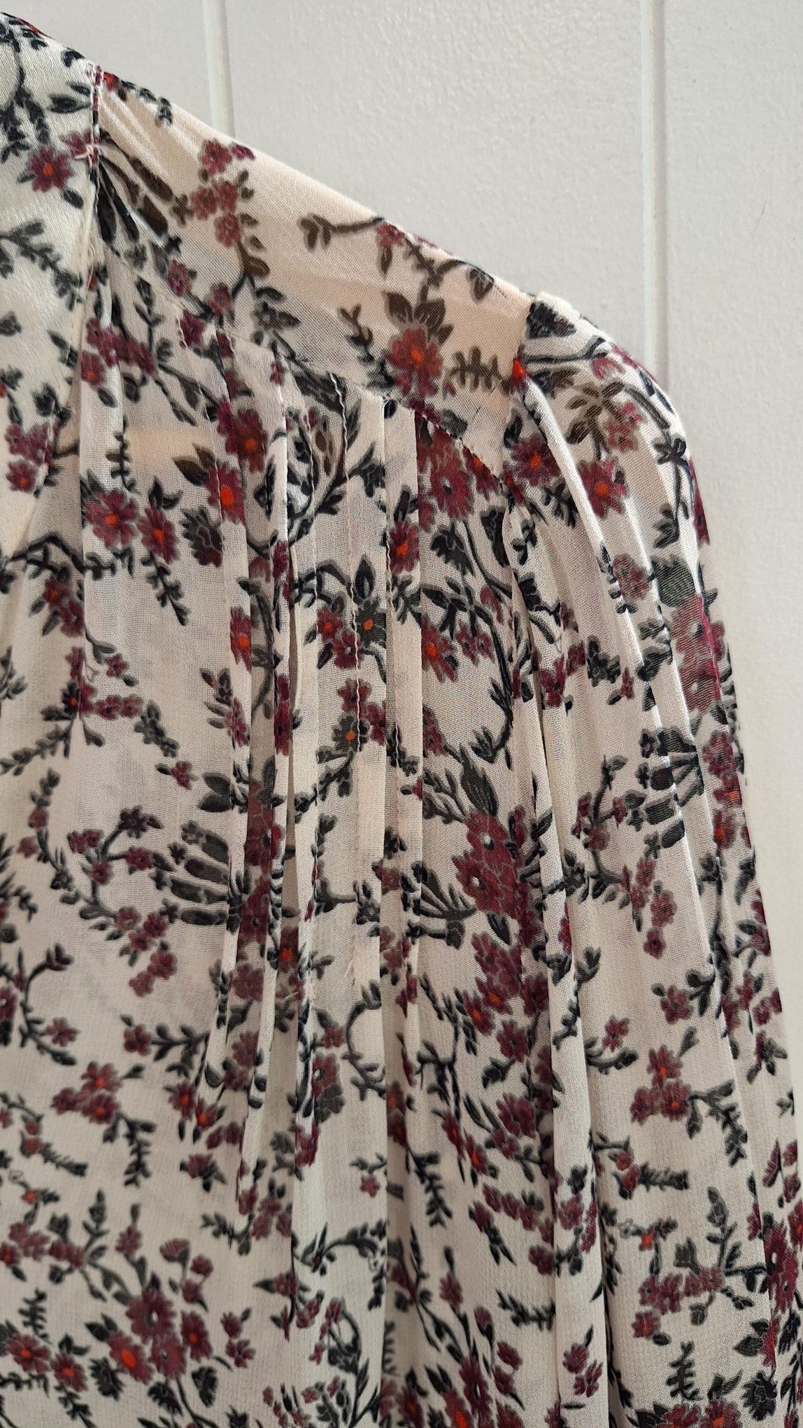 The model is 178 cm tall and wears a size 36. This classic floral shirt features fine pleats at the front, creating an elegant and timeless look. The slightly loose fit and wide sleeves adds a pretty romantic twist, perfect for both everyday wear and formal occasions. Style it with jeans or tailored trousers.